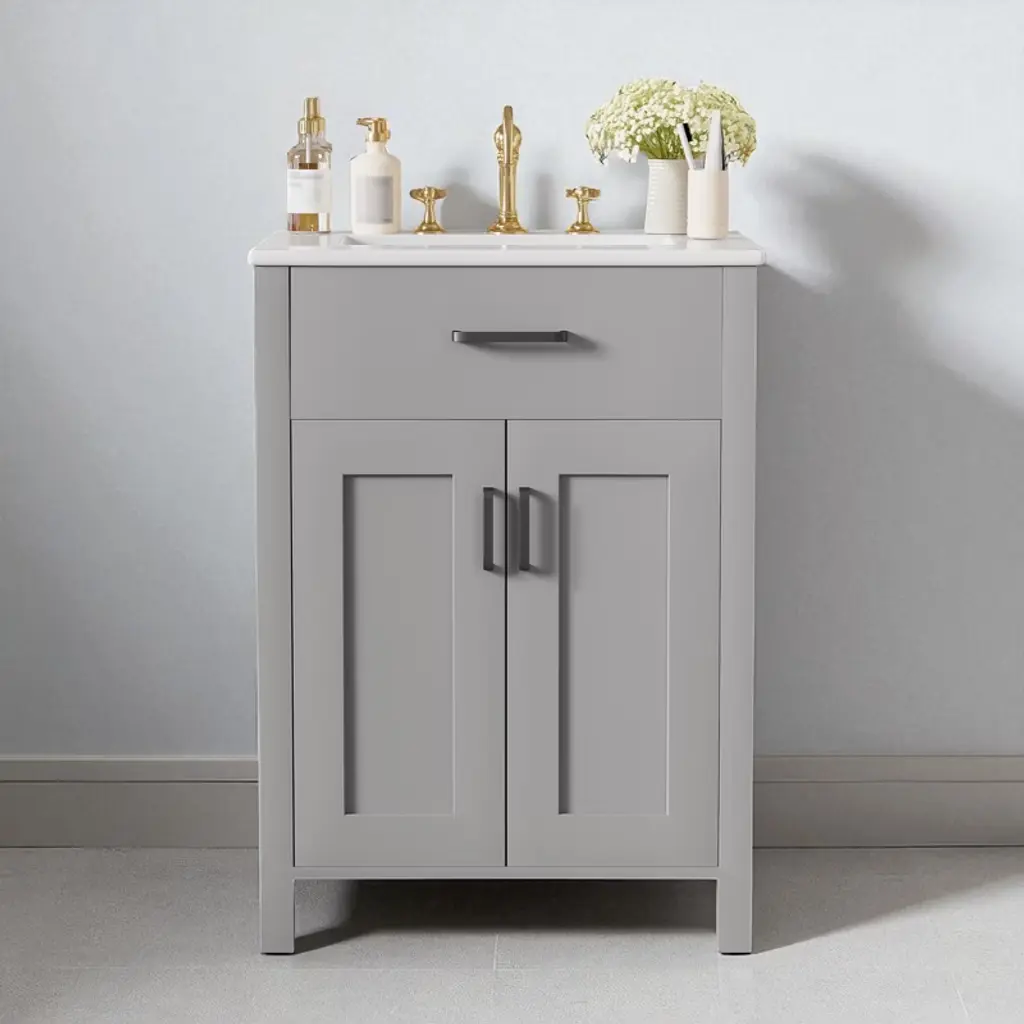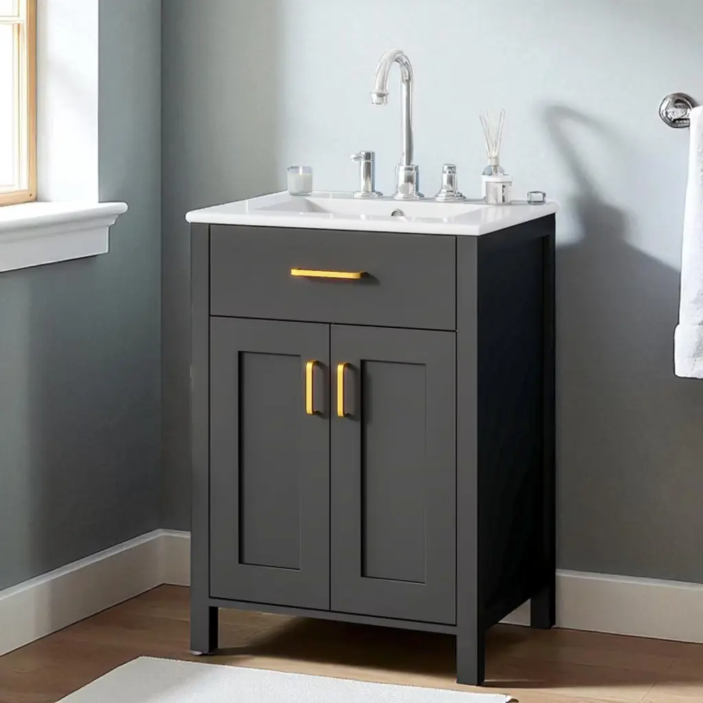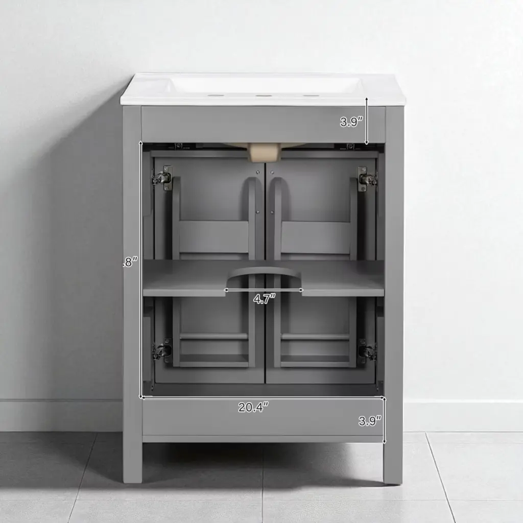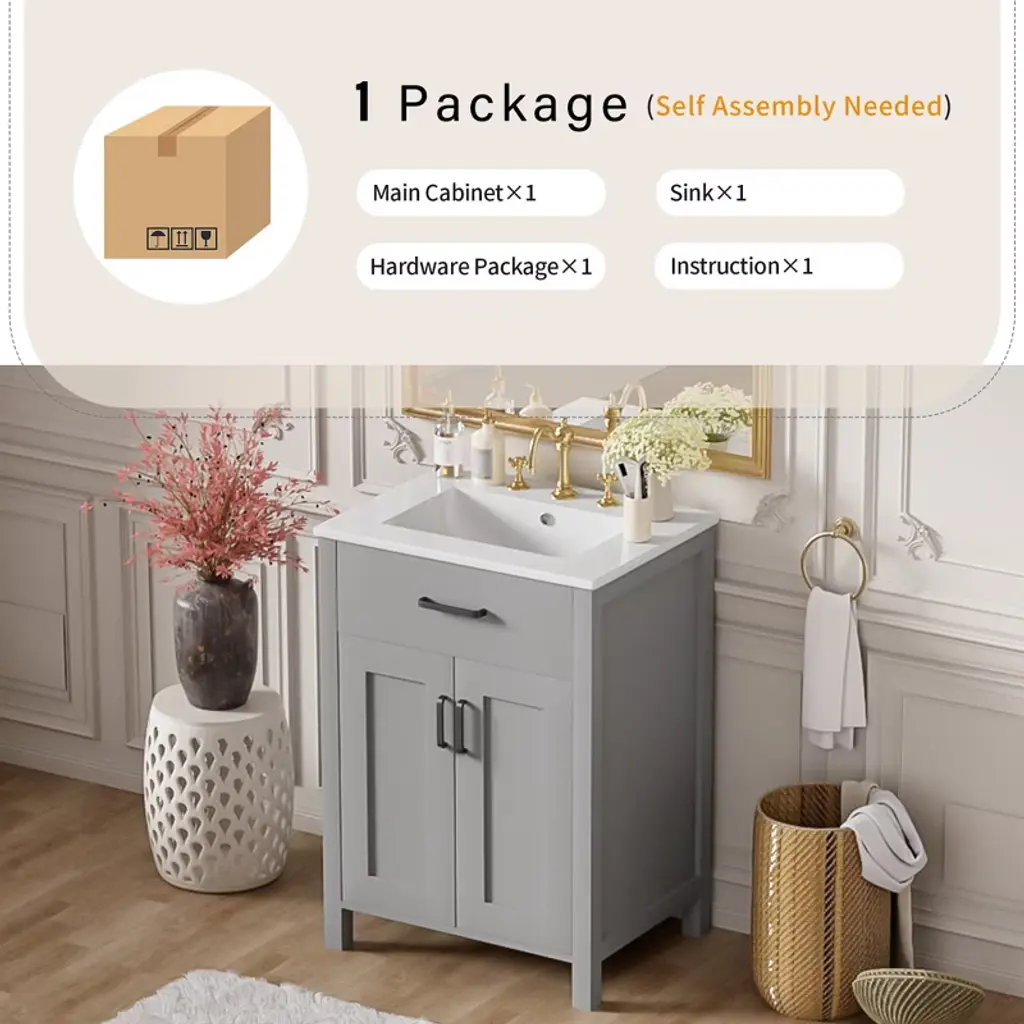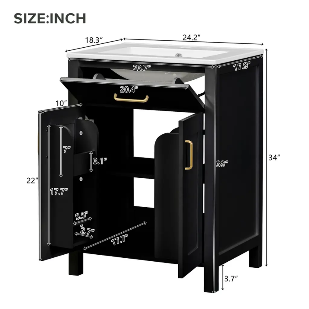 Product Introduction This 24-inch bathroom vanity combines compact design with functional elegance. Built with a solid wood frame and MDF cabinet, it features a ceramic sink and efficient storage solutions that suit smaller bathrooms. Product Features - Space-Saving Size: 24.2"W x 18.3"D x 34"H, perfect for compact bathrooms. - Sturdy Build: Solid wood frame with MDF panels ensures durability and stability. - Elegant Hardware: Golden handles add a touch of sophistication and style. - Practical Sink: Smooth ceramic sink with overflow hole for safe and easy use. - Soft Close Doors: Two soft-close doors with dual-tier shelving for organized storage. - Adjustable Shelf: U-shaped interior shelf allows flexible storage around plumbing. - Classic Style: Modern design blends seamlessly into a variety of bathroom decors. - Easy Assembly: Clear instructions provided; designed for two-person setup. Specifications - Overall Vanity: 24.2"W x 18.3"D x 34"H, 77.6 lbs - Sink: 24.2"W x 18.3"D x 6.7"H, 25.35 lbs - Cabinet: 23.7"W x 17.9"D x 33"H, 52.25 lbs - Weight Capacity: Overall 220 lbs, Shelf 5.5 lbs Note Faucet not included. Backsplash not included. Slight variations in size and color may occur due to lighting and manual measurement. Two-person assembly recommended.