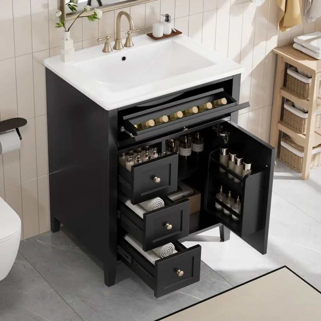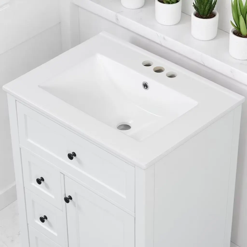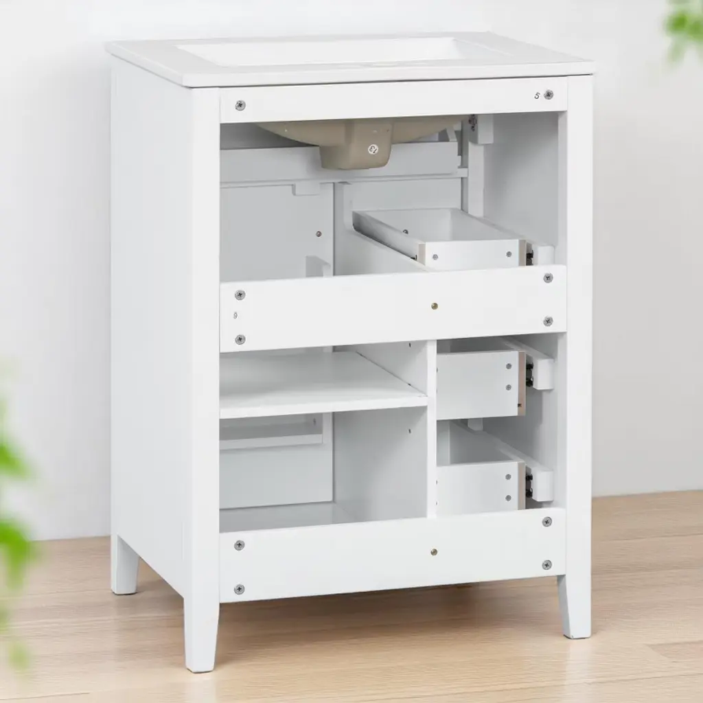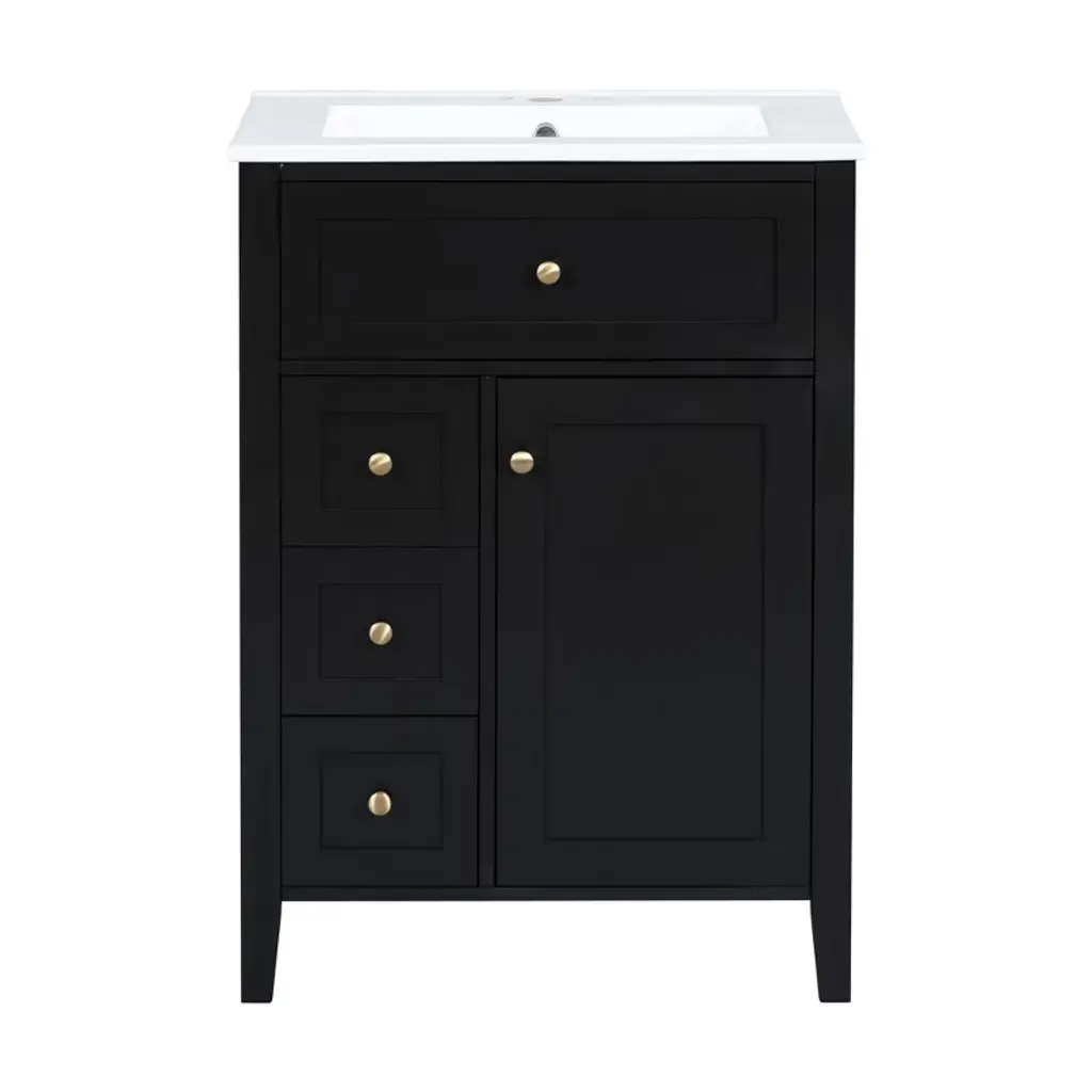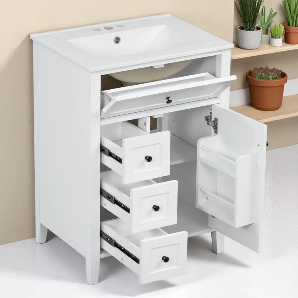 Product OverviewBring style, storage, and practicality to your bathroom with this 24-inch freestanding vanity. Crafted from a durable combination of MDF and solid rubberwood, this vanity is designed to meet your daily needs while complementing a wide range of modern and transitional bathroom décors. Its compact footprint is ideal for small to medium-sized bathrooms, offering generous storage without sacrificing floor space. The sleek glossy white finish and modern black knobs give it a clean and sophisticated appearance, while the integrated sink and thoughtful layout make everyday use more convenient.Product FeaturesSpacious Storage with Adjustable Options: Features three left-side drawers and a right-side cabinet with adjustable shelving to store toiletries, towels, and more, helping to keep your bathroom organized and clutter-free.Durable Construction: Made with high-quality MDF panels and solid rubberwood legs for reliable strength and stability in high-moisture bathroom environments.Modern Glossy Finish: The painted white finish resists everyday wear and is easy to clean, while the contrasting black knobs add a stylish accent to the overall design.Compact and Functional: At just 24"" wide, this vanity is ideal for small bathrooms or powder rooms, maximizing utility in limited spaces.Heavy-Duty Capacity: Built to support up to 150 lbs, this vanity easily accommodates your daily essentials with dependable performance.SpecificationsOverall Dimensions: 24""L x 18.3""W x 33.9""HCabinet Base: 23.8""L x 18.1""W x 33.2""HSink Top: 24""L x 18.3""W x 4.7""HTotal Weight: 84.44 lbs (Cabinet: 60.44 lbs, Sink: 24 lbs)Color: WhiteMaterial: MDF Board + Solid Rubberwood + CeramicMounting Type: FreestandingSink Type: Undermount / Drop-InSink Edge Thickness: 0.7""Sink Location: CenterFaucet Mount: 4"" Centerset (faucet not included)Number of Doors: 1Number of Drawers: 4Capacity: 150 lbsHardware Included: Yes (Zinc alloy knobs)Assembly Required: YesCountry of Origin: VimSuitable ScenariosPerfect for small bathrooms, powder rooms, and guest bathsComplements modern, transitional, and minimalist décor stylesIdeal for apartment upgrades or bathroom remodelsNotesFaucet and drain not included.Color and measurements may vary slightly due to lighting and manual measurement.Assembly required; instructions and hardware included.