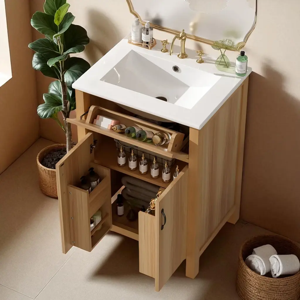 Product Overview This 24-inch bathroom vanity blends modern function with timeless wood design. Built with a solid wood frame and MDF body, it includes a ceramic sink, flip drawer, dual soft-close doors with built-in racks, and an adjustable U-shaped shelf, offering compact yet versatile storage for any bathroom. Specifications Product Type: Bathroom Vanity Style: Transitional Mounting Type: Free-standing Cabinet Color: Acacia Wood Sink Material: Ceramic Cabinet Material: Solid Wood + MDF Handle Material: Zinc Alloy Finish Type: Melamine Finish Sink Type: Undermount / Drop-in Sink Shape: Rectangular Faucet Mount: 8" Widespread (not included) Overflow Hole: Yes Vanity Top Edge Type: Flat (0.8" Thickness) Number of Doors: 2 Number of Drawers: 1 (Flip Drawer) Soft-Close Hinges: Yes Assembly: Required Use Case: Bathroom Product Features ✔ Balanced Size – 24"W x 18.3"D x 34.06"H, compact yet practical for everyday use. ✔ Easy-Clean Ceramic Sink – Glossy rectangular sink resists stains and water spots for a fresh, tidy bathroom. ✔ Overflow Protection – Integrated overflow hole keeps the space dry and comfortable. ✔ Soft-Close Doors – Prevents slamming for a quieter, more peaceful environment. ✔ Door-Mounted Storage Racks – Double-layer racks on both doors add convenient storage for small essentials. ✔ Adjustable U-Shaped Shelf – Flexible shelf design maximizes storage around plumbing fixtures. ✔ Stability & Protection – Plastic adjustable feet ensure stability on uneven floors while preventing moisture damage. ✔ Durable Build – Solid wood frame + MDF body provide strength, style, and long-lasting use. ✔ Elegant Black Handles – Adds a modern luxury accent to the natural wood finish. ✔ Simple DIY Assembly – Clear instructions included; 2-person assembly recommended. Product Dimensions Overall Vanity: 24"W x 18.3"D x 34.06"H (72.75 lbs) Sink: 24"W x 18.3"D x 6.8"H (26.46 lbs) Vanity Base: 23.23"W x 17.91"D x 33.26"H (46.29 lbs) Weight Capacity: Shelf 20 lbs / Drawer 50 lbs / Overall 150 lbs Suitable Scenarios Perfect for small to medium bathrooms, guest baths, or powder rooms. Its compact size and efficient storage make it ideal for apartments, condos, or modern homes. Notes 1. Real product color may vary slightly due to lighting or monitor display. 2. Manual measurement used; slight deviations may occur. Why Choose This ✔ Compact size with maximum storage ✔ Door racks + flip drawer for smart organization ✔ Solid wood frame ensures long-term durability ✔ Elegant design blends transitional and modern styles ✔ Easy assembly and moisture-resistant construction Descriptions Upgrade your bathroom with this 24" acacia wood vanity, featuring a solid wood frame, ceramic sink, one flip drawer, and two soft-close doors with door-mounted racks. The U-shaped adjustable shelf accommodates plumbing while maximizing storage. Finished with elegant black handles and moisture-resistant adjustable feet, this vanity combines timeless wood-grain beauty with everyday practicality, making it the perfect choice for stylish and functional bathroom design.