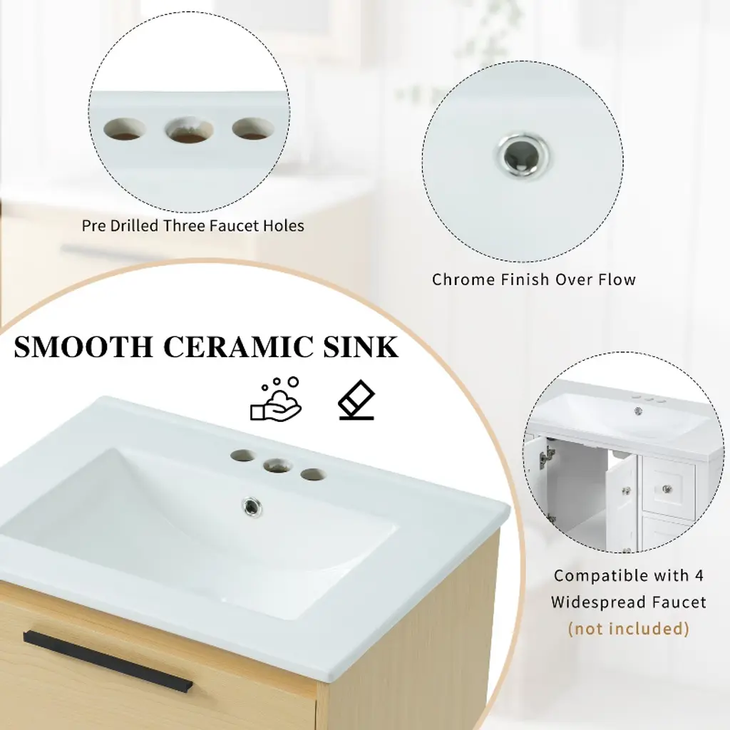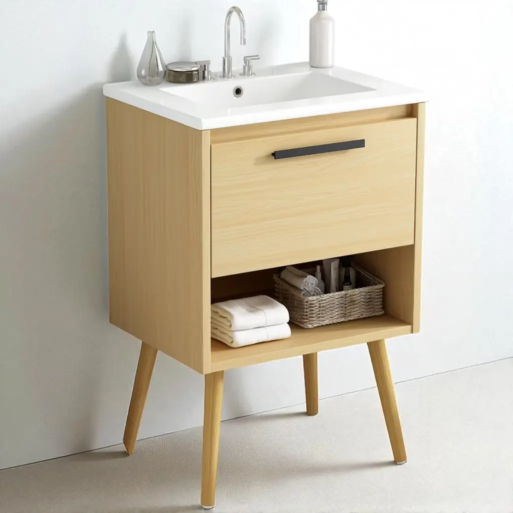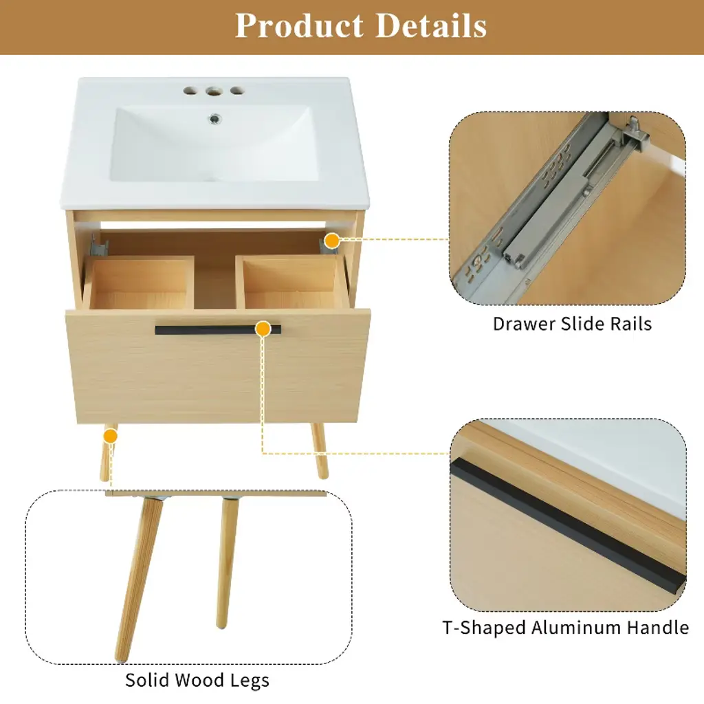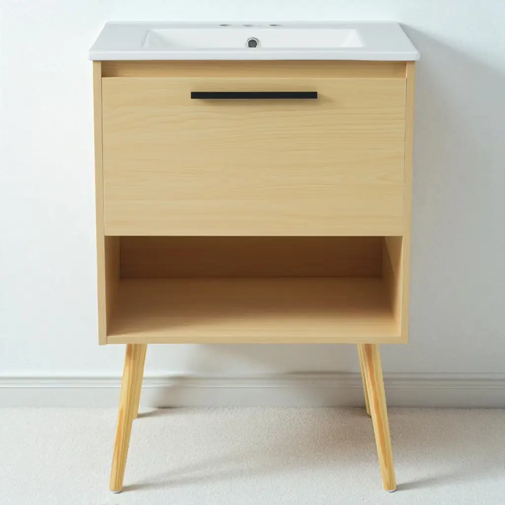 Product Overview:Bring warmth and functionality to your bathroom with this 24-inch freestanding vanity. Featuring a natural wood finish and compact modern design, this vanity is crafted with a durable ceramic sink, solid wood legs, and high-quality MDF cabinet. The drawer and open storage shelf offer convenient access to your daily essentials, making it perfect for small bathrooms or powder rooms.Product Features:Smooth Ceramic Sink: The included rectangular sink is made of solid ceramic with a smooth, water-resistant finish that's easy to maintain. Pre-drilled with three holes, it supports a 4"" centerset faucet (not included) and includes an overflow ring for added protection.Durable Materials: Built with a combination of solid pine wood legs and sturdy MDF boards, this vanity ensures stability and long-term performance. The painted finish is moisture-resistant and ideal for humid bathroom environments.Functional Storage: The single drawer features slide rails and a smart internal layout that separates storage spaces of various sizes. An open shelf beneath the drawer offers additional storage for items like towels, baskets, or toiletries.Natural Look: The light wood tone and minimalist design bring a calming, eco-friendly vibe to your bathroom, blending seamlessly with modern, Scandinavian, or transitional décor styles.Simple Assembly: This vanity ships in one box and includes all necessary hardware and an instruction manual for easy setup.Specifications:Overall Dimensions: 24"" L x 18"" W x 33.4"" HMaterial: Solid Wood Legs, MDF Cabinet, Ceramic SinkSink Type: Undermount; Drop-InSink Location: CenterFaucet Mount: 4"" Centerset (not included)Number of Drawers: 1Open Storage Shelf: YesFinish: PaintedColor: Natural WoodMounting Type: FreestandingWeight Capacity: 11 lbs per drawer, 100 lbs totalHardware Included: YesAssembly Required: YesCountry of Origin: MalaysiaSuitable Scenarios:Ideal for compact bathrooms, powder rooms, guest baths, or rental units, this vanity maximizes storage without sacrificing style. The natural finish works beautifully in minimalist, boho, and modern interiors.Notes:Faucet and drain are not included. Please follow the included instruction manual for assembly. Color variations may occur due to lighting or monitor differences.