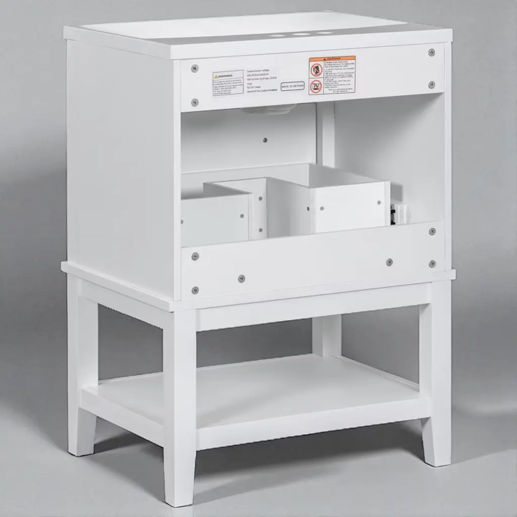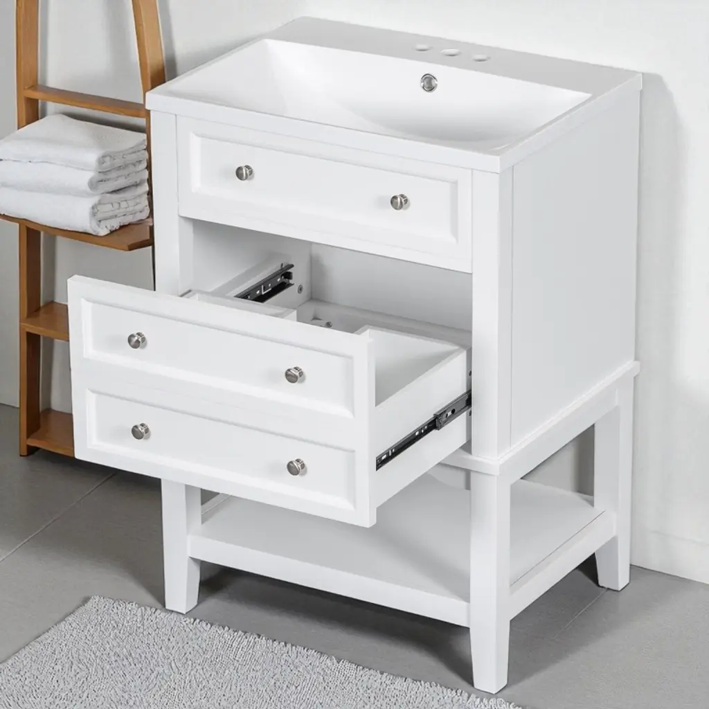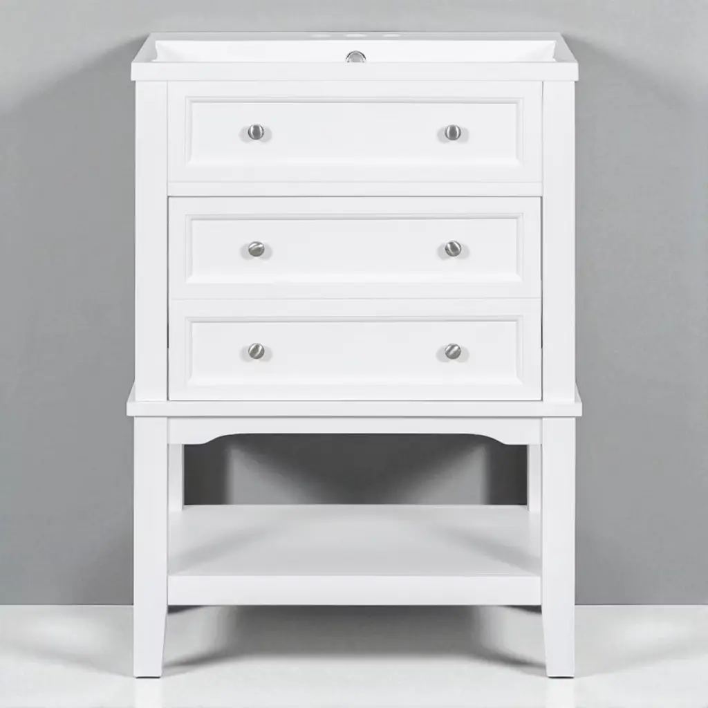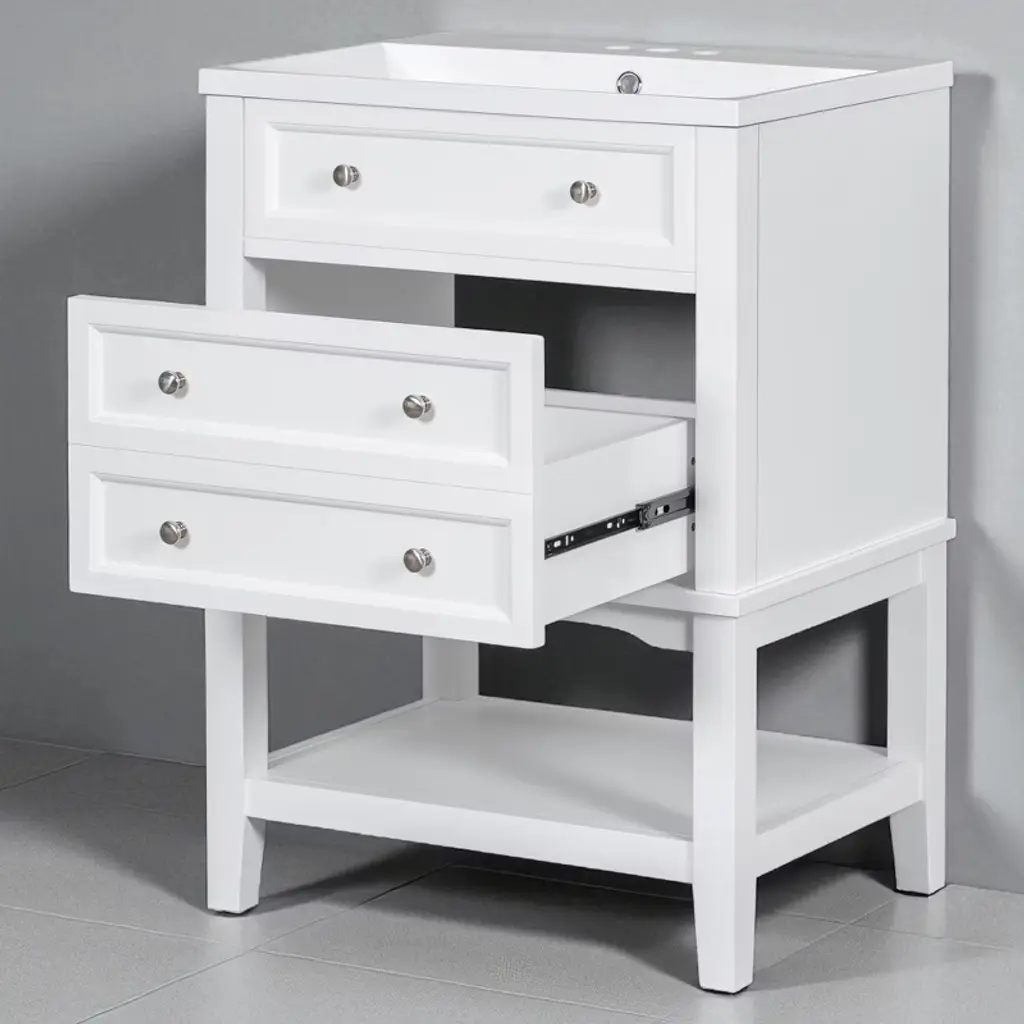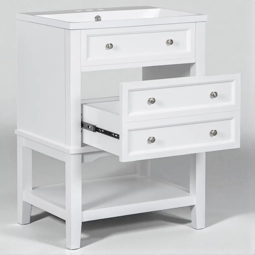 Product Overview:Upgrade your bathroom with this 24"" freestanding bathroom vanity, a stylish and compact solution that blends function with contemporary design. Crafted with a solid wood frame and MDF board, this white vanity features a ceramic sink, one drawer, and a spacious open shelf for convenient storage. Its clean lines and silver knobs make it a perfect fit for modern homes.Product Features:High-Quality Material: Constructed from a durable solid wood frame and water-resistant MDF boards, this vanity is built to last in humid environments. Metal slide rails ensure smooth drawer operation, while zinc alloy silver knobs offer a high-end feel and reliable durability.Elegant Ceramic Sink: The white ceramic sink features a smooth, glossy finish that resists water stains and is easy to clean. It includes an overflow and is pre-drilled for a 4"" centerset faucet (not included). The half-moon shape maximizes the usable basin space.Ample Storage: A lower drawer (decorative top panel) and open shelf provide smart storage options for keeping your bathroom organized. Store towels, shampoos, toiletries, and more within easy reach but neatly tucked away.Contemporary Style: With a clean white finish, tapered feet, and grooved drawer detailing, this vanity adds a touch of modern elegance to your space. The compact size is ideal for smaller bathrooms without compromising on functionality or style.Easy Assembly: This vanity comes in one package with a complete set of hardware and a detailed instruction manual. All parts are clearly labeled, making assembly simple and straightforward.Specifications:Product Dimensions: 24"" L x 18.1"" W x 33"" HMaterial: Solid Poplar/Rubber Wood & MDF Board & CeramicFinish: White Painted FinishMounting Type: FreestandingSink Type: Undermount or Drop-In (included)Sink Location: CenterSink Depth: 4.7""Edge Thickness: 0.7""Faucet Mount: 4"" Centerset (not included)Number of Drawers: 1 (top drawer decorative)Leg Style: Tapered FeetCapacity: 200 lbsAssembly Required: YesCountry of Origin: VietnamCertification: CARB P2Suitable Scenarios:Perfect for powder rooms, guest baths, or small modern bathrooms where style and smart storage matter. Its minimalist white finish fits easily with various décor styles, from coastal to contemporary.Notes:Faucet is not included. Please follow the included instructions for safe and proper assembly. Product color may vary slightly due to lighting or screen settings.