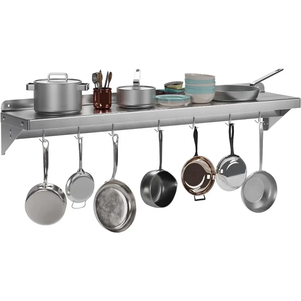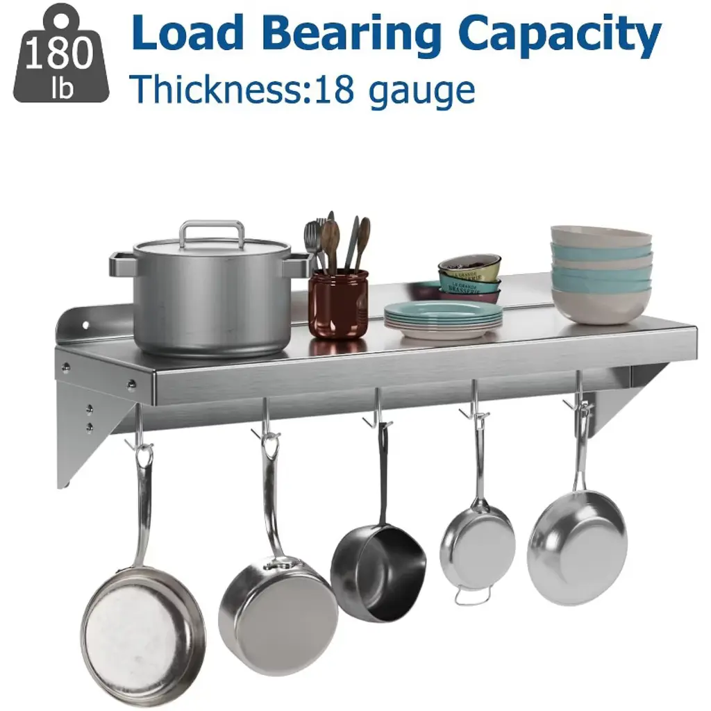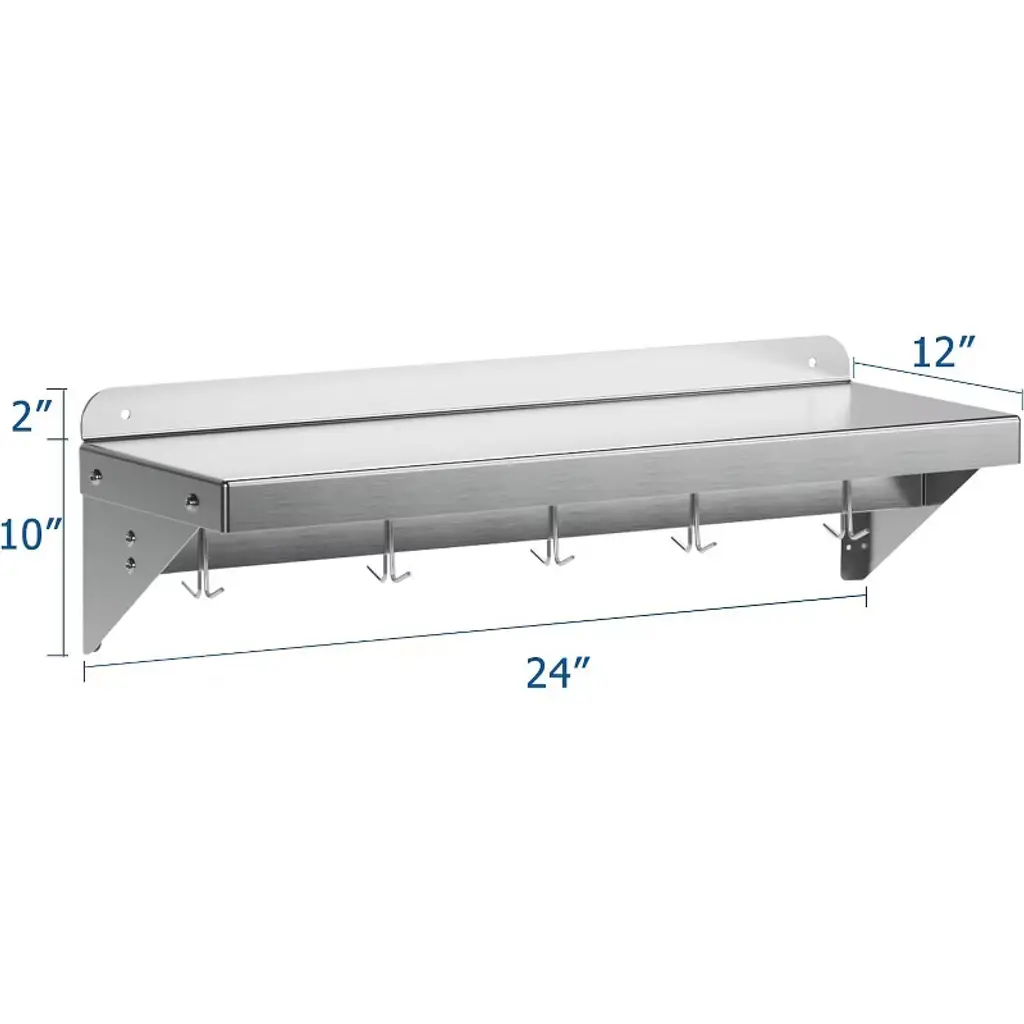 Introducing the Stainless Steel Shelf, NSF Commercial Shelf Wall Mounted – the ultimate storage solution for your restaurant, kitchen, home, or hotel. This versatile wall shelf is designed to enhance your space with its sleek, functional design and superior durability. Heavy-Duty Support: Crafted from premium stainless steel, this floating shelf offers robust support, ensuring your kitchen essentials are securely stored. Whether it's pots, pans, or other cookware, this shelf is built to hold it all. Efficient Space Utilization: Measuring 24 x 12 inches, this flat surface shelf provides ample storage space, optimizing your kitchen organization. With its compact design, it efficiently utilizes wall space, freeing up valuable counter and cabinet areas. Enhanced Organization: Equipped with 7 sturdy hooks, this wall-mounted shelf allows for easy access and efficient storage of your kitchen tools, keeping your space clutter-free and organized. Superior Material Quality: Made from high-quality stainless steel, this shelf is not only durable but also resistant to rust and corrosion, ensuring long-lasting use in any environment. Versatile Application: Perfect for a variety of settings, this wall shelf is ideal for use in restaurants, kitchens, homes, hotels, and even garages. Its versatile design makes it a practical storage solution for any space. Easy Installation: Designed for hassle-free setup, this stainless steel wall shelf comes with all the necessary hardware for quick and convenient installation. Simply mount it on your desired wall and start organizing. Upgrade your storage solutions with this stainless steel floating shelf. Whether you're looking for a kitchen shelf, garage storage, or a stylish wall mount, this shelf meets all your needs with elegance and efficiency. Transform your space with this reliable and stylish storage rack today!