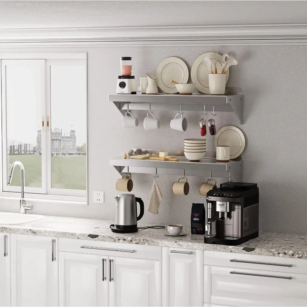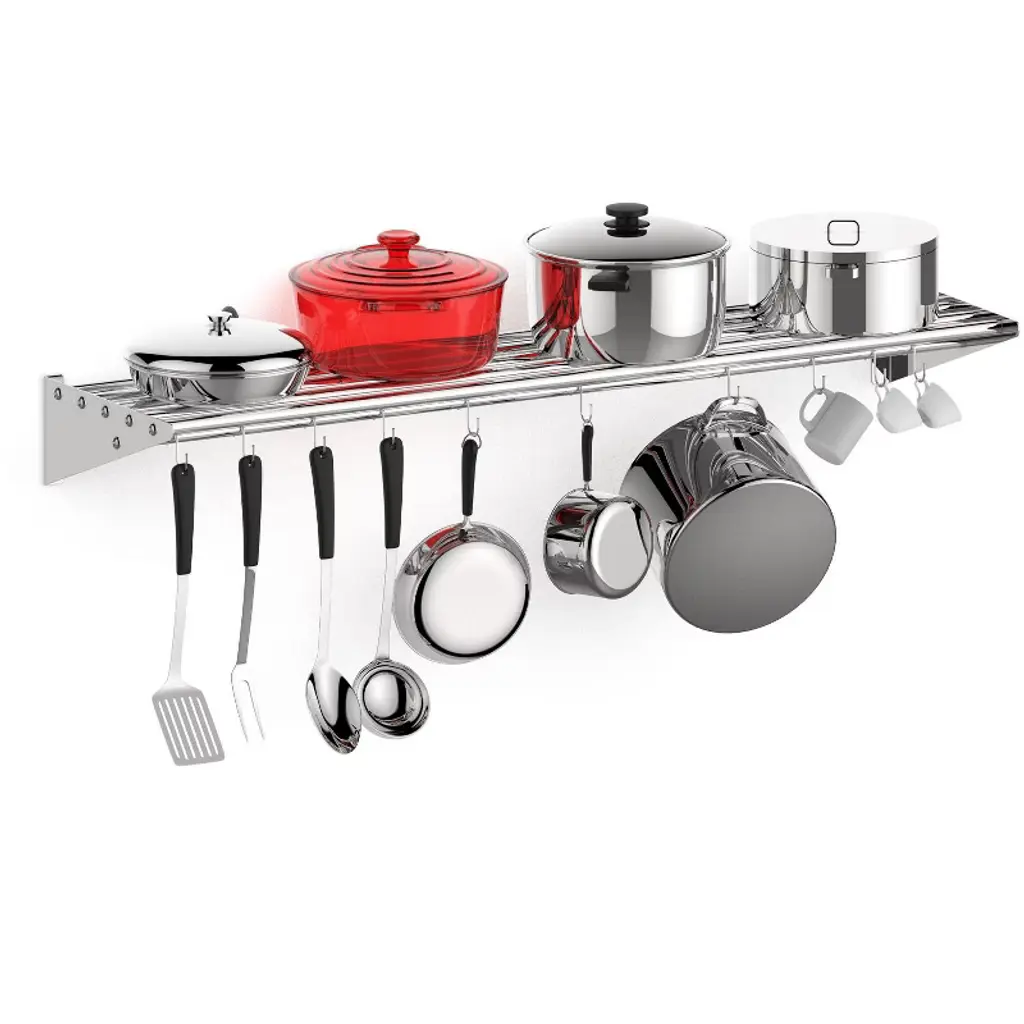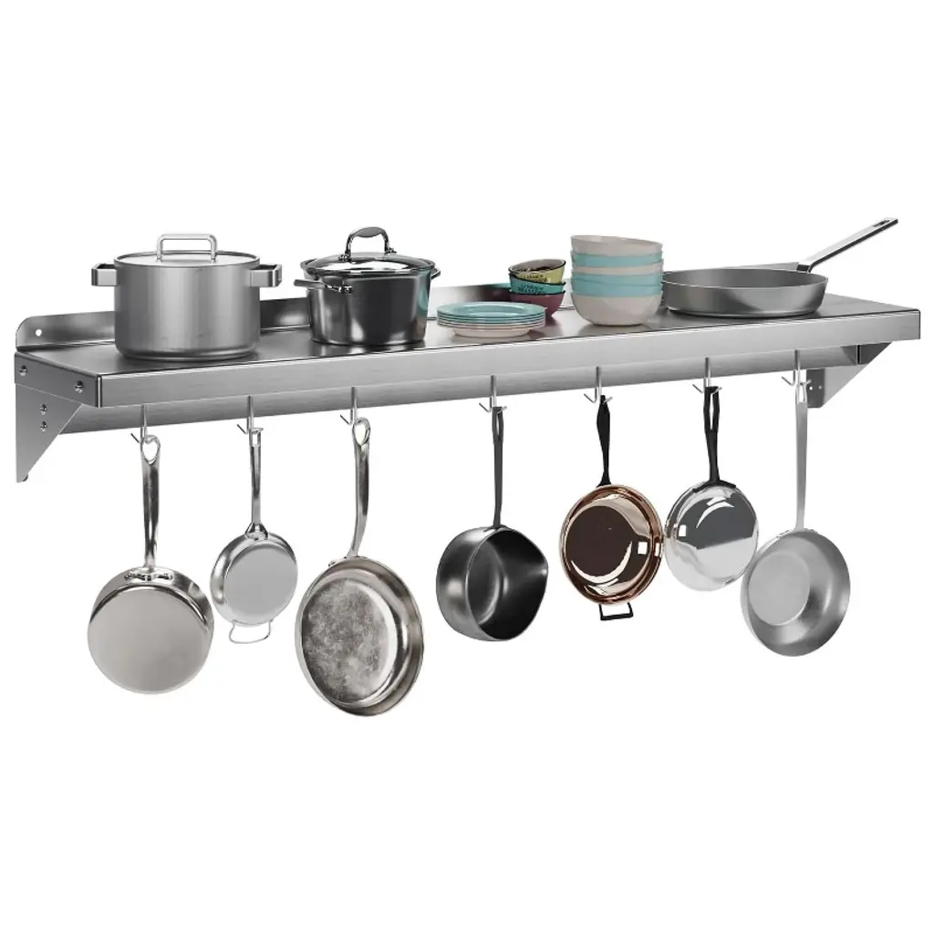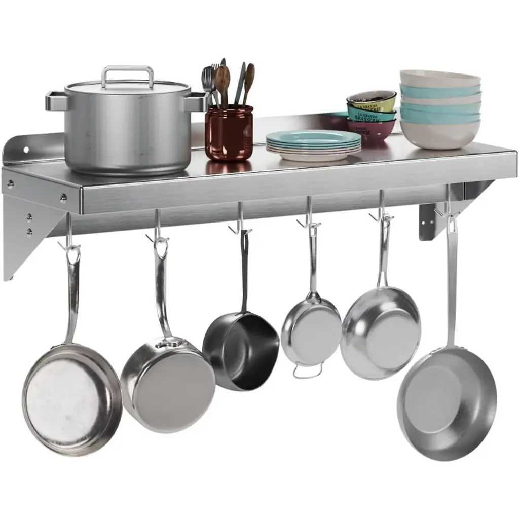 Introducing the Stainless Steel Shelf, NSF Commercial Shelf Wall Mounted – the ultimate storage solution for your restaurant, kitchen, home, or hotel. This versatile wall shelf is designed to enhance your space with its sleek, functional design and superior durability. Heavy-Duty Support: Crafted from premium stainless steel, this floating shelf offers robust support, ensuring your kitchen essentials are securely stored. Whether it's pots, pans, or other cookware, this shelf is built to hold it all. Efficient Space Utilization: Measuring 24 x 12 inches, this flat surface shelf provides ample storage space, optimizing your kitchen organization. With its compact design, it efficiently utilizes wall space, freeing up valuable counter and cabinet areas. Enhanced Organization: Equipped with 7 sturdy hooks, this wall-mounted shelf allows for easy access and efficient storage of your kitchen tools, keeping your space clutter-free and organized. Superior Material Quality: Made from high-quality stainless steel, this shelf is not only durable but also resistant to rust and corrosion, ensuring long-lasting use in any environment. Versatile Application: Perfect for a variety of settings, this wall shelf is ideal for use in restaurants, kitchens, homes, hotels, and even garages. Its versatile design makes it a practical storage solution for any space. Easy Installation: Designed for hassle-free setup, this stainless steel wall shelf comes with all the necessary hardware for quick and convenient installation. Simply mount it on your desired wall and start organizing. Upgrade your storage solutions with this stainless steel floating shelf. Whether you're looking for a kitchen shelf, garage storage, or a stylish wall mount, this shelf meets all your needs with elegance and efficiency. Transform your space with this reliable and stylish storage rack today!