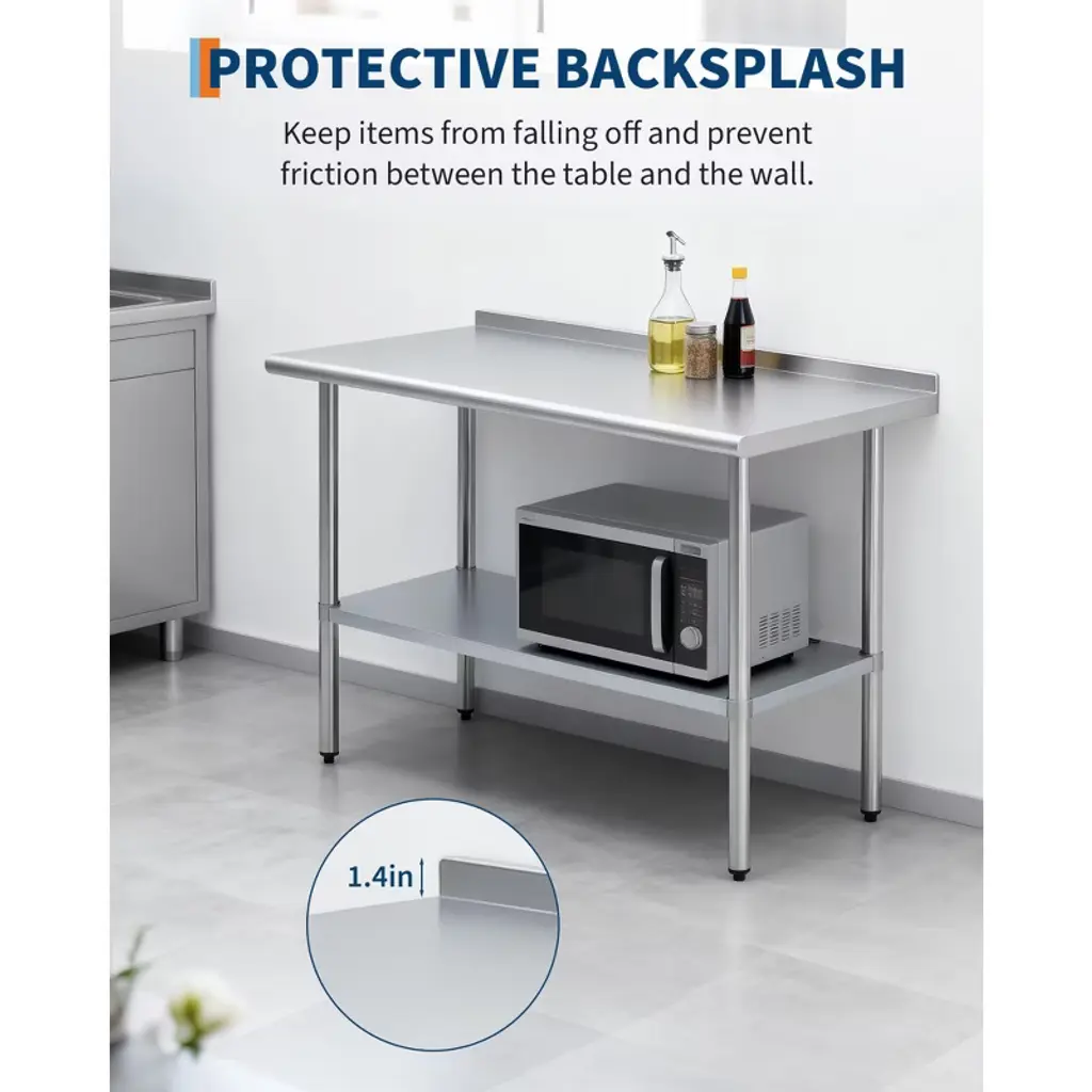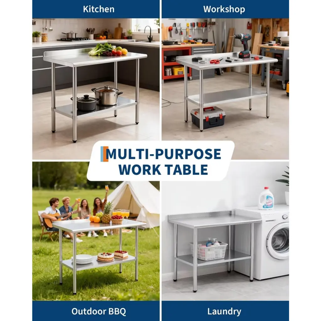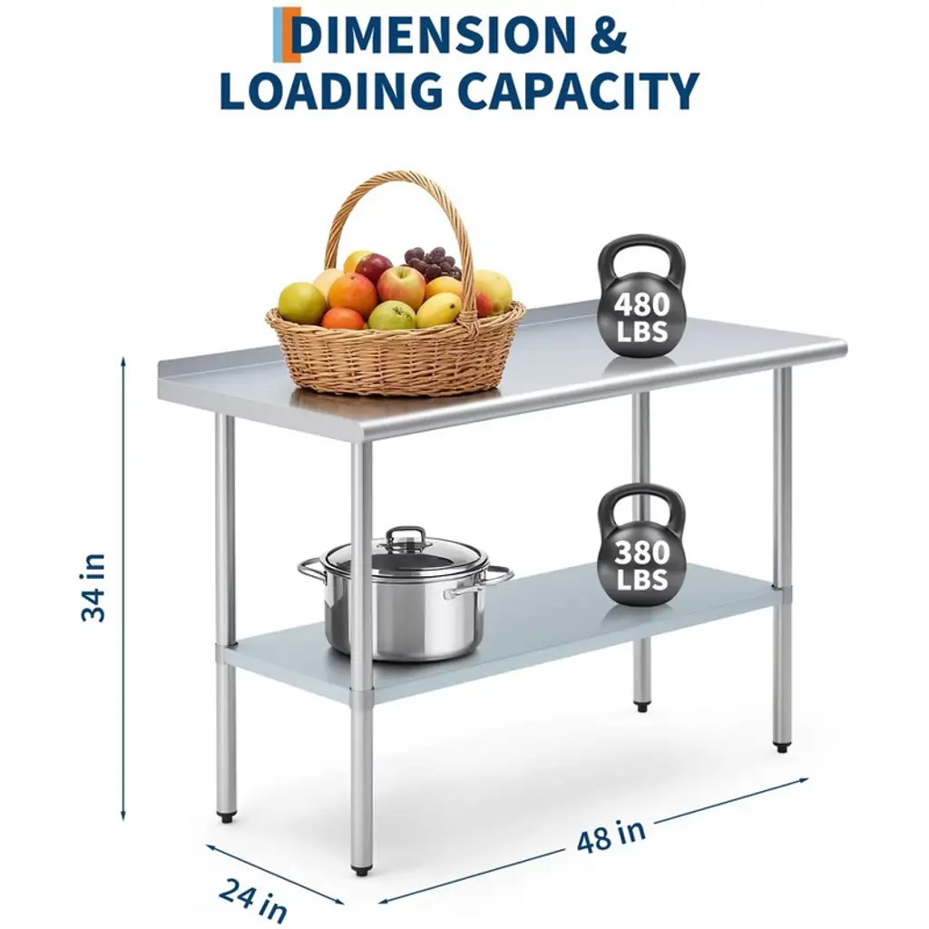 This stainless steel workbench features a 430 stainless steel worktop and a galvanized steel base frame, with a worktop weight capacity of 480 lbs and a base frame capacity of 380 lbs. Rounded corners prevent injuries from collisions, while the rear guard prevents items from sliding off. Height-adjustable legs accommodate various settings. Quick assembly enables use in commercial kitchens, home meal prep, garage workstations, and more, meeting high-intensity usage demands.