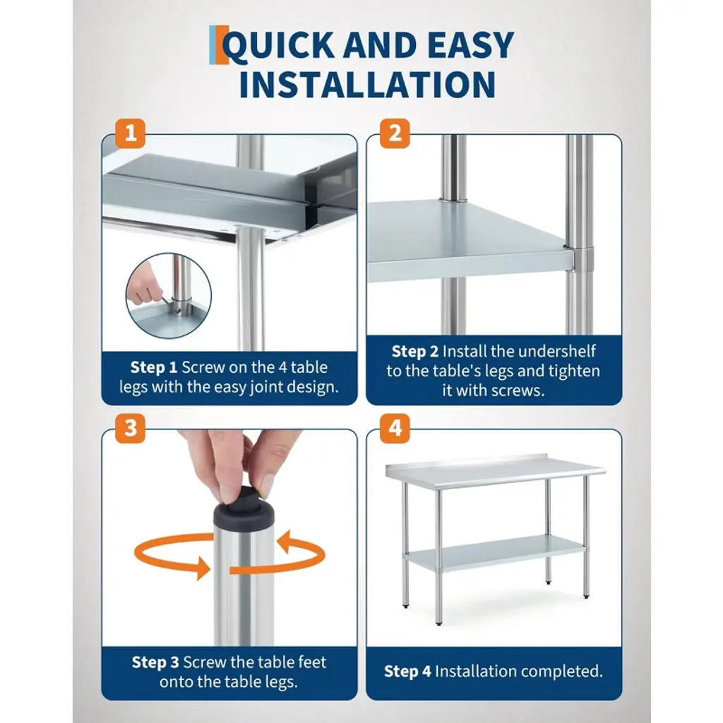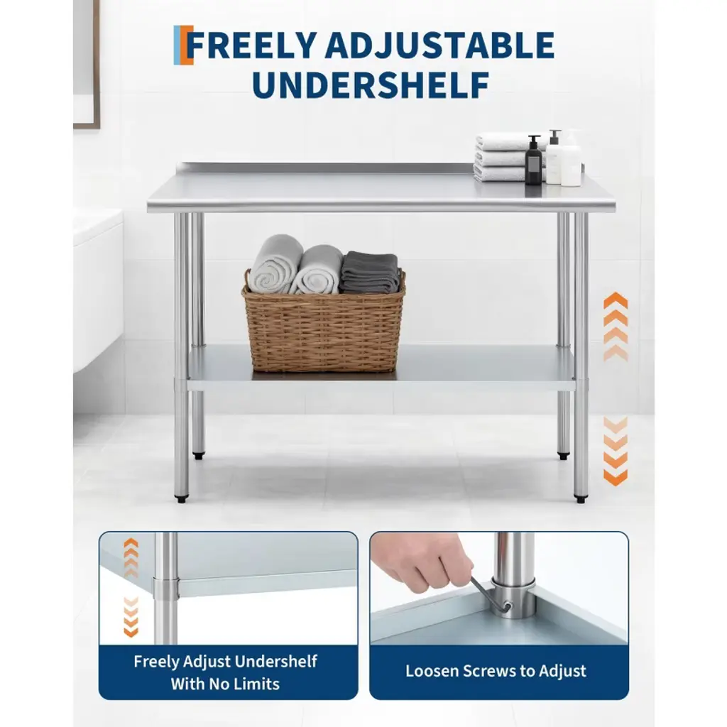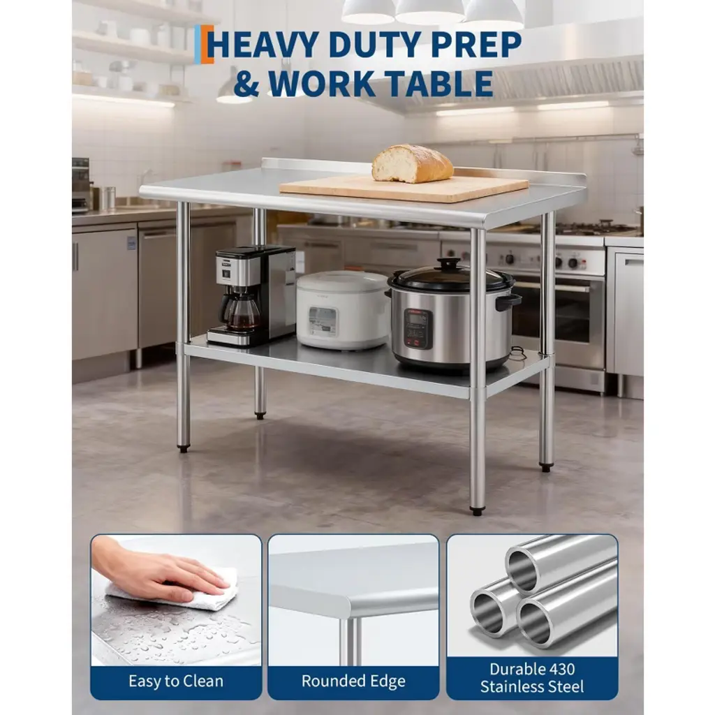 This stainless steel workbench features a 430 stainless steel worktop and a galvanized steel base frame, with a worktop weight capacity of 480 lbs and a base frame capacity of 380 lbs. Rounded corners prevent injuries from collisions, while the rear guard prevents items from sliding off. Height-adjustable legs accommodate various settings. Quick assembly enables use in commercial kitchens, home meal prep, garage workstations, and more, meeting high-intensity usage demands.