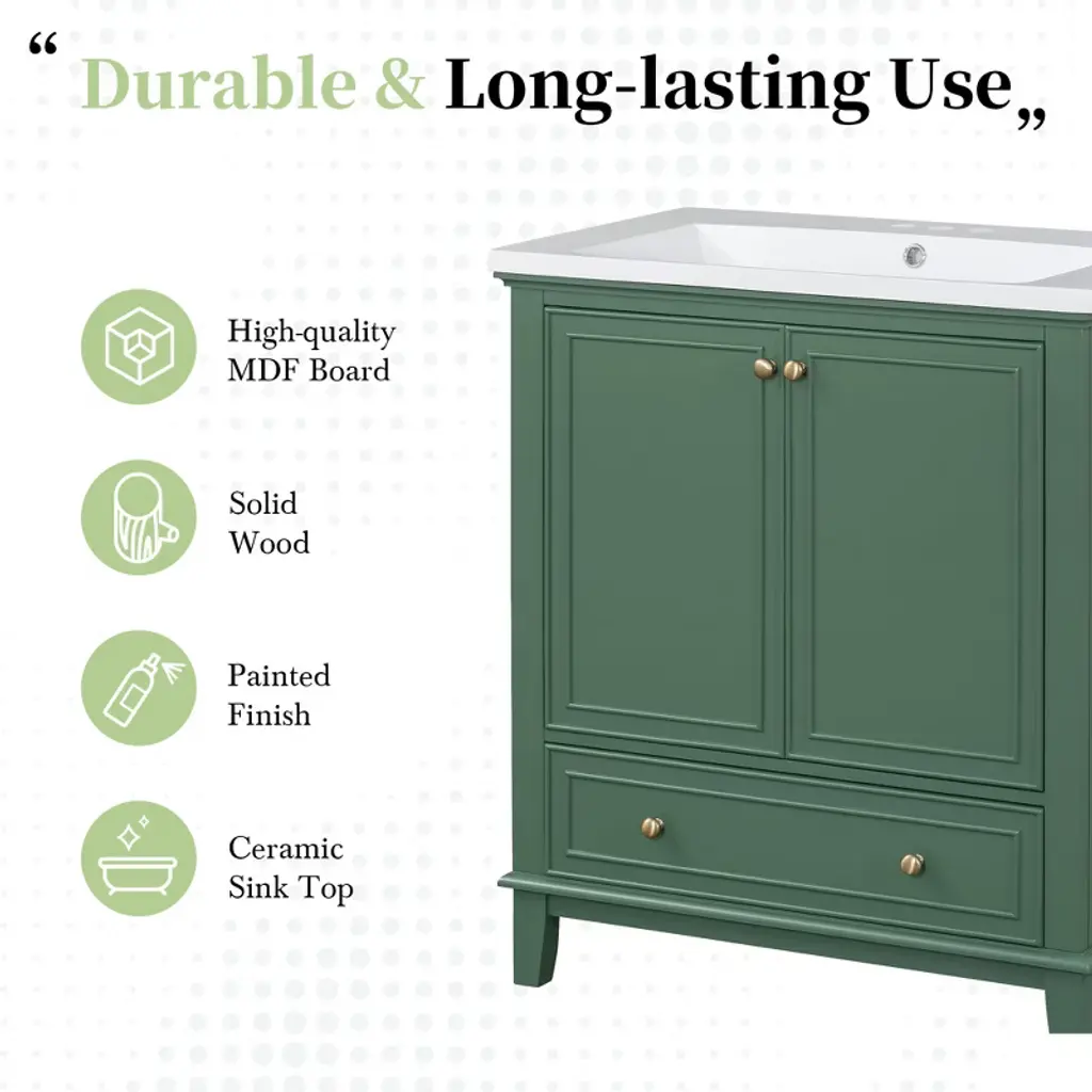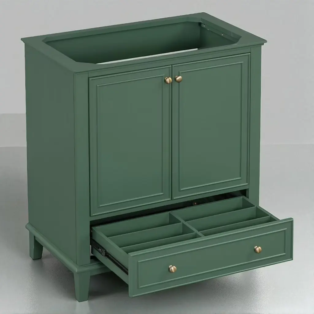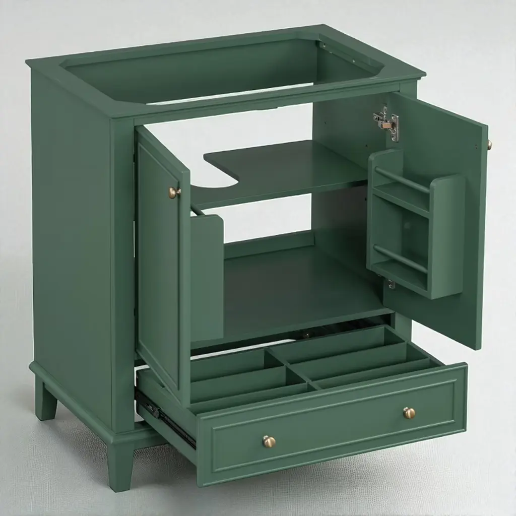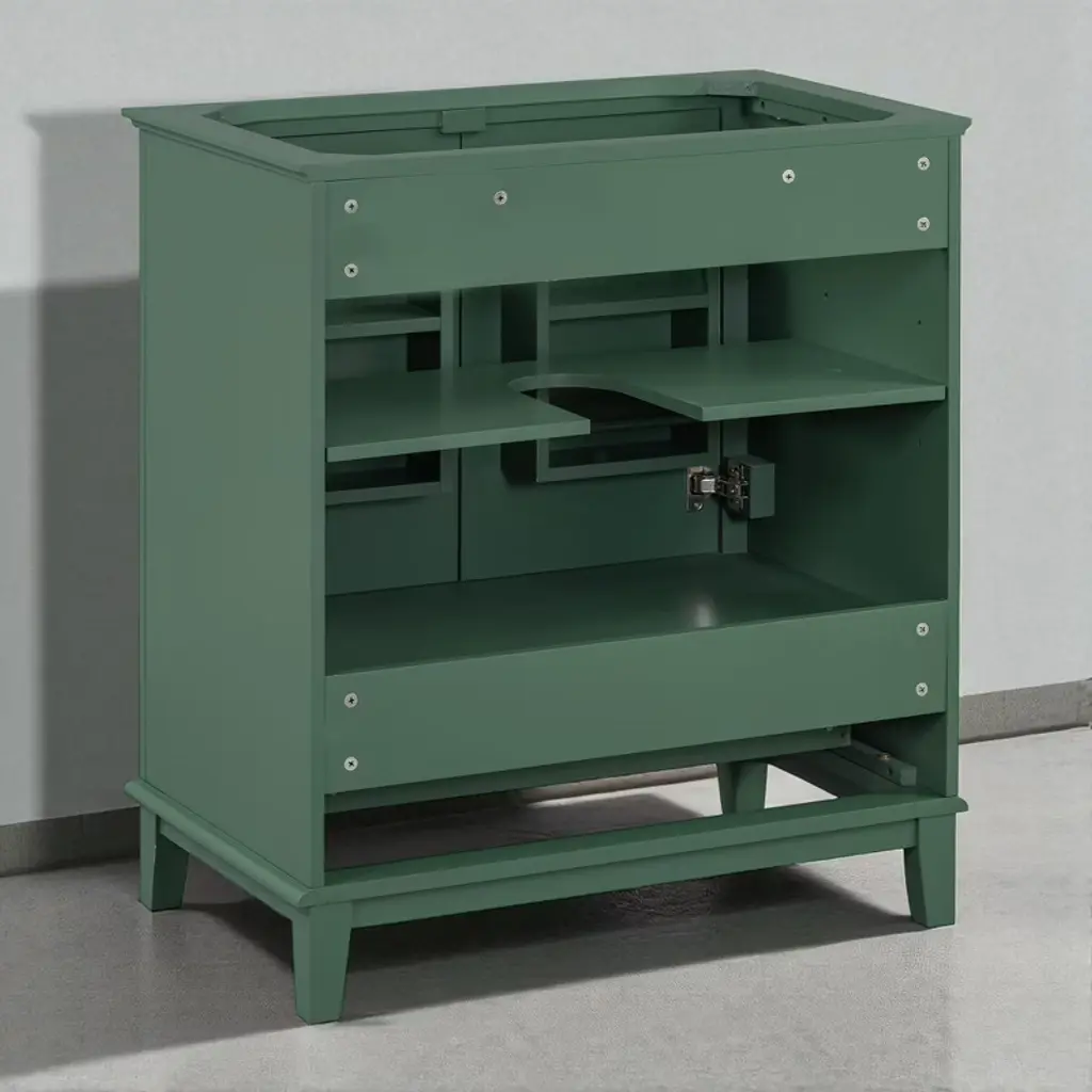 Product Overview:Upgrade your bathroom with this 29.5-inch modern dark green vanity cabinet base that offers flexible customization and stylish storage. Designed without a sink, this freestanding vanity gives you the freedom to choose your own countertop and basin to match your bathroom’s unique look. Constructed from solid wood and MDF board, this vanity base delivers long-lasting durability and functionality with a painted finish that resists moisture and daily wear.Product Features:Vanity Base Only – Sink Not Included: This product includes the cabinet base only, allowing you to pair it with your preferred sink top. Its centered sink compatibility offers versatility for various undermount or drop-in sink styles.Solid Wood Frame & Durable MDF Panels: The frame is built from corrosion-resistant solid wood for strength and longevity, while MDF panels provide smooth finishes and excellent durability for everyday use.Multi-Functional Storage: Two cabinet doors each feature interior two-tier racks, perfect for organizing makeup, bottles, and small items. The large bottom drawer includes removable dividers for customizable storage solutions.Adjustable Interior Shelf: Inside the main cabinet, a three-position adjustable shelf allows flexible storage for toiletries of various heights, such as shampoo, soap, or lotion bottles.Easy Assembly: All necessary hardware, including drawer slides, stainless steel hinges, handles, and an anti-tip kit, are included. A detailed instruction manual guides you through the simple setup process.Specifications:Product Dimensions: 29.5"" L x 17.8"" W x 33.8"" HMaterial: Solid Wood + MDF BoardColor: Dark GreenMounting Type: FreestandingNumber of Doors: 2Number of Drawers: 1Sink Compatibility: Centered Sink (Undermount or Drop-In, not included)Edge Thickness: 0.6""Weight Capacity: 100 lbsHardware Included: YesAssembly Required: YesCountry of Origin: VietnamCertification: CARB P2Suitable Scenarios:Perfect for modern bathrooms, guest bathrooms, or powder rooms where a custom sink solution is preferred. Ideal for homeowners, renovators, or designers looking for a stylish, functional, and customizable vanity base.Notes:Sink, faucet, and countertop are not included. Assembly is required. Colors may appear slightly different in person due to lighting or monitor display variations.