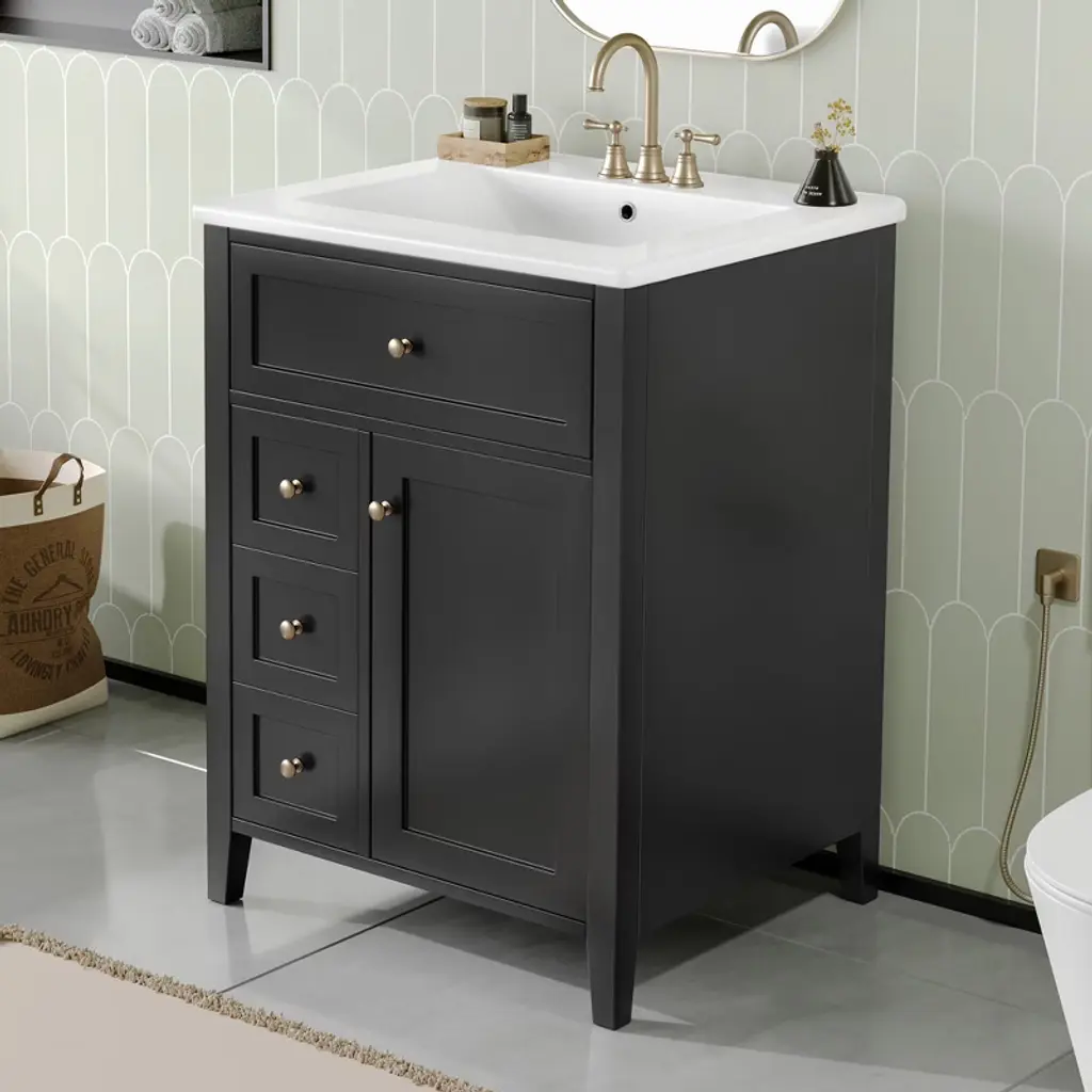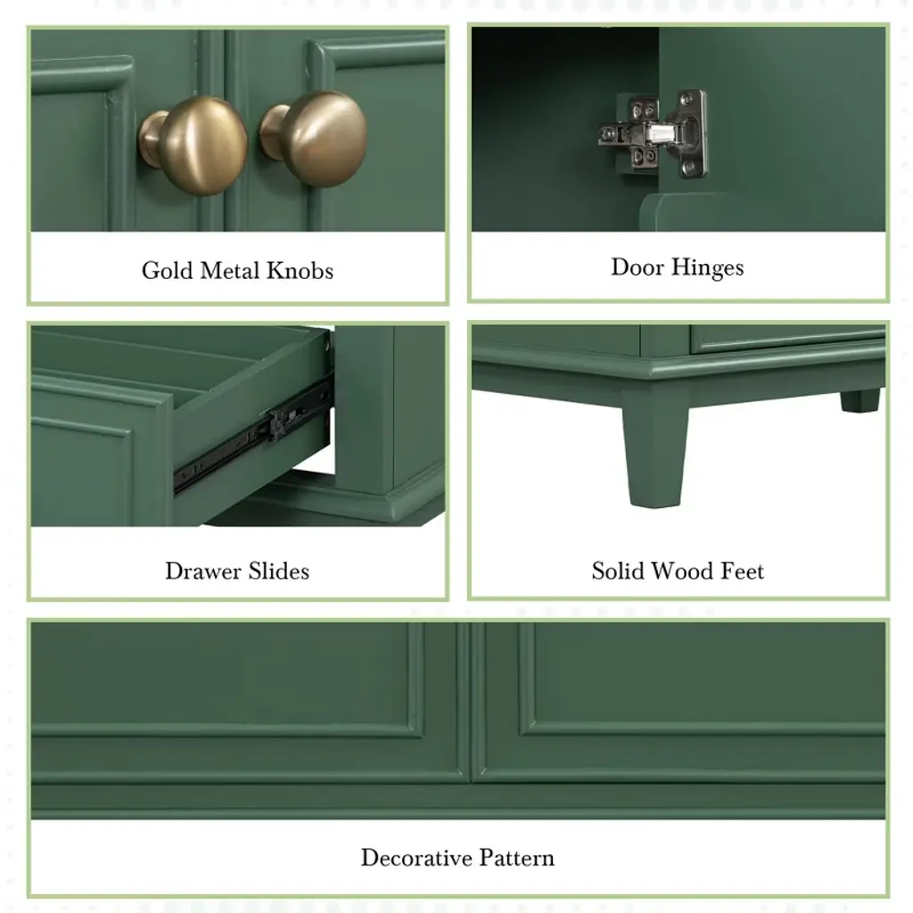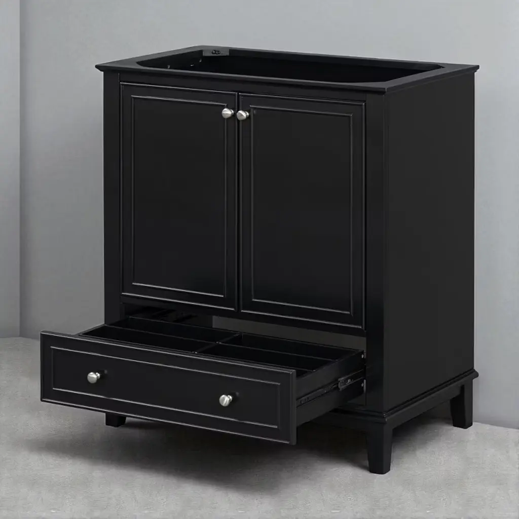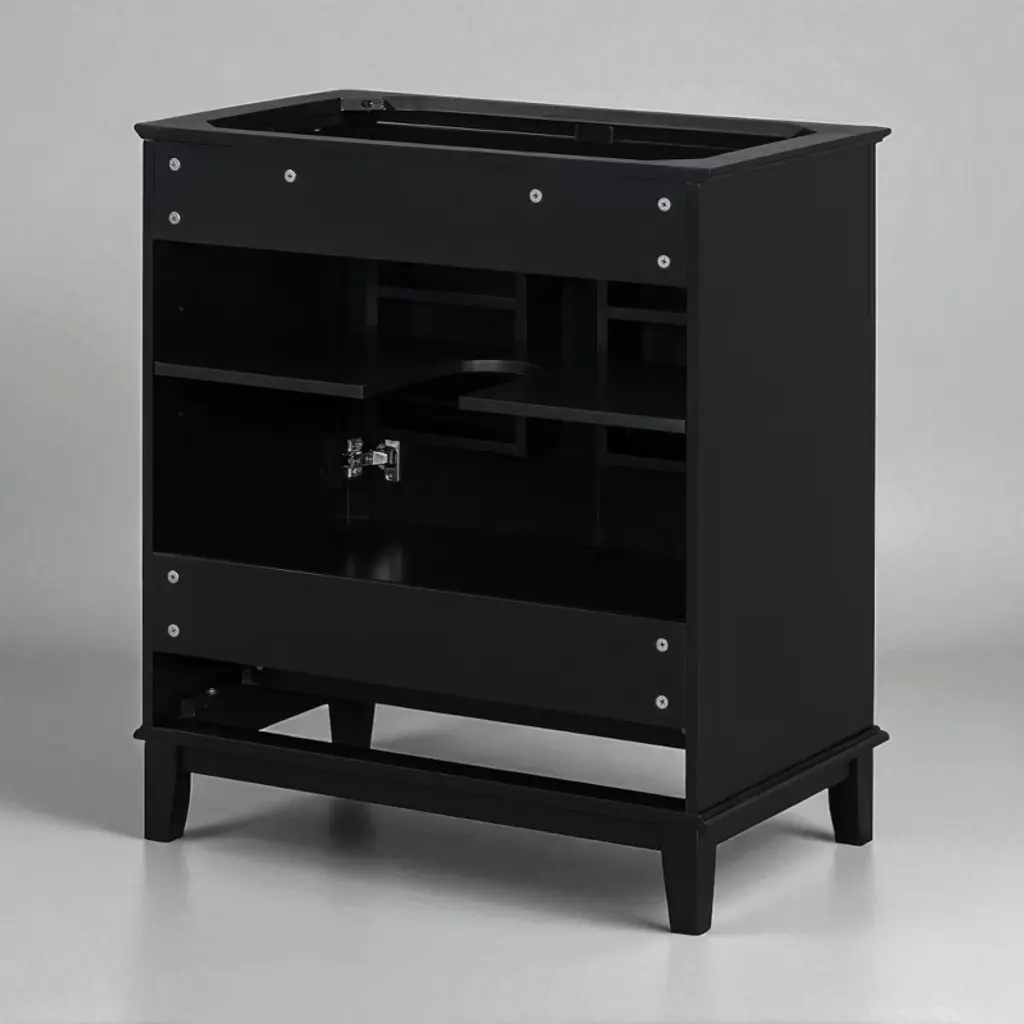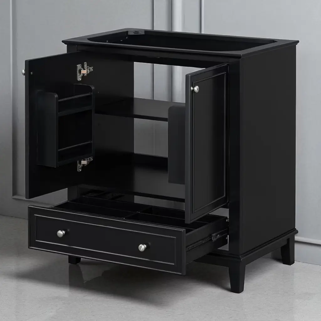Product Overview:Upgrade your bathroom with this 29.5-inch modern dark green vanity cabinet base that offers flexible customization and stylish storage. Designed without a sink, this freestanding vanity gives you the freedom to choose your own countertop and basin to match your bathroom’s unique look. Constructed from solid wood and MDF board, this vanity base delivers long-lasting durability and functionality with a painted finish that resists moisture and daily wear.Product Features:Vanity Base Only – Sink Not Included: This product includes the cabinet base only, allowing you to pair it with your preferred sink top. Its centered sink compatibility offers versatility for various undermount or drop-in sink styles.Solid Wood Frame & Durable MDF Panels: The frame is built from corrosion-resistant solid wood for strength and longevity, while MDF panels provide smooth finishes and excellent durability for everyday use.Multi-Functional Storage: Two cabinet doors each feature interior two-tier racks, perfect for organizing makeup, bottles, and small items. The large bottom drawer includes removable dividers for customizable storage solutions.Adjustable Interior Shelf: Inside the main cabinet, a three-position adjustable shelf allows flexible storage for toiletries of various heights, such as shampoo, soap, or lotion bottles.Easy Assembly: All necessary hardware, including drawer slides, stainless steel hinges, handles, and an anti-tip kit, are included. A detailed instruction manual guides you through the simple setup process.Specifications:Product Dimensions: 29.5"" L x 17.8"" W x 33.8"" HMaterial: Solid Wood + MDF BoardColor: Dark GreenMounting Type: FreestandingNumber of Doors: 2Number of Drawers: 1Sink Compatibility: Centered Sink (Undermount or Drop-In, not included)Edge Thickness: 0.6""Weight Capacity: 100 lbsHardware Included: YesAssembly Required: YesCountry of Origin: VietnamCertification: CARB P2Suitable Scenarios:Perfect for modern bathrooms, guest bathrooms, or powder rooms where a custom sink solution is preferred. Ideal for homeowners, renovators, or designers looking for a stylish, functional, and customizable vanity base.Notes:Sink, faucet, and countertop are not included. Assembly is required. Colors may appear slightly different in person due to lighting or monitor display variations.