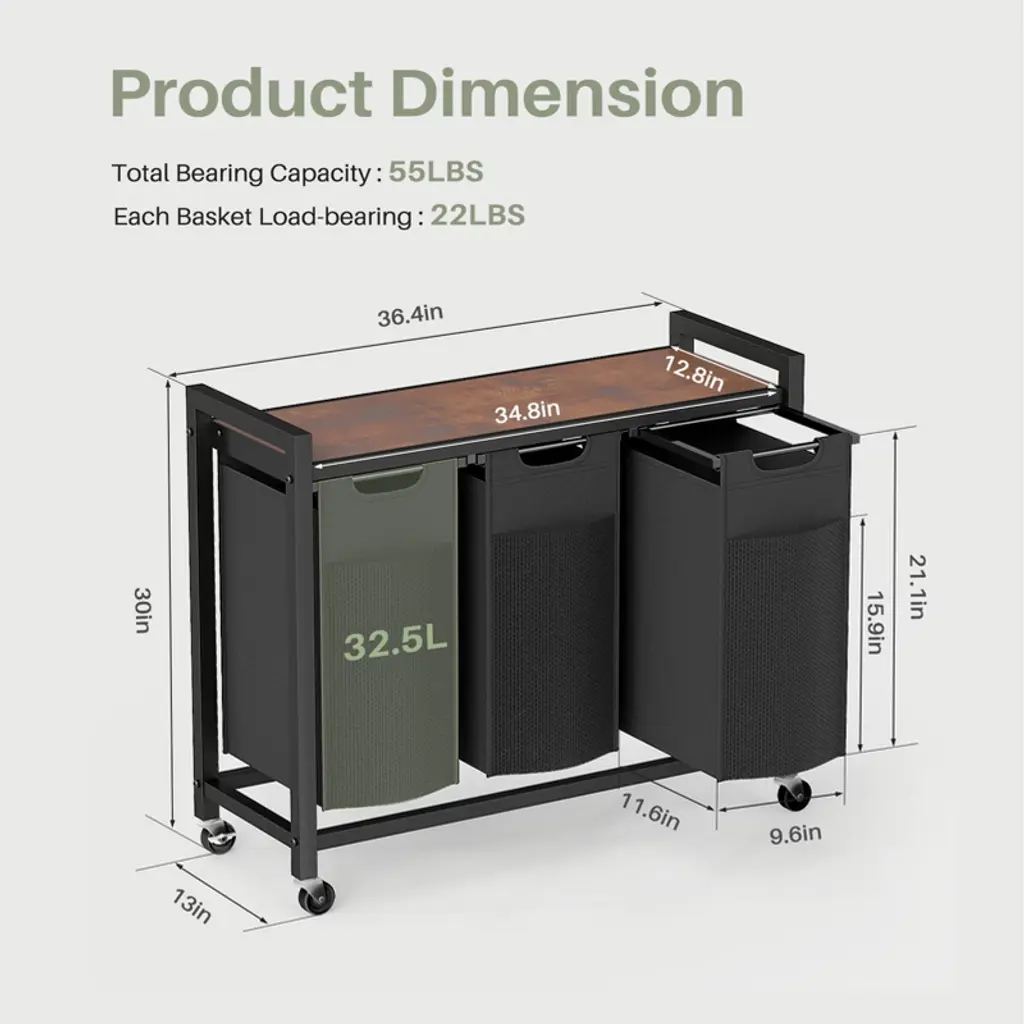 Organize your laundry routine with this 3-compartment rolling laundry hamper. With a total 25.8-gallon capacity, it features three removable bags (8.6 gallons each), waterproof Oxford fabric, and smooth pull-out design. The built-in MDF top shelf adds convenience and style by providing extra surface space while covering laundry bags beneath. You can configure either wheels (for easy mobility) or adjustable feet (for floor protection). With mesh pockets and a sturdy steel frame, this sorter is perfect for bedrooms, bathrooms, or laundry rooms.