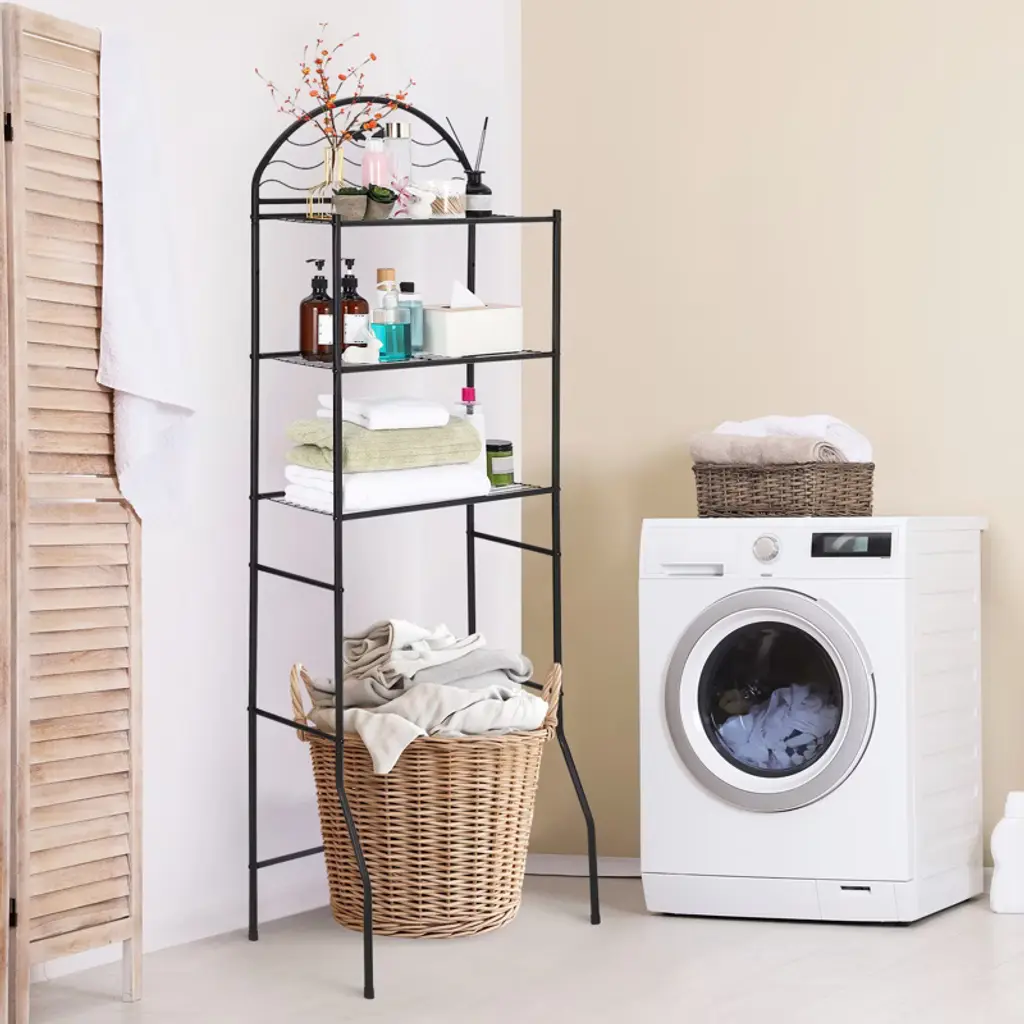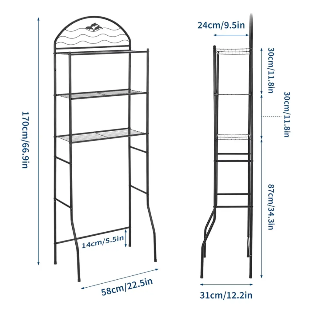 Highlights at a glance: Compact size—fits small bathrooms, apartments, and laundry rooms. Three-tier shelves—store towels, toiletries, and essentials with ease. Heavy-duty, rust-resistant iron frame—built to last. Freestanding design—no drilling, easy assembly. Modern black finish with wave and dolphin accents—stylish and functional. Space-saving solution—keep your bathroom organized and clutter-free. Specification: Size: 22.5x12.2x66.9 inches Material: iron Color: black Friendly note: Before assembly, ensure the area above the toilet is clear of any items to facilitate a smooth installation process. Ensure that the floor is level to prevent any wobbling. Wipe the surfaces regularly with a damp cloth to keep the shelves looking their best. Packing list: Over the toilet storage shelves x1 Hardware bag x1 Assembly guide x1