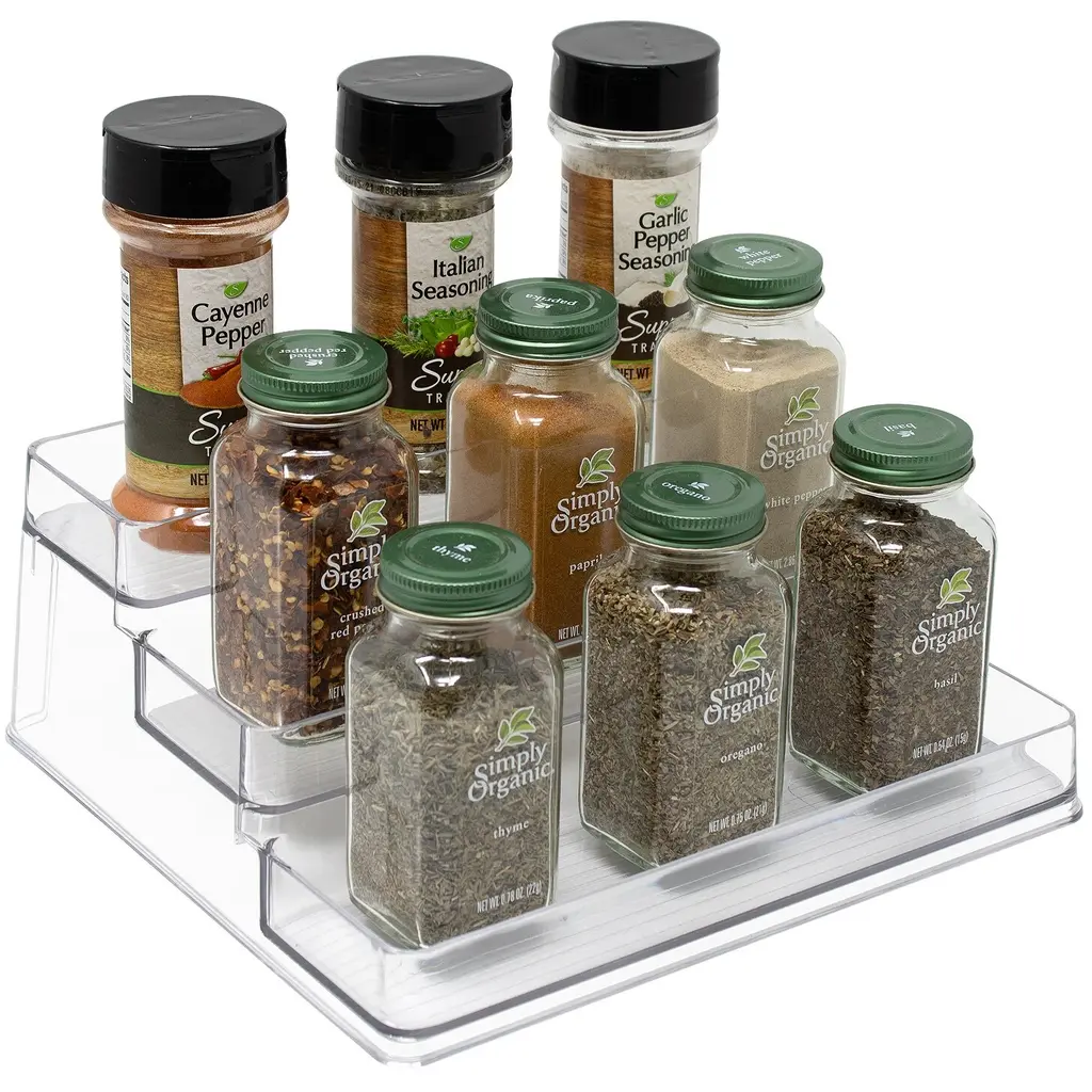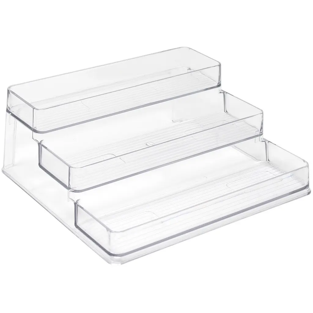 Whether a bottle of paprika or jar of oil, the Sorbus 3-Tier Shelf holds your small essentials in one tidy place. No more searching through cluttered cabinets! The layered design helps you access those hard to reach items. Simply organize each level with your most used ingredients, spices, and condiments. The clear design coordinates beautifully with most aesthetics and easy to clean by hand. Store inside pantry cabinets, under-the-sink, or on countertops for convenience.Versatile for any space.This space-saving organizer shelf is essential for any room that needs a little de-cluttering. Use in the kitchen for seasonings, salt & pepper grinders, jars, jams, canned goods, and more! Your neatly displayed collection will be attractive and easy to scan before your next grocery run. For versatility, display perfumes and cosmetics on your vanity or everyday toiletries and medicine on the bathroom counter. Most of all, enjoy your neatly organized space.Clear 3-tier design.Space-saving solution with three level step design.Made of BPA and Chlorine free shatter-resistant clear plastic.Clean by hand. DO NOT place in dishwasher.Measures approximately 10" L x 9.25” W x 4" H.