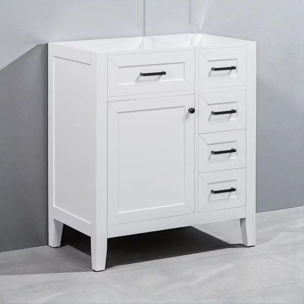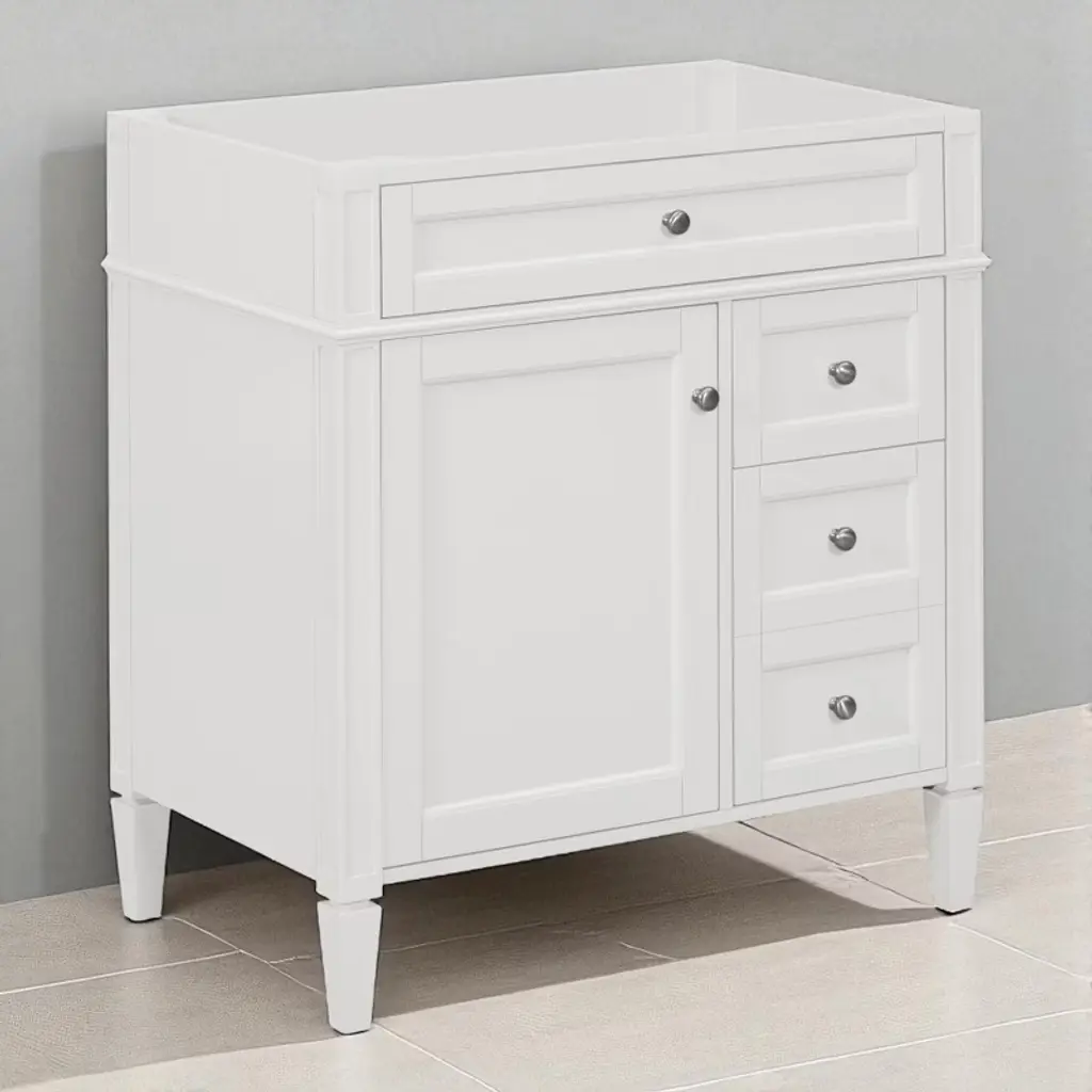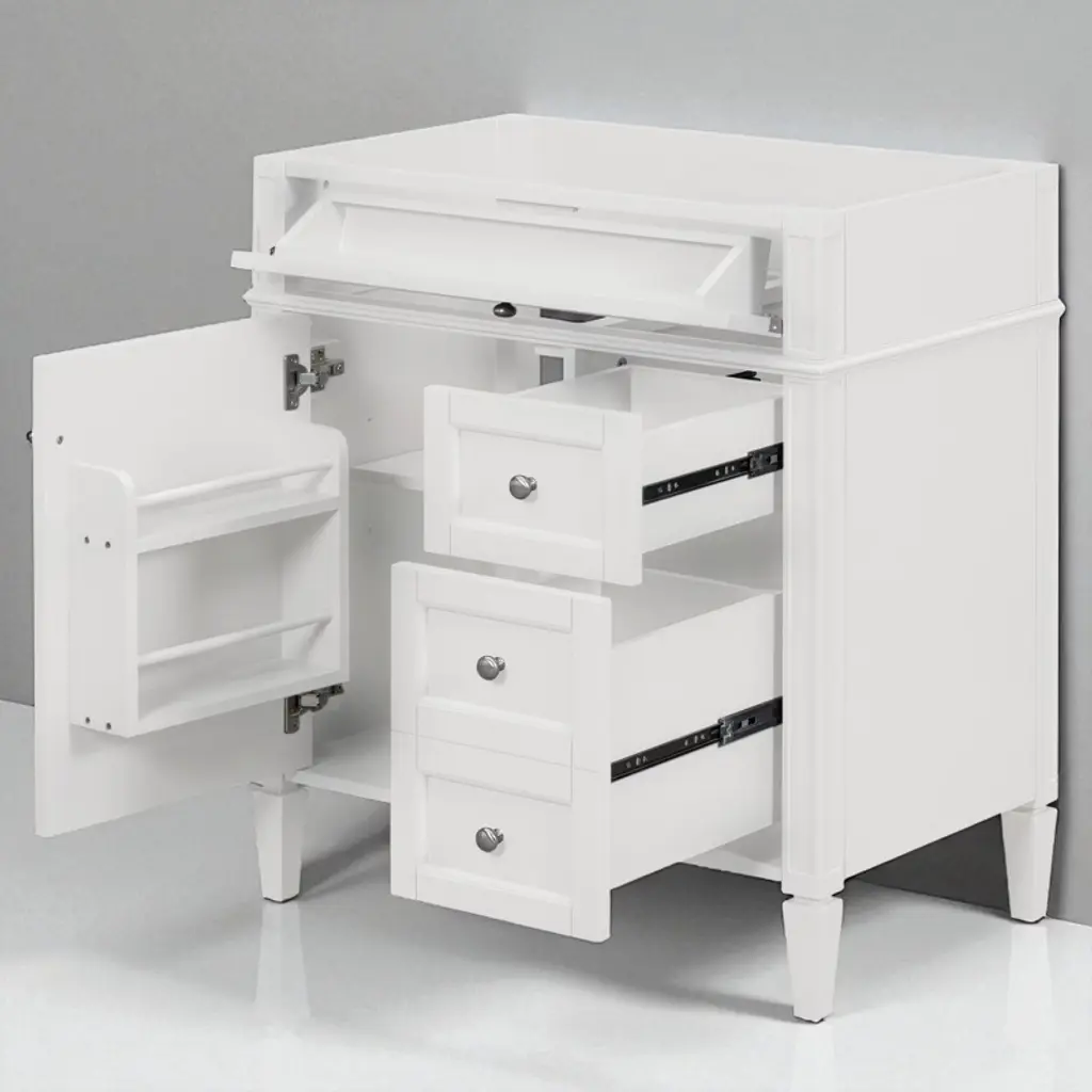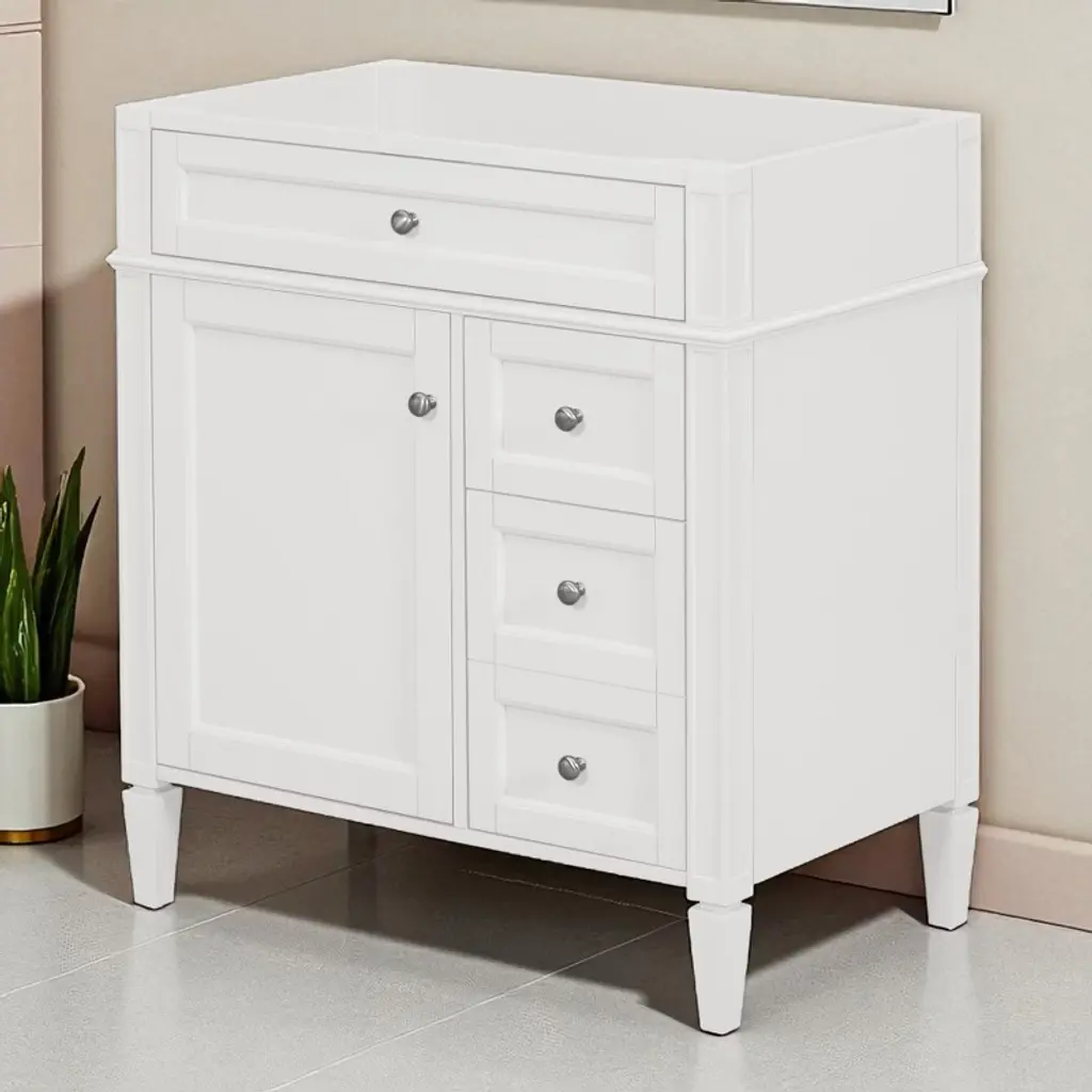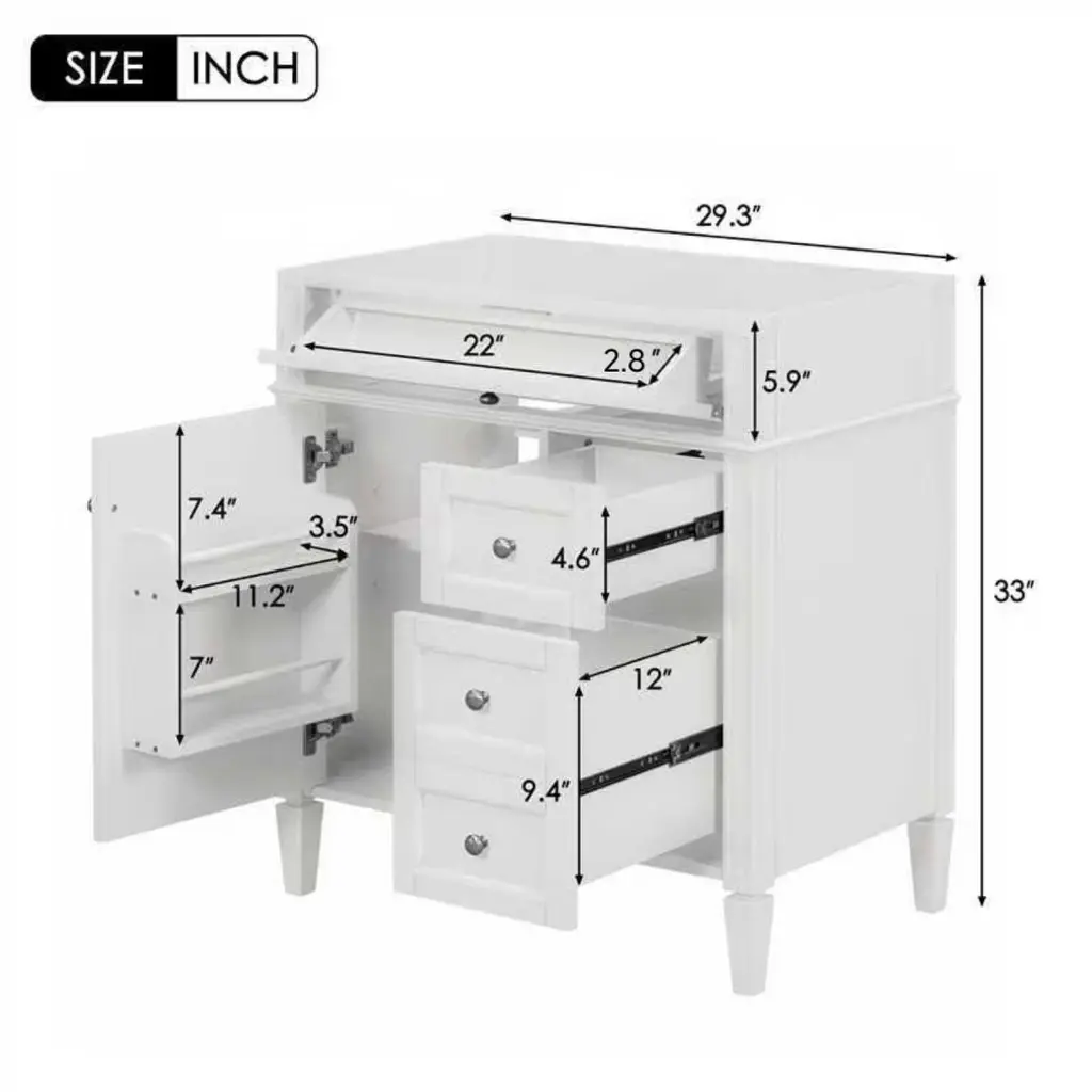Product Overview Give your bathroom a stylish and functional upgrade with this 30'' freestanding bathroom vanity cabinet. Designed with modern aesthetics and practical features, it includes two spacious drawers, a tip-out drawer, and an interior adjustable shelf to suit all your storage needs. The cabinet door organizer adds extra usability, while the elegant Roman-style legs and textured handles bring refined detail to any contemporary bathroom space. Please note: basin and faucet are not included. Product Features Elegant Modern Design: The clean lines, textured handles, and Roman leg design create a visually appealing cabinet perfect for minimalist or modern bathrooms.Diverse Storage Options: Includes two large drawers, a convenient tip-out drawer for smaller items, and a cabinet space with an adjustable shelf—perfect for storing anything from toiletries to bath towels.Cabinet Door Organizer: Additional storage is built into the door, providing smart organization for quick-access items without taking up extra space.Durable Construction: Crafted from solid wood and high-quality MDF boards, this vanity is built to last. The water-resistant painted finish protects against moisture and wear.Soft-Close Hardware: Soft-closing doors and smooth metal drawer slides ensure quiet, gentle operation and extended longevity of use.Easy Assembly: All parts are labeled with pre-drilled holes and included hardware. Step-by-step instructions make assembly simple for one or two adults. Specifications Product Dimensions: 29.3'' L x 17.87'' W x 33'' HWeight: 67.46 lbsWeight Capacity: Overall: 300 lbs / Panel: 50 lbs / Drawer: 50 lbsMaterial: MDF Board & Solid WoodColor: WhiteNumber of Drawers: 2 Standard Drawers + 1 Tip-Out DrawerShelf: 1 Adjustable ShelfFaucet Mount: 4'' Centerset (Faucet Not Included)Assembly Required: YesRecommended Number of People for Assembly: 1–2 AdultsPackage Includes: Bathroom Vanity, Screw Pack, Instruction Manual Suitable Scenarios This 30'' vanity cabinet is a perfect fit for small to medium-sized bathrooms, guest bathrooms, powder rooms, or apartment settings. Its versatile design works with a variety of sink styles and bathroom decor themes. Notes This listing is for the vanity cabinet only. Basin and faucet are not included.All dimensions are approximate and may vary slightly due to manual measurement.Product color may differ slightly due to lighting and screen display variations.