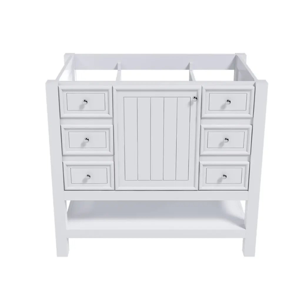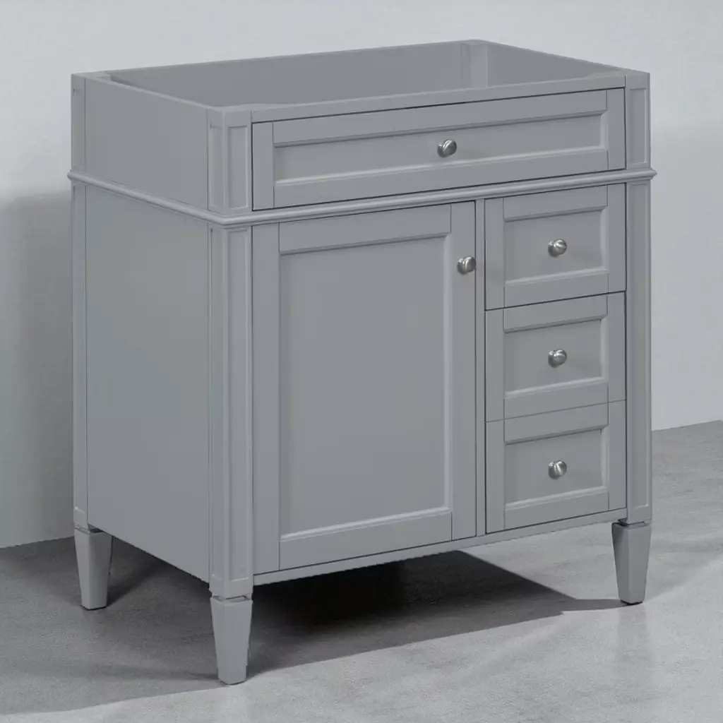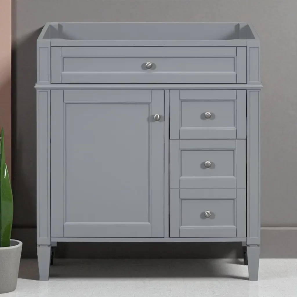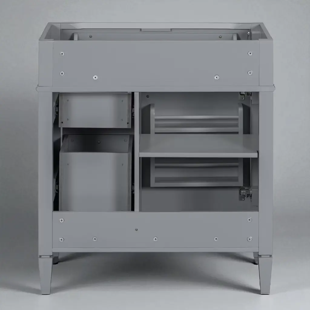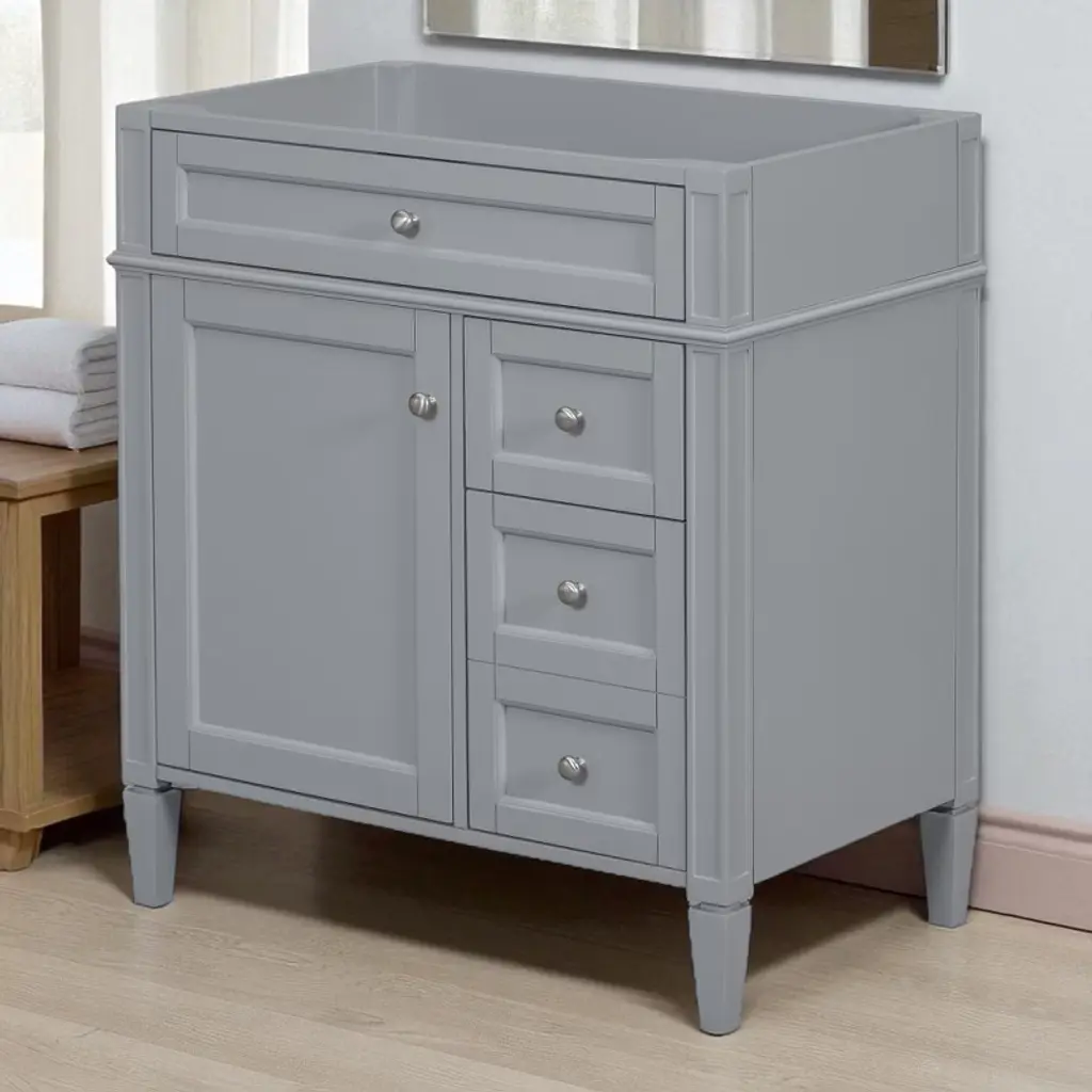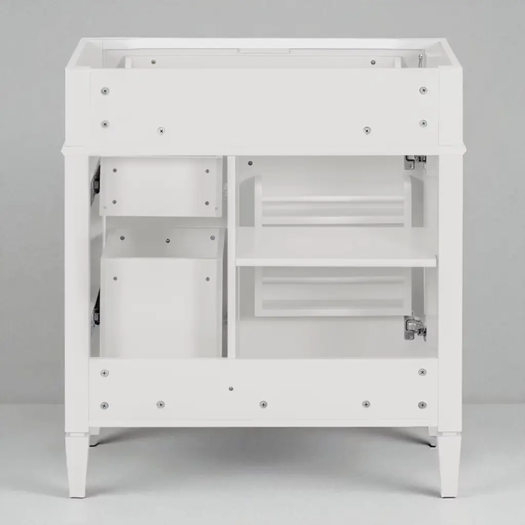 Product Overview Give your bathroom a stylish and functional upgrade with this 30'' freestanding bathroom vanity cabinet. Designed with modern aesthetics and practical features, it includes two spacious drawers, a tip-out drawer, and an interior adjustable shelf to suit all your storage needs. The cabinet door organizer adds extra usability, while the elegant Roman-style legs and textured handles bring refined detail to any contemporary bathroom space. Please note: basin and faucet are not included. Product Features Elegant Modern Design: The clean lines, textured handles, and Roman leg design create a visually appealing cabinet perfect for minimalist or modern bathrooms.Diverse Storage Options: Includes two large drawers, a convenient tip-out drawer for smaller items, and a cabinet space with an adjustable shelf—perfect for storing anything from toiletries to bath towels.Cabinet Door Organizer: Additional storage is built into the door, providing smart organization for quick-access items without taking up extra space.Durable Construction: Crafted from solid wood and high-quality MDF boards, this vanity is built to last. The water-resistant painted finish protects against moisture and wear.Soft-Close Hardware: Soft-closing doors and smooth metal drawer slides ensure quiet, gentle operation and extended longevity of use.Easy Assembly: All parts are labeled with pre-drilled holes and included hardware. Step-by-step instructions make assembly simple for one or two adults. Specifications Product Dimensions: 29.3'' L x 17.87'' W x 33'' HWeight: 67.46 lbsWeight Capacity: Overall: 300 lbs / Panel: 50 lbs / Drawer: 50 lbsMaterial: MDF Board & Solid WoodColor: WhiteNumber of Drawers: 2 Standard Drawers + 1 Tip-Out DrawerShelf: 1 Adjustable ShelfFaucet Mount: 4'' Centerset (Faucet Not Included)Assembly Required: YesRecommended Number of People for Assembly: 1–2 AdultsPackage Includes: Bathroom Vanity, Screw Pack, Instruction Manual Suitable Scenarios This 30'' vanity cabinet is a perfect fit for small to medium-sized bathrooms, guest bathrooms, powder rooms, or apartment settings. Its versatile design works with a variety of sink styles and bathroom decor themes. Notes This listing is for the vanity cabinet only. Basin and faucet are not included.All dimensions are approximate and may vary slightly due to manual measurement.Product color may differ slightly due to lighting and screen display variations.