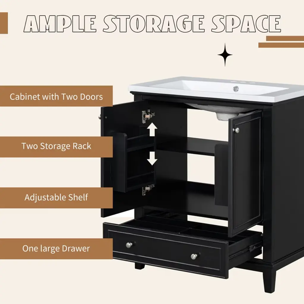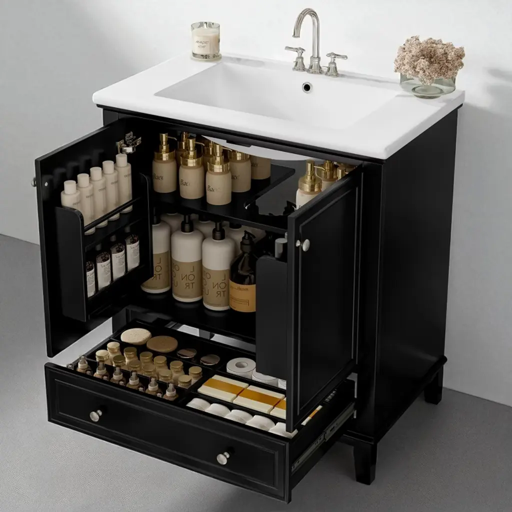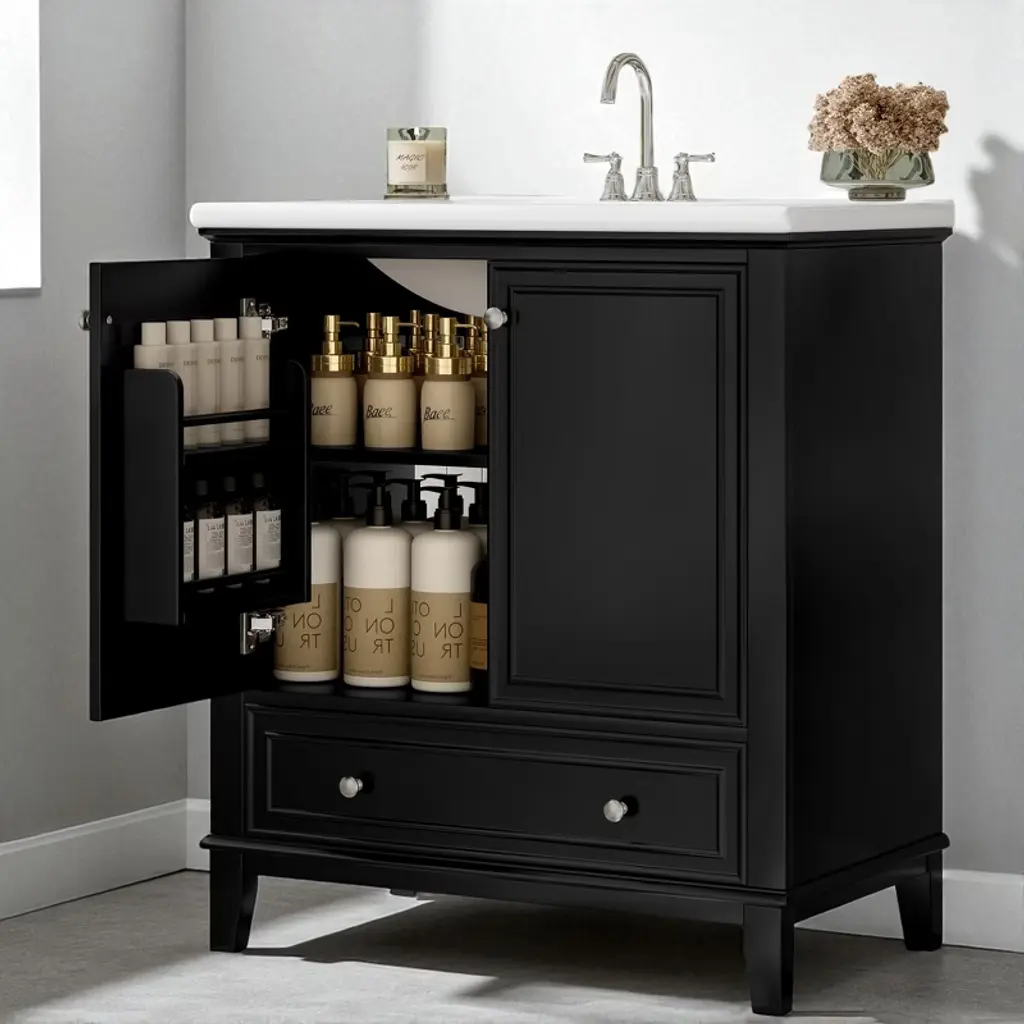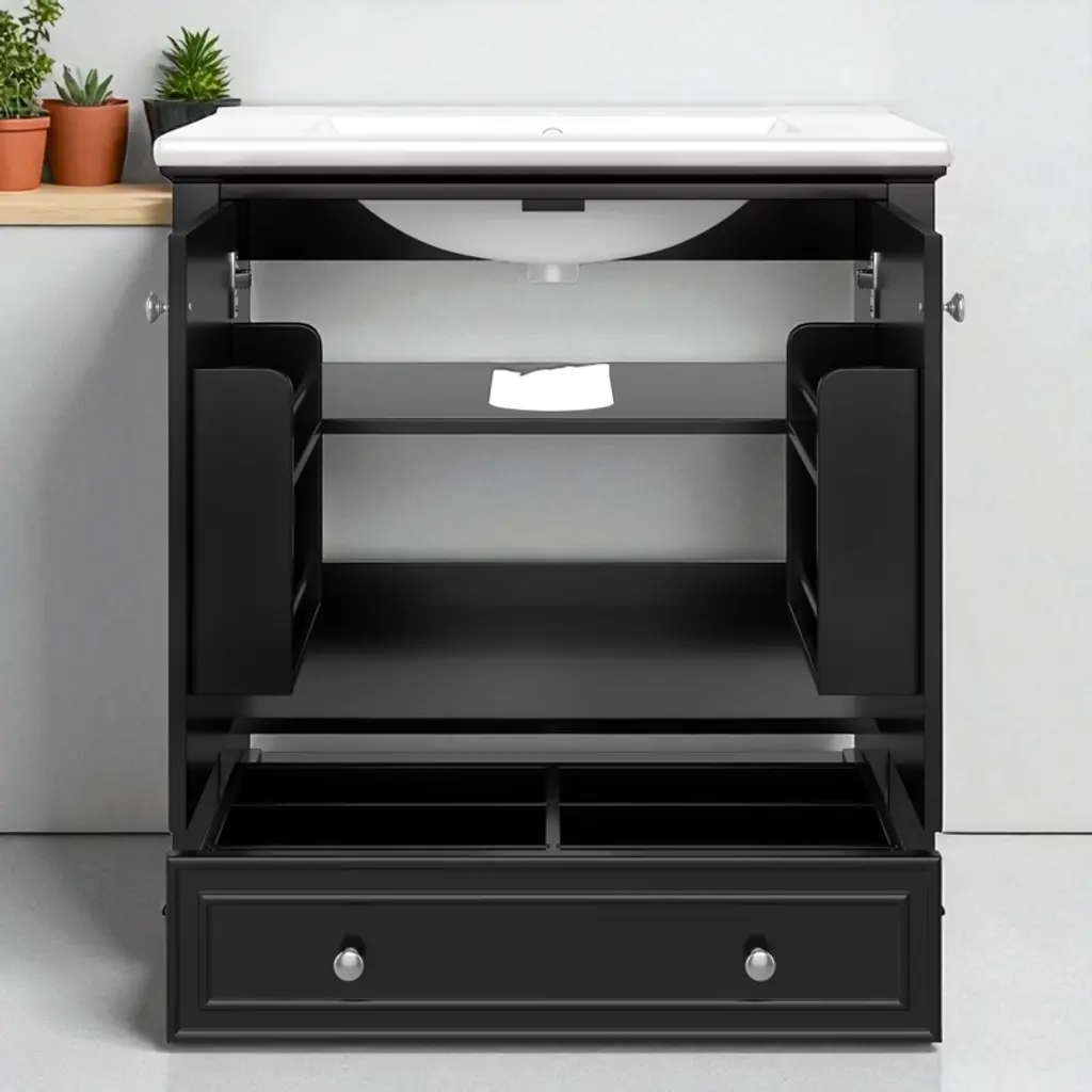 Product OverviewEnhance your bathroom with this elegant 30"" Black Bathroom Vanity, expertly designed to combine practicality and style. This vanity features a smooth, high-quality ceramic sink, made from durable MDF and solid wood construction. The sleek black finish complements modern bathroom styles, and the functional storage with 2 doors and 1 drawer keeps your space organized. Ideal for small to medium bathrooms, this freestanding vanity adds both storage and sophistication to your bathroom décor.Product FeaturesSmooth Ceramic Sink: Made from solid ceramic with a water-proof finish, this sink is resistant to water stains. It comes with pre-drilled faucet holes compatible with a 4"" centerset faucet (not included) and an overflow for added safety.Solid Wood & MDF Construction: The vanity is crafted from solid poplar/rubber wood and durable MDF boards, ensuring stability and long-lasting use. The sturdy wooden frame is complemented by MDF panels, providing a balanced mix of durability and style.Multi-functional Cabinet and Drawer: The cabinet features a functional storage space with a rack inside the doors for makeup and other essentials. The lower drawer is spacious and can be customized with a removable section panel for organized storage.Adjustable Shelf: Inside the cabinet, the adjustable shelf can be set to three different heights, making it easy to store various bathroom essentials like body lotions, shampoos, and soaps of different sizes.Easy Assembly: Assembly is required, and all necessary hardware (screws, metal door hinges, handles, drawer slides, and anti-toppling device) along with instructions are included for a straightforward setup process.SpecificationsOverall Dimensions: 30"" L x 18.1"" W x 33.8"" HCabinet Base Dimensions: 29.5"" L x 17.8"" W x 33.1"" HSink Top Dimensions: 30"" L x 18.1"" W x 4.7"" HWeight: 92.59 lbs (Overall Product)Material: Solid wood, MDF, ceramicFaucet Mount: 4"" centerset (faucet not included)Number of Doors: 2Number of Drawers: 1Capacity: 200 lbsSuitable ScenariosPerfect for modern bathrooms that require both style and functionalityIdeal for small to medium-sized bathrooms, powder rooms, or guest bathroomsGreat for homeowners who prefer a freestanding vanity with ample storage spaceNotesSink is not included; please ensure you select a compatible sink with a 4"" centerset faucet mount.Assembly required; follow the included instructions for an easy setup.Color may vary slightly due to lighting during photography or monitor settings.Ensure the vanity is placed on a level surface for optimal stability and function.