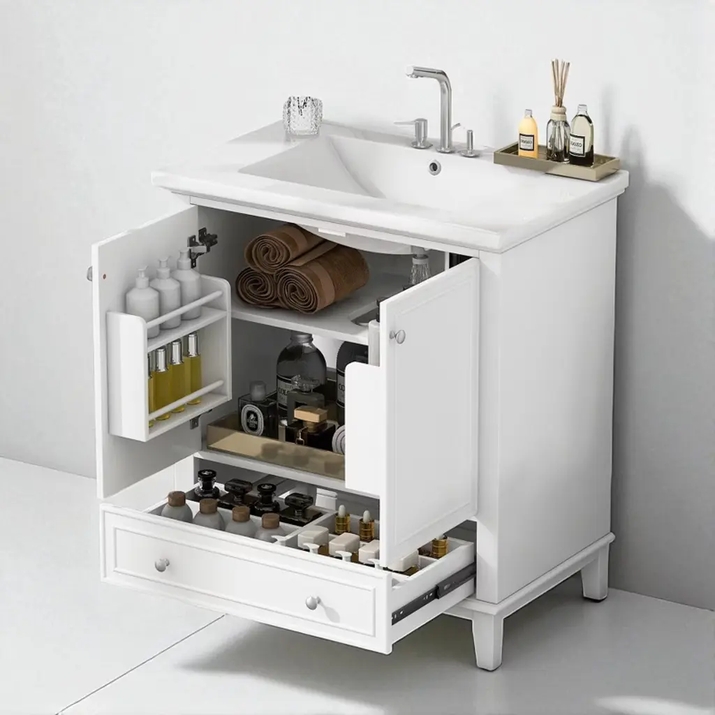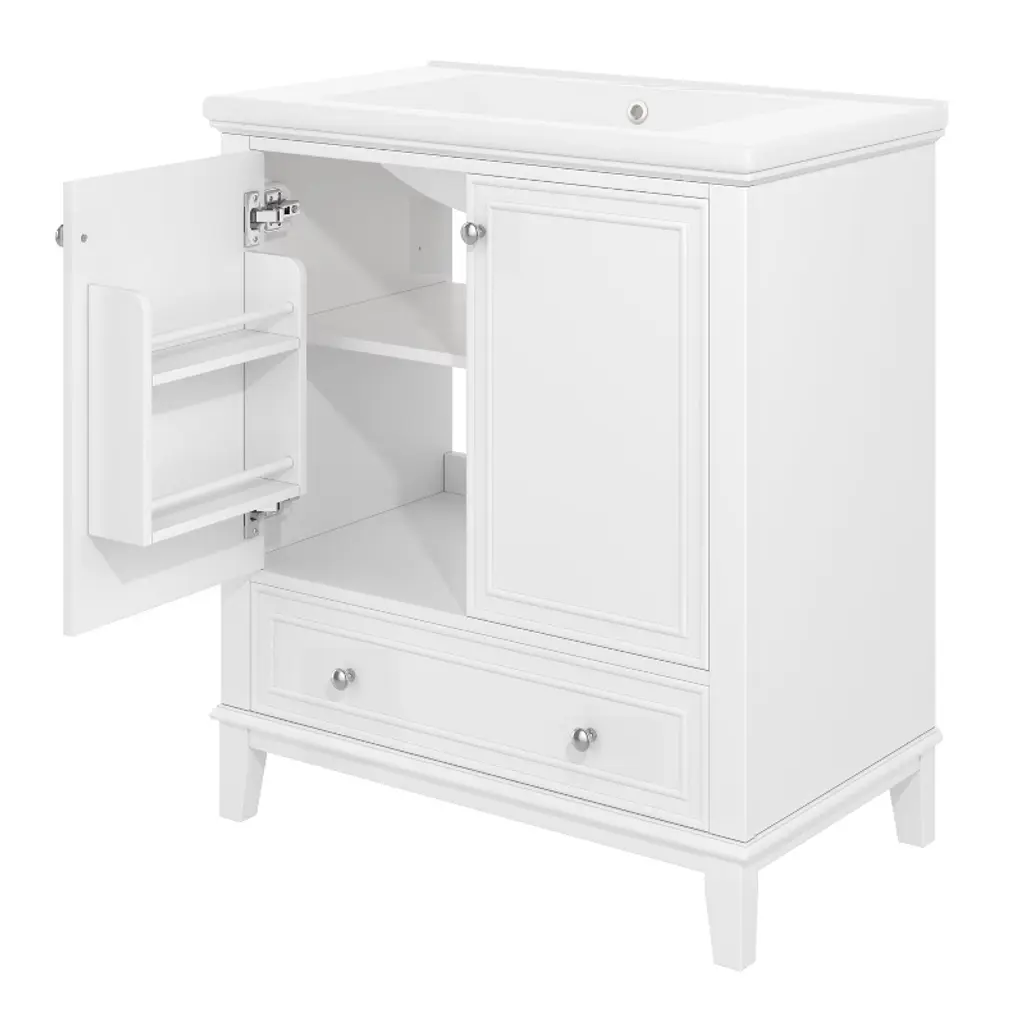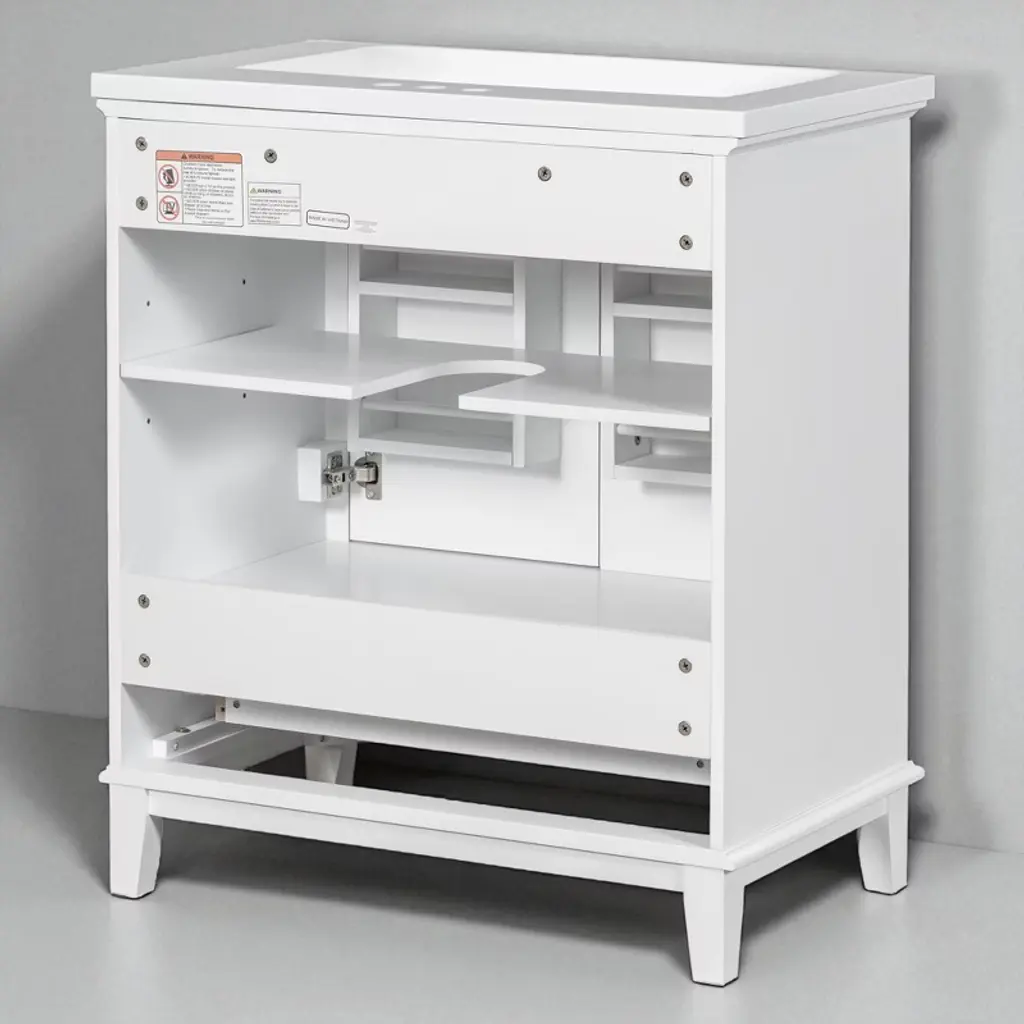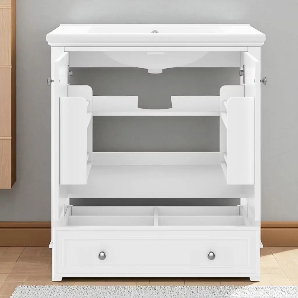 Product Overview:Bring modern functionality and elegant simplicity to your bathroom with this 30"" freestanding bathroom vanity. Featuring a solid wood frame and durable MDF construction, this vanity is finished in crisp white paint and topped with a smooth ceramic sink. The combination of concealed storage and adjustable features ensures a clutter-free, stylish environment perfect for modern lifestyles.Product Features:Smooth Ceramic Sink: The included white ceramic sink features a water-resistant, easy-to-clean surface with a pre-drilled 4"" centerset faucet hole (faucet not included). A built-in overflow with metal trim helps prevent accidental spills.Durable Solid Wood & MDF Construction: Built with a sturdy solid wood frame and reinforced MDF boards, this vanity is designed to withstand the humid conditions of a bathroom. The painted finish adds water and stain resistance for long-lasting use.Smart Storage Solutions: Behind the two cabinet doors is an adjustable shelf with three height settings, ideal for storing bathroom essentials of various sizes. Two-tier storage racks on each door offer added organization for smaller items.Functional Lower Drawer: A spacious drawer at the bottom features slide rails for smooth operation and a removable divider to help organize items like cosmetics, towels, or personal care products.Simple Assembly: The vanity comes in one package and includes all necessary hardware—stainless steel hinges, drawer slides, silver round knobs, and an anti-tip device—along with a detailed instruction manual for easy self-assembly.Specifications:Product Dimensions: 30"" L x 18.1"" W x 33.8"" HMaterial: Solid Poplar/Rubber Wood & MDF BoardFinish: White Painted FinishMounting Type: FreestandingSink Type: Undermount or Drop-In (included)Sink Location: CenterNumber of Doors: 2Number of Drawers: 1Adjustable Shelf: YesFaucet Mount: 4"" Centerset (not included)Weight Capacity: 200 lbsAssembly Required: YesCountry of Origin: VietnamCertification: CARB P2Suitable Scenarios:This vanity is ideal for modern bathrooms of all sizes, including powder rooms, guest baths, or small master bathrooms. Its clean lines and practical storage solutions make it a great fit for both new renovations and quick upgrades.Notes:Faucet is not included. Product color may vary slightly due to monitor settings or lighting. Please follow the included instructions carefully during assembly.