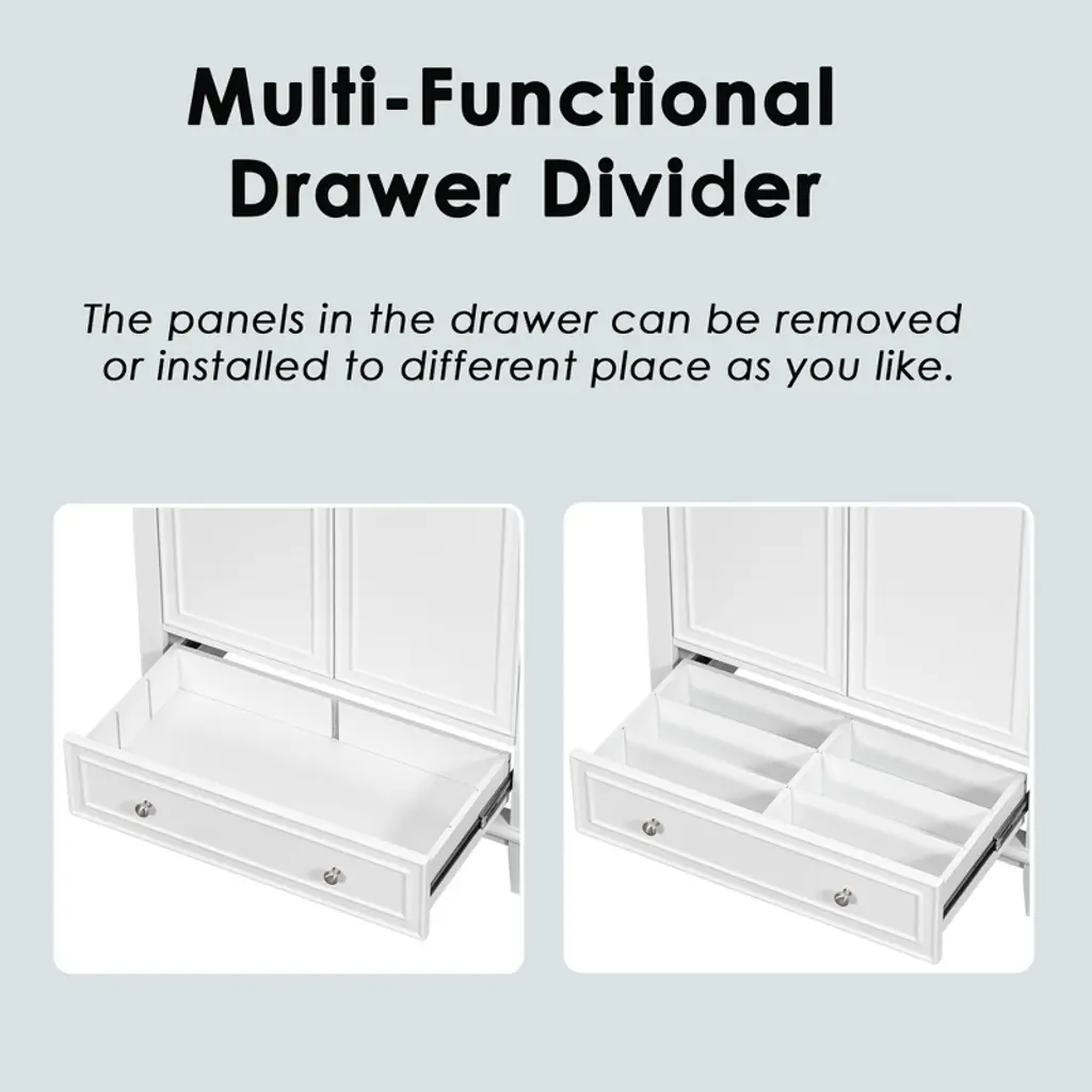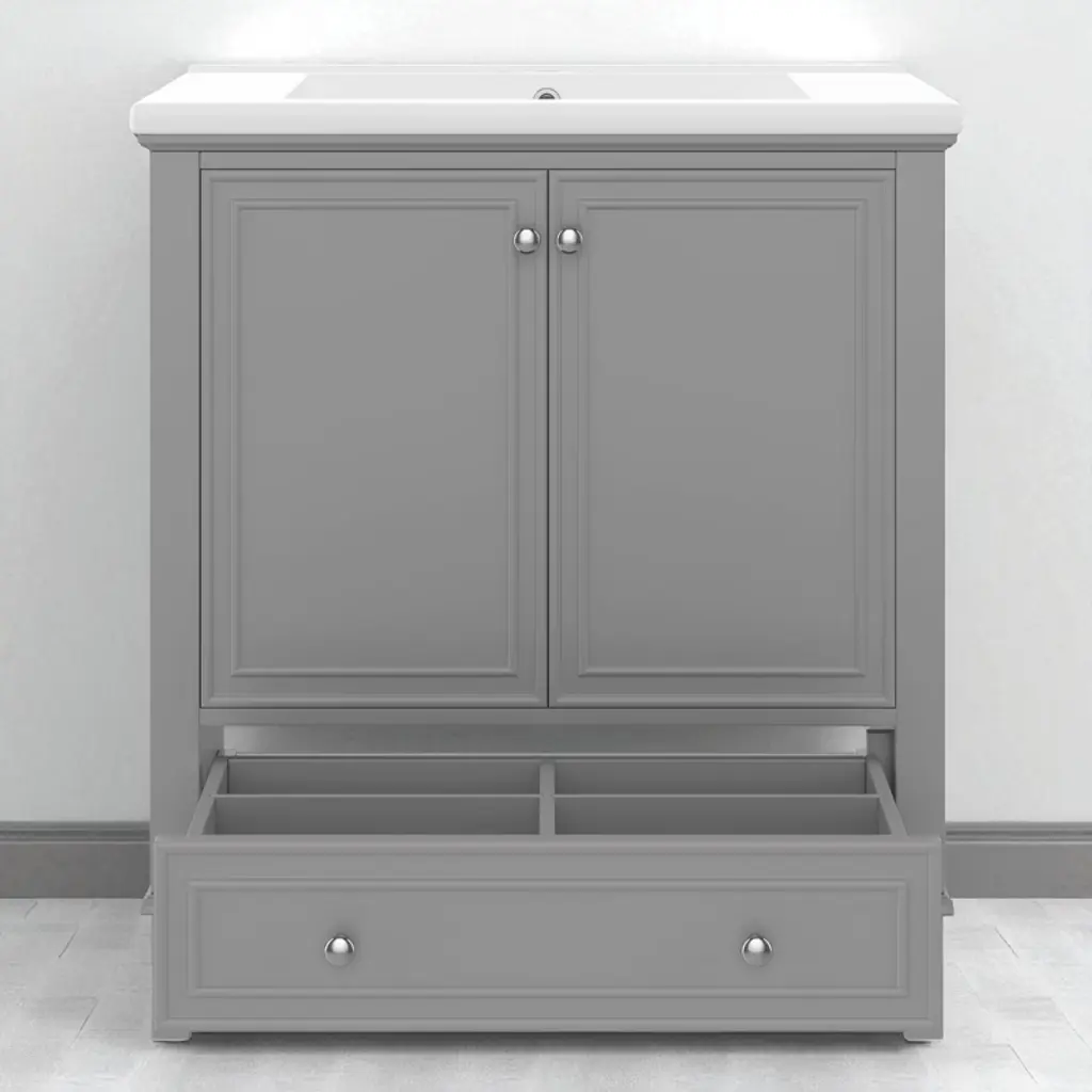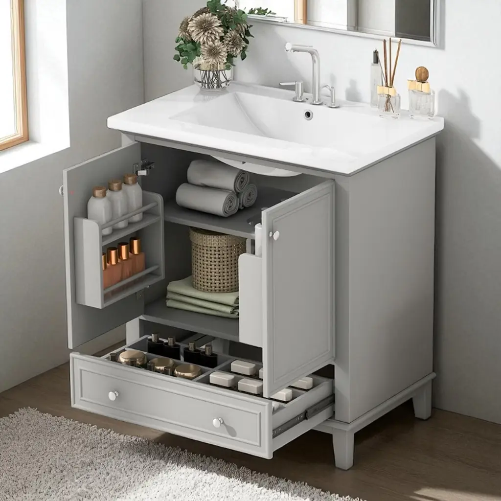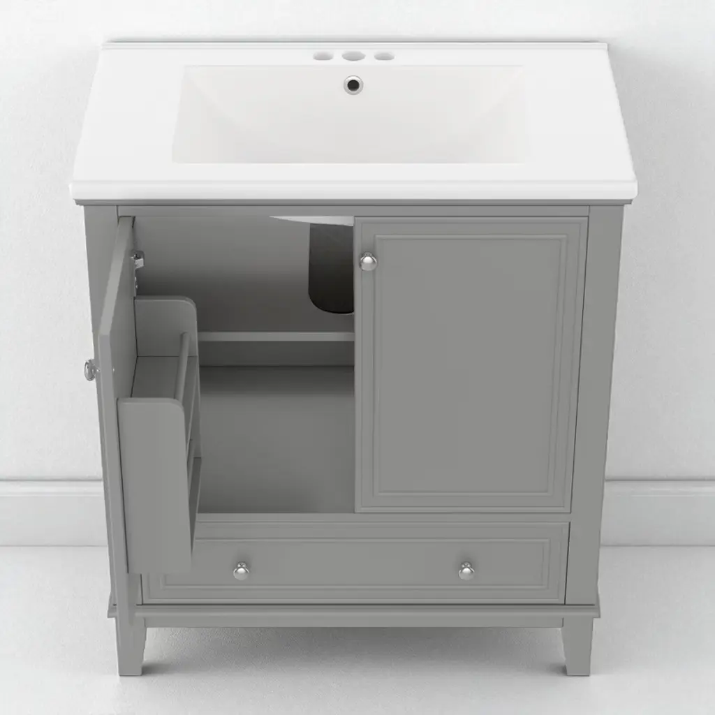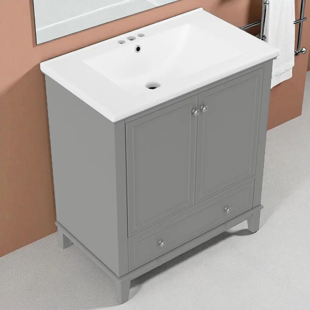 Product Overview:Bring modern functionality and elegant simplicity to your bathroom with this 30"" freestanding bathroom vanity. Featuring a solid wood frame and durable MDF construction, this vanity is finished in crisp white paint and topped with a smooth ceramic sink. The combination of concealed storage and adjustable features ensures a clutter-free, stylish environment perfect for modern lifestyles.Product Features:Smooth Ceramic Sink: The included white ceramic sink features a water-resistant, easy-to-clean surface with a pre-drilled 4"" centerset faucet hole (faucet not included). A built-in overflow with metal trim helps prevent accidental spills.Durable Solid Wood & MDF Construction: Built with a sturdy solid wood frame and reinforced MDF boards, this vanity is designed to withstand the humid conditions of a bathroom. The painted finish adds water and stain resistance for long-lasting use.Smart Storage Solutions: Behind the two cabinet doors is an adjustable shelf with three height settings, ideal for storing bathroom essentials of various sizes. Two-tier storage racks on each door offer added organization for smaller items.Functional Lower Drawer: A spacious drawer at the bottom features slide rails for smooth operation and a removable divider to help organize items like cosmetics, towels, or personal care products.Simple Assembly: The vanity comes in one package and includes all necessary hardware—stainless steel hinges, drawer slides, silver round knobs, and an anti-tip device—along with a detailed instruction manual for easy self-assembly.Specifications:Product Dimensions: 30"" L x 18.1"" W x 33.8"" HMaterial: Solid Poplar/Rubber Wood & MDF BoardFinish: White Painted FinishMounting Type: FreestandingSink Type: Undermount or Drop-In (included)Sink Location: CenterNumber of Doors: 2Number of Drawers: 1Adjustable Shelf: YesFaucet Mount: 4"" Centerset (not included)Weight Capacity: 200 lbsAssembly Required: YesCountry of Origin: VietnamCertification: CARB P2Suitable Scenarios:This vanity is ideal for modern bathrooms of all sizes, including powder rooms, guest baths, or small master bathrooms. Its clean lines and practical storage solutions make it a great fit for both new renovations and quick upgrades.Notes:Faucet is not included. Product color may vary slightly due to monitor settings or lighting. Please follow the included instructions carefully during assembly.
