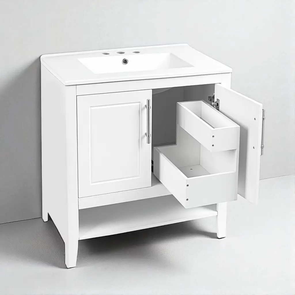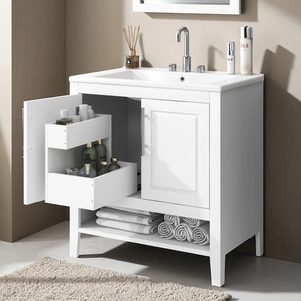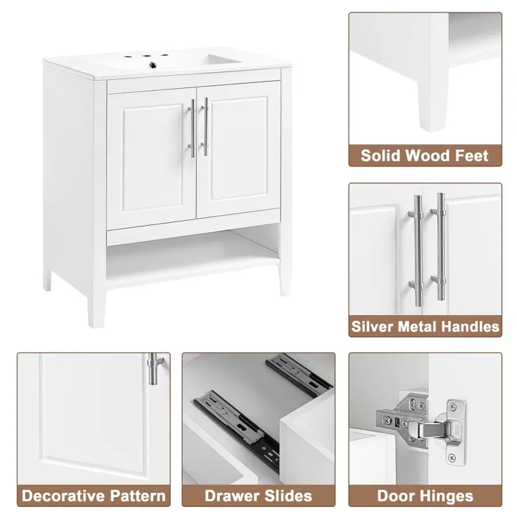 Product Overview:Add timeless elegance and modern functionality to your bathroom with this 30"" freestanding bathroom vanity. Featuring a solid wood frame and durable MDF board construction, this white vanity is finished with a smooth ceramic sink and equipped with two drawers, a cabinet with doors, and an open shelf for practical storage. Its minimalist aesthetic and silver hardware make it a versatile centerpiece for contemporary or transitional bathroom spaces.Product Features:Smooth Ceramic Sink: The integrated ceramic sink includes an overflow and is pre-drilled for an 8"" widespread faucet (not included). Its water-resistant and smooth surface resists stains and is easy to clean, maintaining a bright, polished look over time.Durable Construction: Made with a combination of solid rubber wood and high-quality MDF board, this vanity is built for moisture-rich bathroom environments. The painted finish provides water and stain resistance for added longevity.Ample Storage Space: Two lower drawers with smooth slides, an enclosed cabinet with double doors, and a bottom open shelf offer multiple storage options for keeping toiletries, towels, and other bathroom essentials neatly organized and easily accessible.Functional Drawer Design: Each drawer features a divided structure with two compartments (upper and lower), ideal for storing items of different sizes. Metal bar handles and stainless steel hinges ensure smooth and reliable operation.Simple Assembly: Shipped in one package with all hardware and a detailed instruction manual included. Designed for easy DIY assembly with clearly labeled parts and components.Specifications:Product Dimensions: 30"" L x 18.3"" W x 33"" HMaterial: Solid Rubber Wood, MDF Board, Ceramic SinkColor: WhiteMounting Type: FreestandingSink Type: Undermount or Drop-In (Included)Faucet Mount: 8"" Widespread (Not Included)Number of Doors: 2Number of Drawers: 2 (20 lbs capacity per drawer)Vanity Top Edge Thickness: 0.7""Top Weight: 28.66 lbsAssembly Required: YesCountry of Origin: VietnamCertifications: CARB P2Suitable Scenarios:Ideal for modern, transitional, or minimalistic bathroom spaces. Its compact footprint makes it perfect for smaller full baths, guest bathrooms, or apartment bathrooms without sacrificing essential storage and design appeal.Notes:Faucet is not included. Please follow the included instructions carefully during assembly. Product color may vary slightly due to lighting or monitor settings.