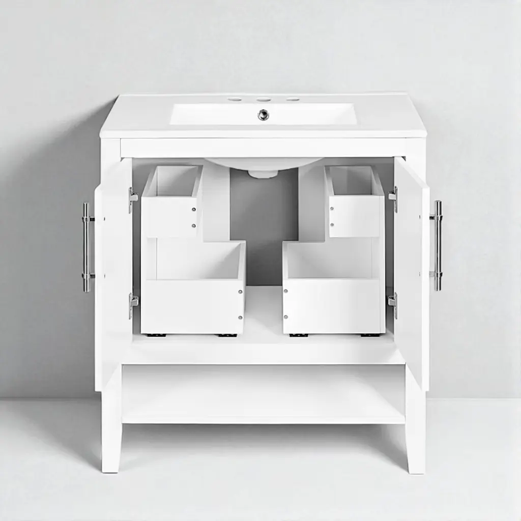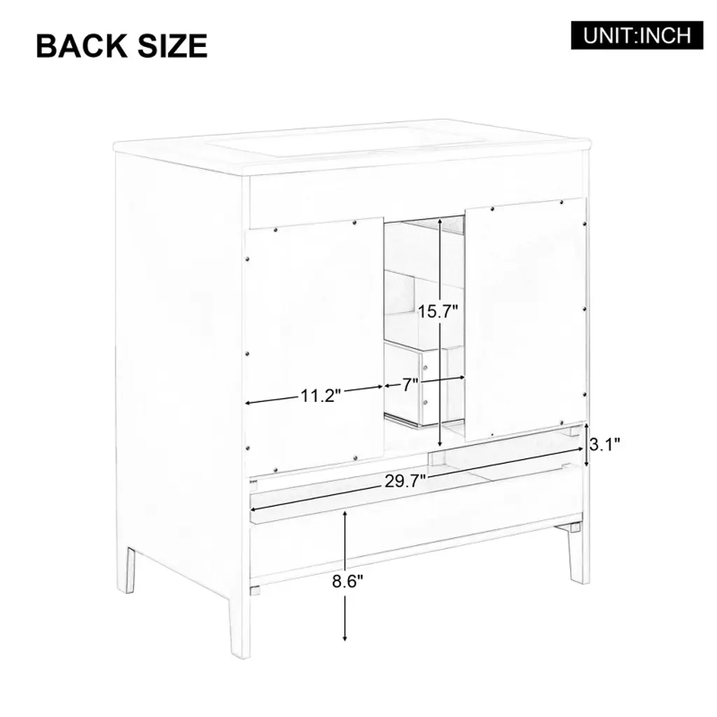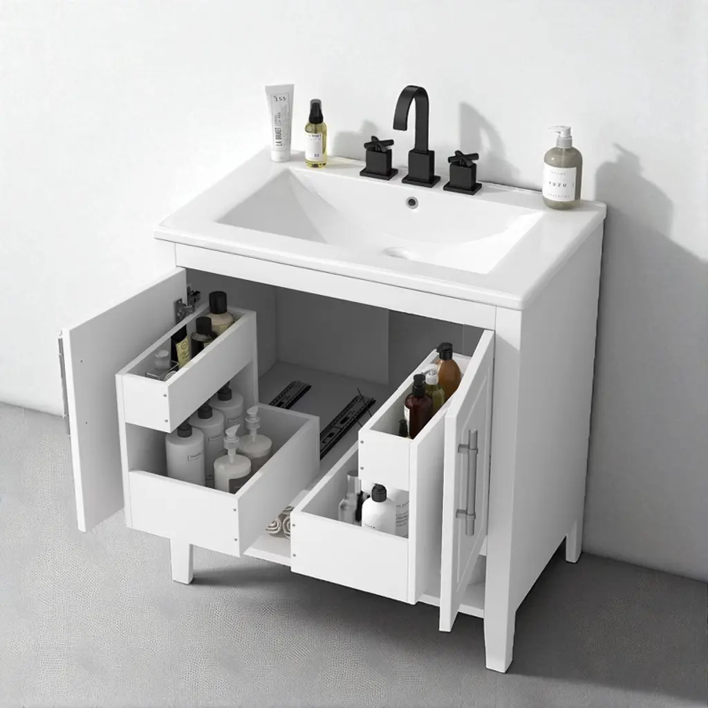 Product Overview:Add timeless elegance and modern functionality to your bathroom with this 30"" freestanding bathroom vanity. Featuring a solid wood frame and durable MDF board construction, this white vanity is finished with a smooth ceramic sink and equipped with two drawers, a cabinet with doors, and an open shelf for practical storage. Its minimalist aesthetic and silver hardware make it a versatile centerpiece for contemporary or transitional bathroom spaces.Product Features:Smooth Ceramic Sink: The integrated ceramic sink includes an overflow and is pre-drilled for an 8"" widespread faucet (not included). Its water-resistant and smooth surface resists stains and is easy to clean, maintaining a bright, polished look over time.Durable Construction: Made with a combination of solid rubber wood and high-quality MDF board, this vanity is built for moisture-rich bathroom environments. The painted finish provides water and stain resistance for added longevity.Ample Storage Space: Two lower drawers with smooth slides, an enclosed cabinet with double doors, and a bottom open shelf offer multiple storage options for keeping toiletries, towels, and other bathroom essentials neatly organized and easily accessible.Functional Drawer Design: Each drawer features a divided structure with two compartments (upper and lower), ideal for storing items of different sizes. Metal bar handles and stainless steel hinges ensure smooth and reliable operation.Simple Assembly: Shipped in one package with all hardware and a detailed instruction manual included. Designed for easy DIY assembly with clearly labeled parts and components.Specifications:Product Dimensions: 30"" L x 18.3"" W x 33"" HMaterial: Solid Rubber Wood, MDF Board, Ceramic SinkColor: WhiteMounting Type: FreestandingSink Type: Undermount or Drop-In (Included)Faucet Mount: 8"" Widespread (Not Included)Number of Doors: 2Number of Drawers: 2 (20 lbs capacity per drawer)Vanity Top Edge Thickness: 0.7""Top Weight: 28.66 lbsAssembly Required: YesCountry of Origin: VietnamCertifications: CARB P2Suitable Scenarios:Ideal for modern, transitional, or minimalistic bathroom spaces. Its compact footprint makes it perfect for smaller full baths, guest bathrooms, or apartment bathrooms without sacrificing essential storage and design appeal.Notes:Faucet is not included. Please follow the included instructions carefully during assembly. Product color may vary slightly due to lighting or monitor settings.
