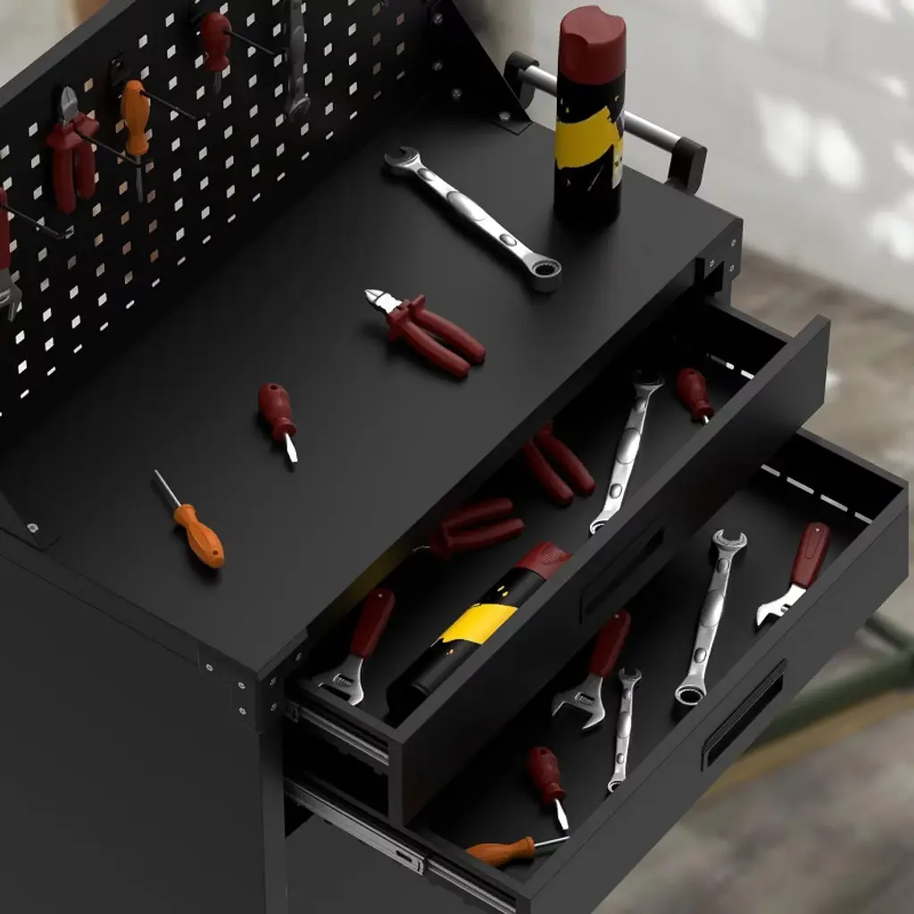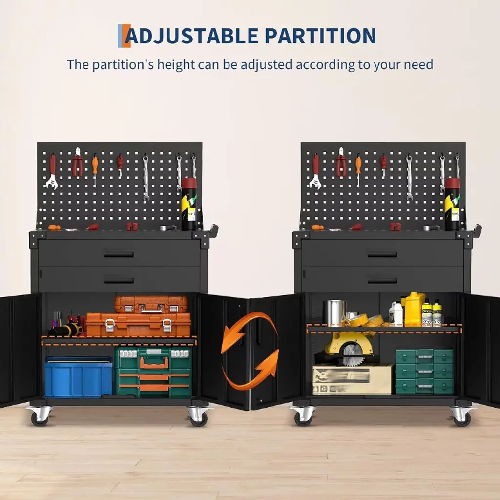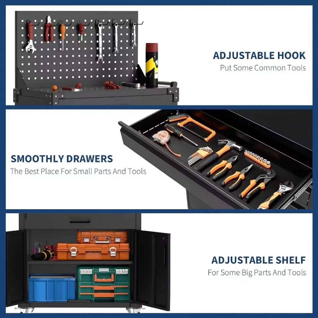 Introducing the 31.5" Metal Rolling Tool Cabinet, a robust and versatile storage solution designed to keep your tools organized and easily accessible. Crafted from cold rolled steel with a 0.6mm thick steel plate coating, this cabinet offers exceptional durability and long-lasting performance. Standing 35 inches high, it features a sleek black finish that complements any garage or workshop environment. This mobile tool chest is equipped with smooth-rolling wheels, allowing effortless mobility across your workspace. The cabinet includes two spacious drawers perfect for storing smaller tools and accessories, while the adjustable shelf inside the cabinet provides customizable storage options for larger items. The back mesh plate and pegboard enhance organization by offering additional space to hang tools and keep frequently used items within reach. Designed with practicality in mind, the cabinet features a sturdy plastic buckle for secure closure and reliable storage. Its low cabinet design maximizes space efficiency without sacrificing capacity, making it ideal for both professional mechanics and DIY enthusiasts. Key Features: - Durable cold rolled steel construction with 0.6mm thick steel plate coating for enhanced strength and corrosion resistance - 35-inch high cabinet with smooth-rolling wheels for easy mobility - Two spacious drawers for organized storage of small tools and parts - Adjustable shelf inside the cabinet for flexible storage options - Back mesh plate and pegboard for additional tool organization and accessibility - Secure plastic buckle closure ensures tools stay safely stored - Sleek black finish complements any garage or workshop setting Upgrade your workspace with this high-quality metal rolling tool cabinet that combines durability, mobility, and versatile storage options. Perfect for professionals and hobbyists alike, it keeps your tools organized, protected, and ready for action.