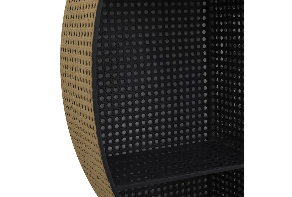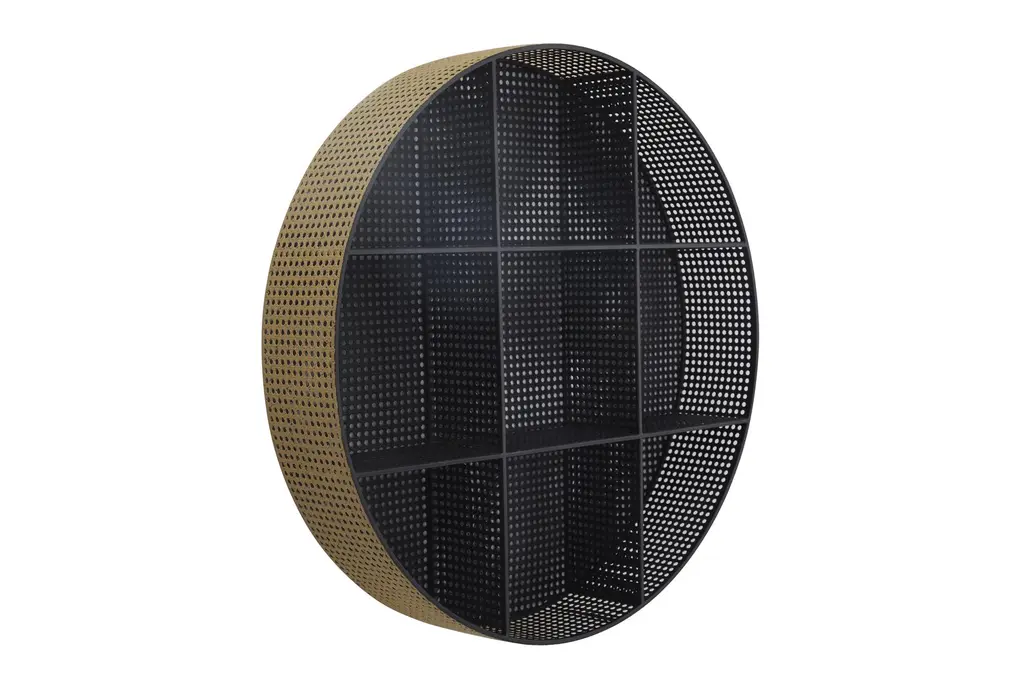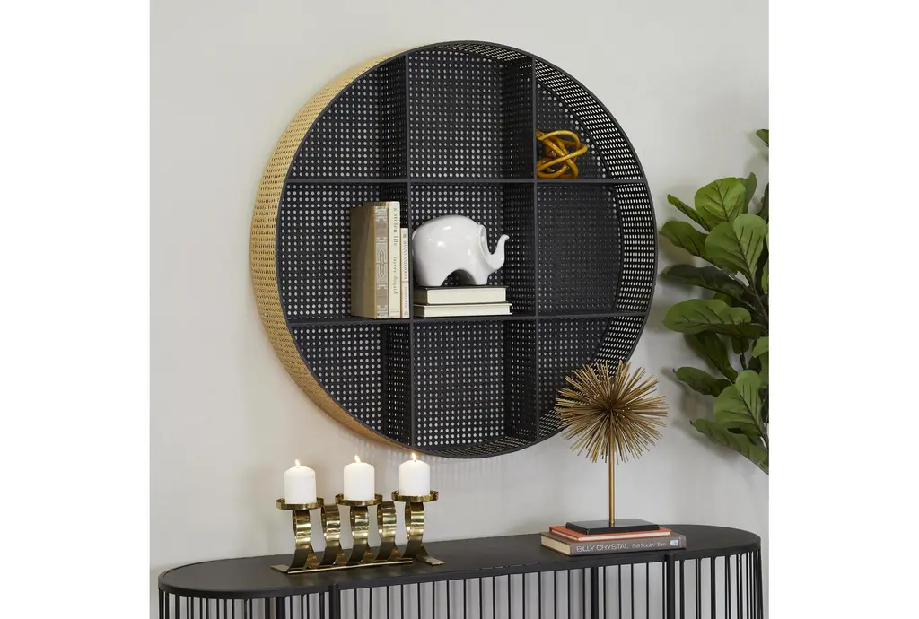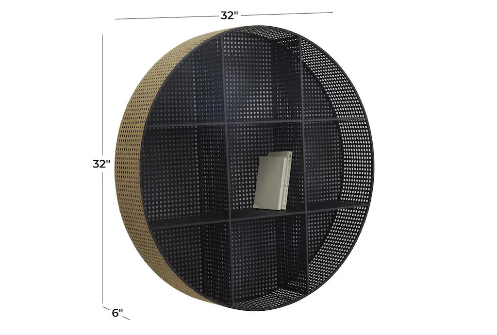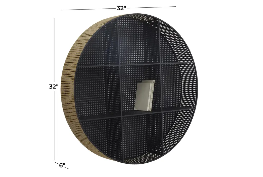 32x32 Black Gold Metal Faux Cane 9 Cubby Round Wall Shelf | Cube Storage | Curved