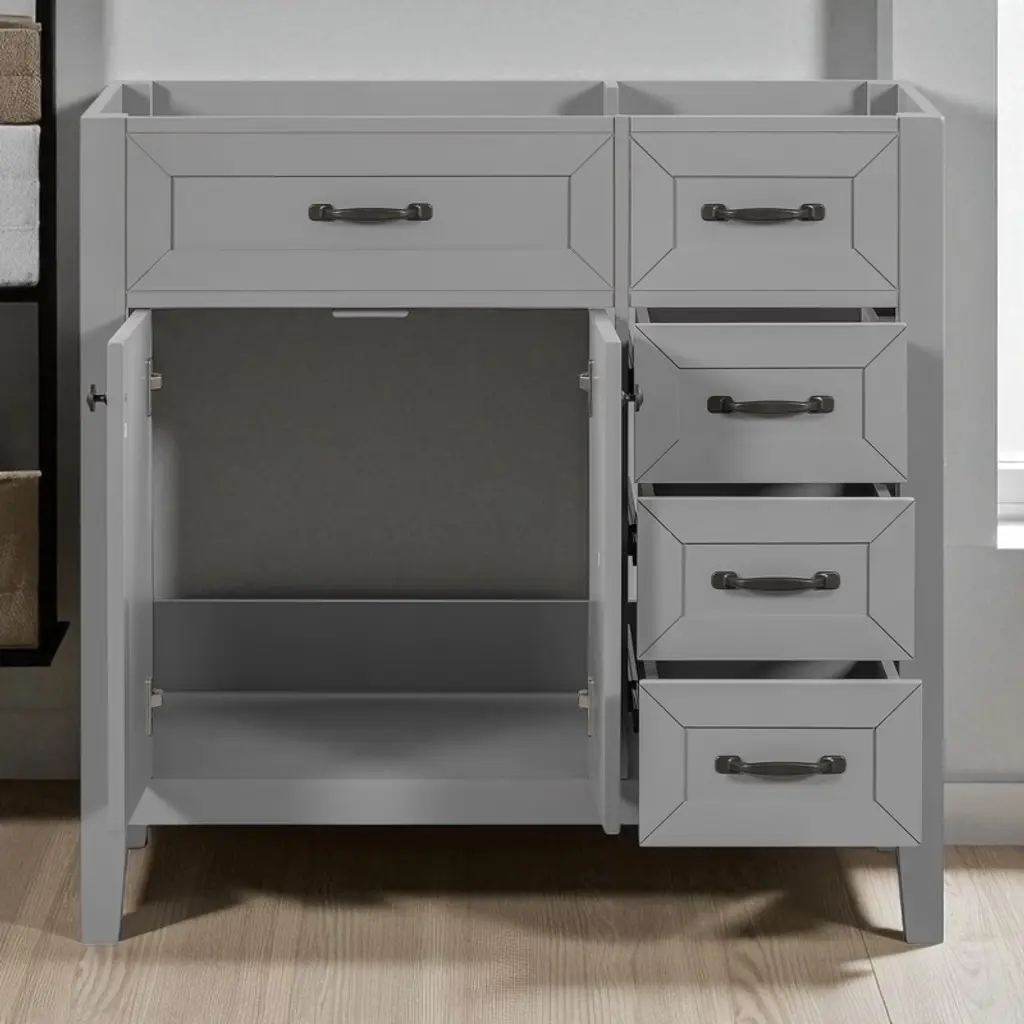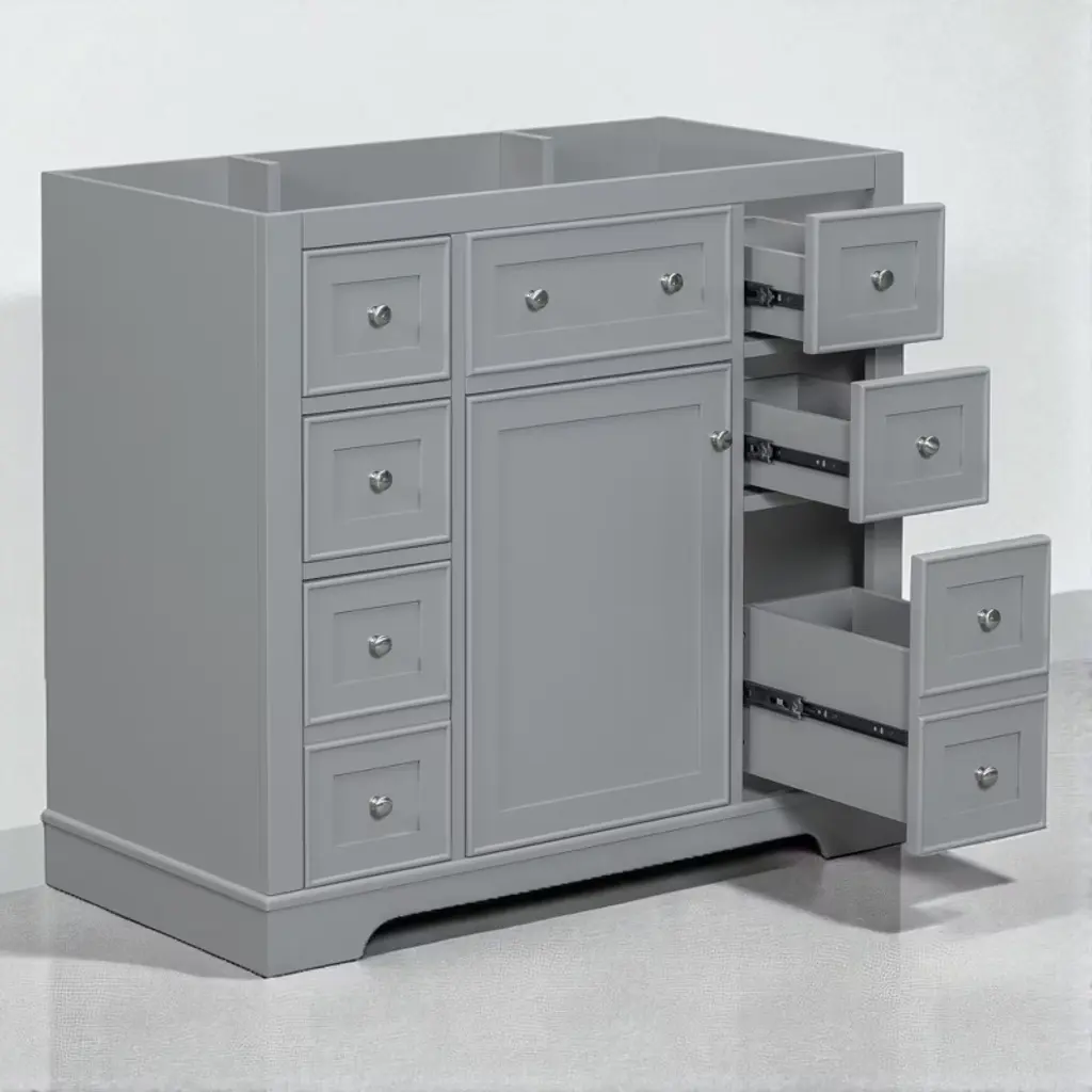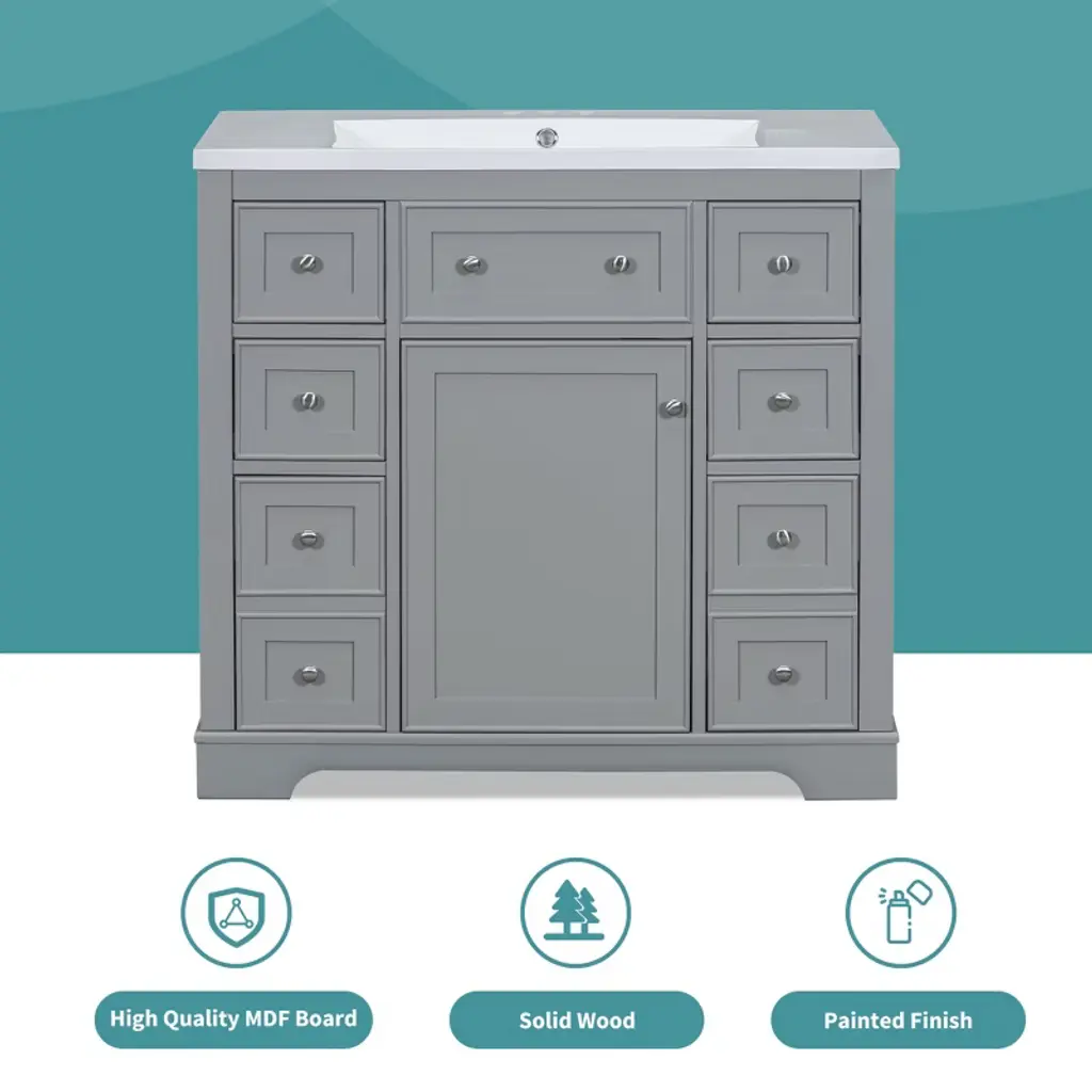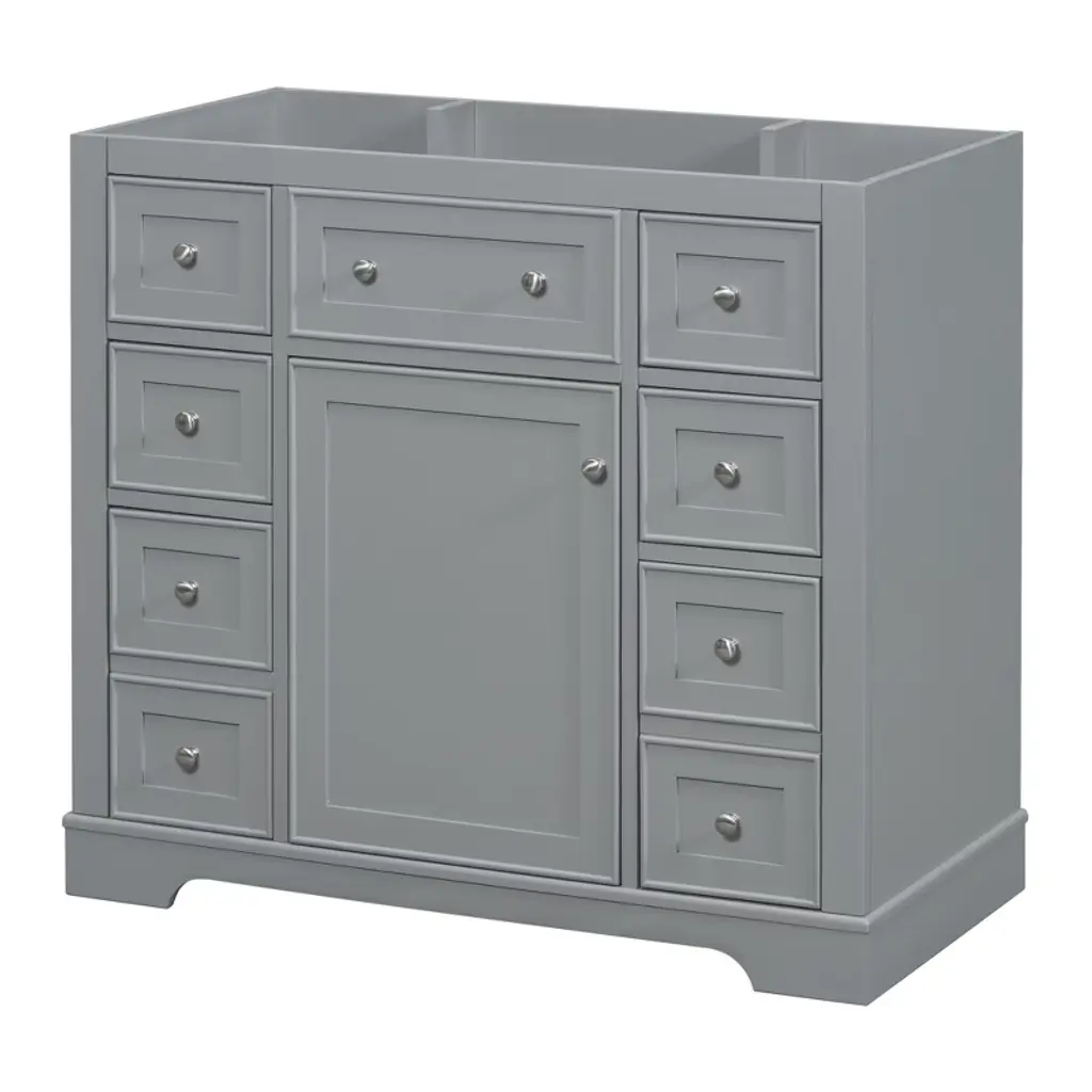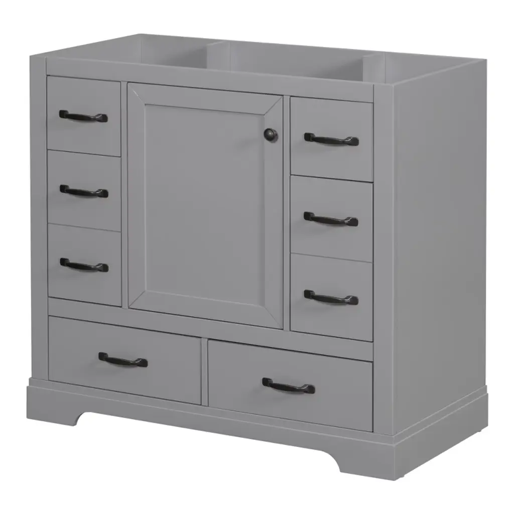 Product Overview:Enhance your bathroom with this modern 36-inch grey bathroom vanity base. Crafted from a durable combination of solid wood and MDF board, this freestanding vanity offers ample storage space and long-lasting quality. With its sleek painted finish and functional layout, it’s designed to organize bathroom essentials while elevating the look of your space. Please note: this listing includes the cabinet base only—sink and faucet are not included.Product Features:Durable Construction: Built with a solid wood frame and MDF panels for stability and durability. The water-resistant painted finish resists stains and moisture, making cleaning and maintenance simple.Ample Storage: Includes one cabinet with an adjustable shelf and six drawers—three on each side—for organizing toiletries, towels, and other bathroom necessities. The top middle drawer is decorative only.Adjustable Drawer Divider: The top two left drawers come with removable divider panels, allowing flexible customization of the interior layout to suit your storage needs.Premium Hardware: Equipped with stainless steel hinges, smooth drawer slides, and durable components for everyday use in a humid environment.Easy Assembly: Ships in one package with all hardware and a detailed instruction manual included. Designed for quick and straightforward assembly.Specifications:Color: GreyOverall Dimensions: 35.6"" L x 17.9"" W x 33.4"" HMaterial: Solid Wood + MDF BoardMounting Type: FreestandingSink Compatibility: Undermount; Drop-In (Sink Not Included)Sink Location: CenterNumber of Doors: 1Number of Drawers: 6 (Top middle drawer is decorative)Adjustable Shelf: YesCapacity: 200 lbsHardware Included: YesAssembly Required: YesCountry of Origin: VietnamCertification: CARB P2Chargeable Weight: 101.41 lbsSuitable Scenarios:This 36-inch vanity base is perfect for medium to large bathrooms seeking modern functionality and sleek aesthetics. Ideal for homeowners or remodelers looking to pair their own countertop or sink with a versatile cabinet base.Notes:Sink and faucet are not included.Assembly is required; tools and instructions are included in the package.