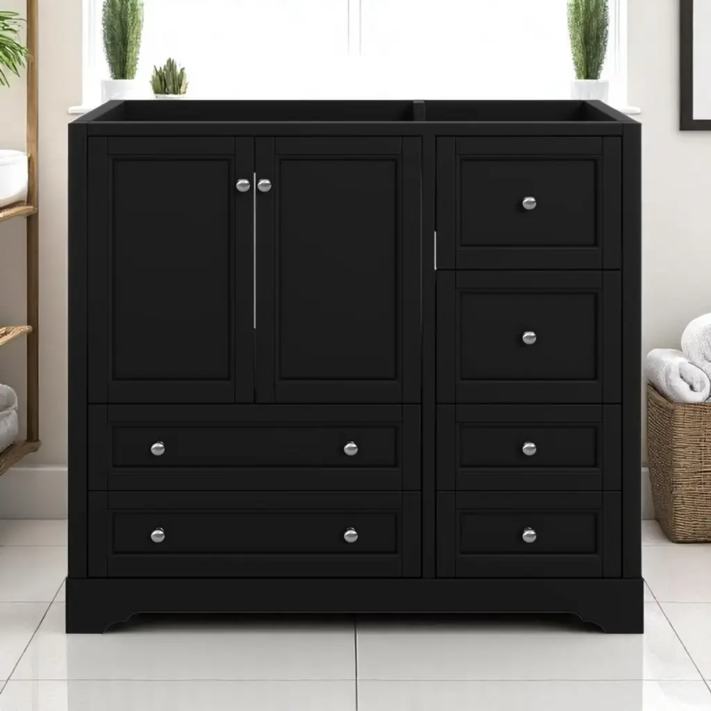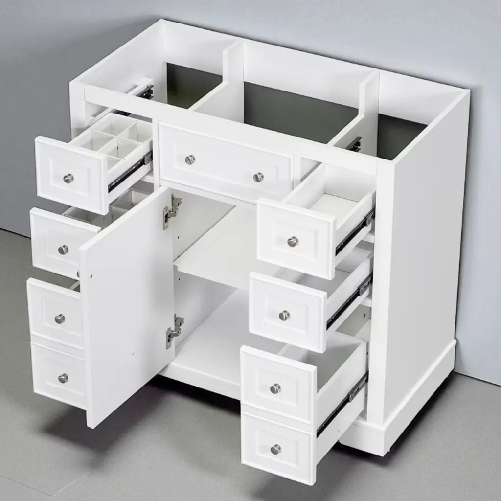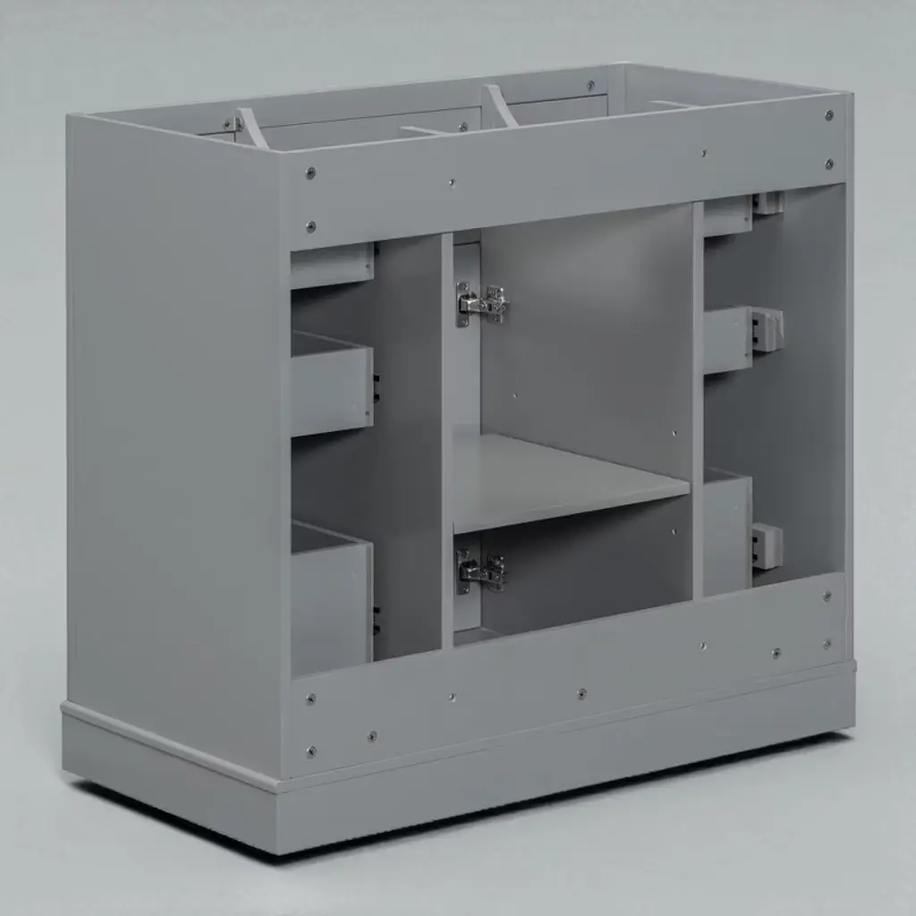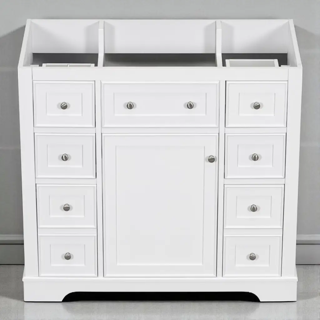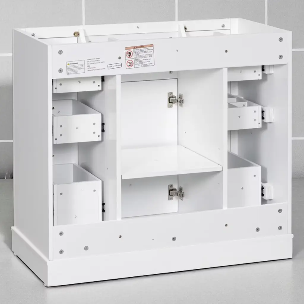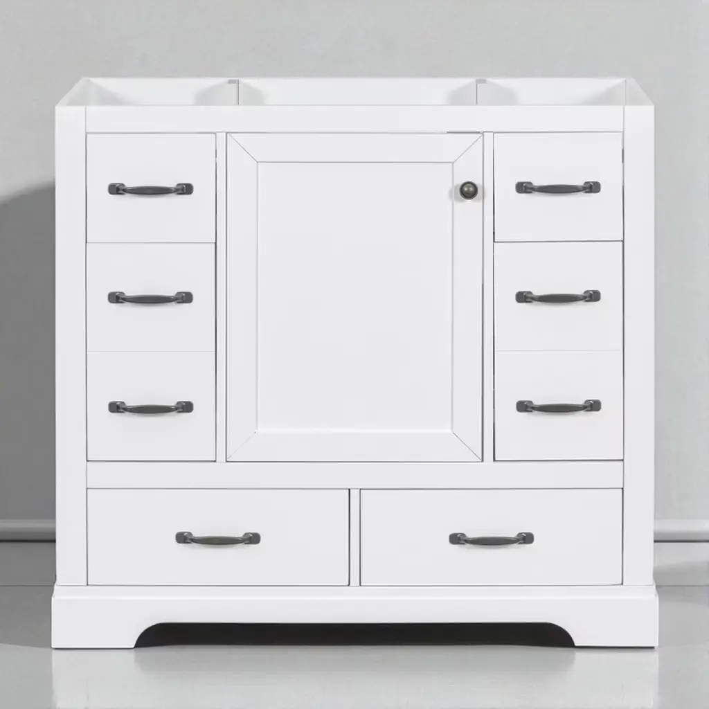 Product Overview:Enhance your bathroom with this modern 36-inch grey bathroom vanity base. Crafted from a durable combination of solid wood and MDF board, this freestanding vanity offers ample storage space and long-lasting quality. With its sleek painted finish and functional layout, it’s designed to organize bathroom essentials while elevating the look of your space. Please note: this listing includes the cabinet base only—sink and faucet are not included.Product Features:Durable Construction: Built with a solid wood frame and MDF panels for stability and durability. The water-resistant painted finish resists stains and moisture, making cleaning and maintenance simple.Ample Storage: Includes one cabinet with an adjustable shelf and six drawers—three on each side—for organizing toiletries, towels, and other bathroom necessities. The top middle drawer is decorative only.Adjustable Drawer Divider: The top two left drawers come with removable divider panels, allowing flexible customization of the interior layout to suit your storage needs.Premium Hardware: Equipped with stainless steel hinges, smooth drawer slides, and durable components for everyday use in a humid environment.Easy Assembly: Ships in one package with all hardware and a detailed instruction manual included. Designed for quick and straightforward assembly.Specifications:Color: GreyOverall Dimensions: 35.6"" L x 17.9"" W x 33.4"" HMaterial: Solid Wood + MDF BoardMounting Type: FreestandingSink Compatibility: Undermount; Drop-In (Sink Not Included)Sink Location: CenterNumber of Doors: 1Number of Drawers: 6 (Top middle drawer is decorative)Adjustable Shelf: YesCapacity: 200 lbsHardware Included: YesAssembly Required: YesCountry of Origin: VietnamCertification: CARB P2Chargeable Weight: 101.41 lbsSuitable Scenarios:This 36-inch vanity base is perfect for medium to large bathrooms seeking modern functionality and sleek aesthetics. Ideal for homeowners or remodelers looking to pair their own countertop or sink with a versatile cabinet base.Notes:Sink and faucet are not included.Assembly is required; tools and instructions are included in the package.