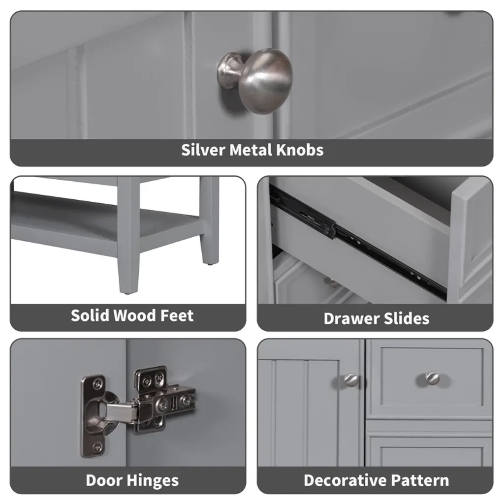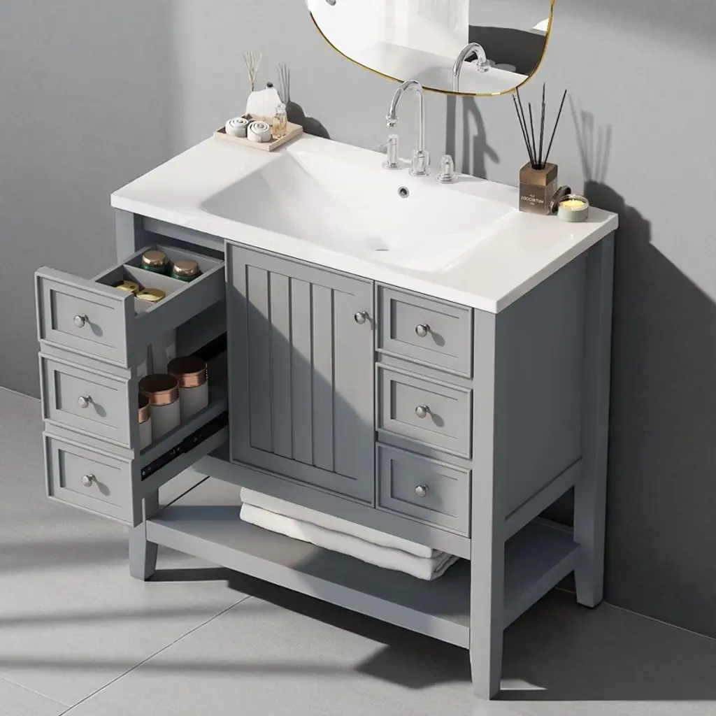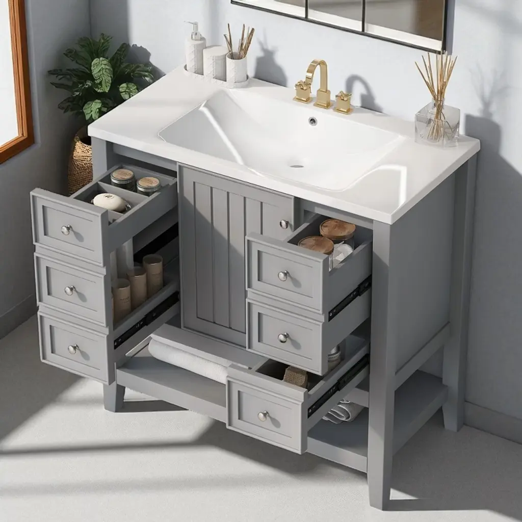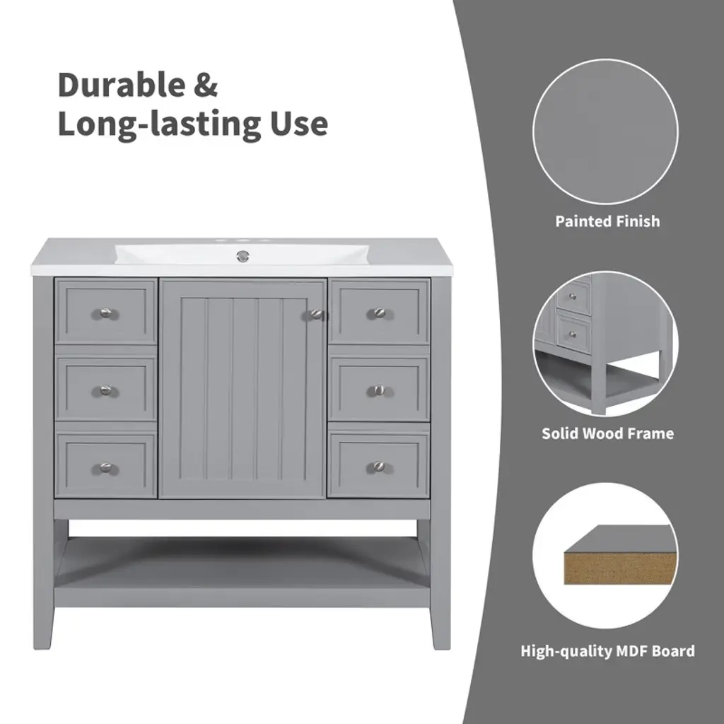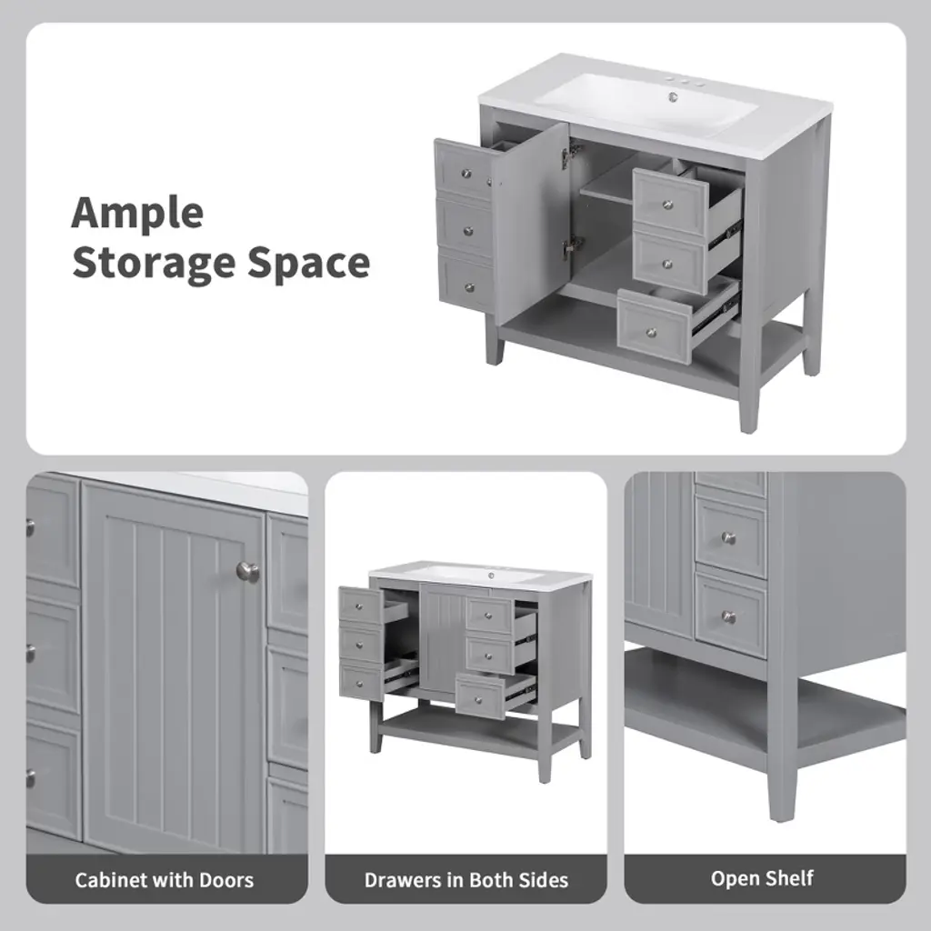 Product OverviewUpgrade your bathroom with this stylish 36"" Grey Bathroom Vanity, designed to offer both beauty and functionality. Crafted with solid poplar/rubber wood and MDF boards, this freestanding vanity features a sleek painted finish and a durable ceramic sink. The vanity includes three drawers, a cabinet with a door, and an adjustable shelf to keep your bathroom essentials organized and clutter-free. Its compact design makes it ideal for small to medium-sized bathrooms, providing ample storage without compromising on space.Product FeaturesDurable & Stylish Construction: Crafted with MDF panels, a solid wood frame, and legs, this vanity is designed for stability and long-lasting use. The smooth grey painted finish adds a clean, classic look that complements various bathroom styles.Ceramic Sink – Easy to Clean: The elegant white ceramic sink with a rounded basin is designed for easy cleaning and durability. The sink includes an integrated overflow and a 4"" centerset faucet mount, making it perfect for your bathroom (faucet not included).Smart Storage Options: With one cabinet, three functional drawers, and an adjustable shelf, this vanity provides flexible storage for toiletries, towels, and cleaning supplies. The drawers feature smooth slide rails for ease of use.Multi-functional Drawer Divider: The panels in the left drawers are removable and can be rearranged for customized storage, allowing you to organize your bathroom essentials as needed.Assembly Required: This vanity requires assembly, with all necessary hardware (screws, metal door hinges, handles, drawer slides, anti-toppling device, etc.) and clear instructions provided for easy setup.SpecificationsOverall Dimensions: 36.02"" L x 18.31"" W x 34.10"" HWeight: 116.40 lbsMaterial: Solid poplar/rubber wood, MDF, ceramic sinkStorage Features: One cabinet with a door, three drawers, and one adjustable shelfSink Dimensions: 36.02"" L x 18.31"" W x 4.7"" HFaucet Mount: 4"" Centerset (faucet not included)Weight Capacity: Shelf: 20 lbs, Overall: 200 lbsAssembly Required: YesSuitable ScenariosIdeal for small to medium-sized bathrooms, offering a stylish yet functional solutionPerfect for homes with limited space that require an efficient and space-saving vanityGreat for modern, transitional, or even rustic bathroom decorsExcellent for individuals or families looking to add ample storage while maintaining a clean, stylish appearance in the bathroomNotesAssembly required; all parts, hardware, and instructions are included in the package.Color may vary slightly due to lighting or monitor display settings.Ensure the vanity is placed on a level surface for optimal stability and function.Use care when assembling to avoid damaging the surface. Follow instructions carefully during setup.