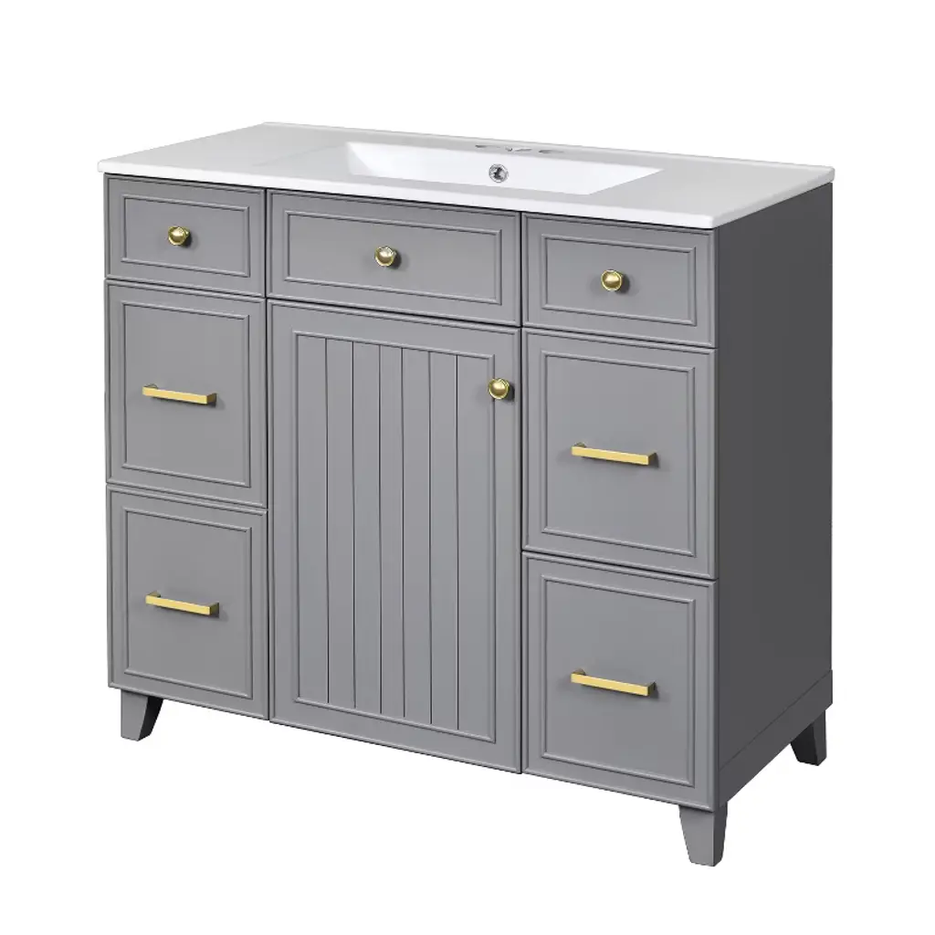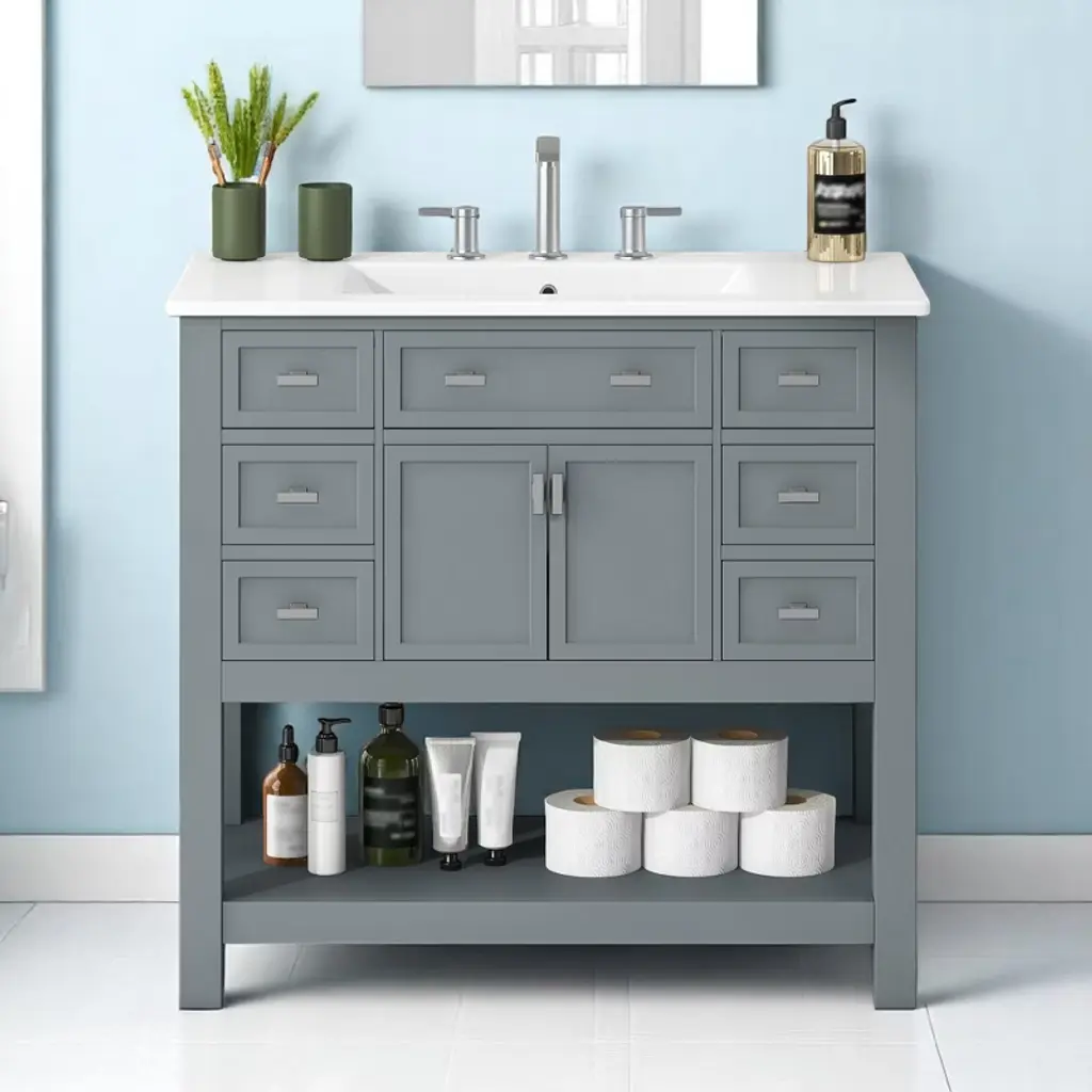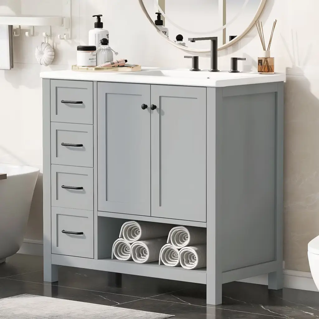 Product Overview Enhance your bathroom with this elegant 36" freestanding vanity, designed for both durability and functionality. Crafted from solid poplar, rubber wood, and high-quality MDF boards, it features a painted finish that’s water- and stain-resistant. The vanity includes a ceramic sink with a sleek rectangular shape and a spacious design, perfect for daily use. Its modern style and ample storage make it a standout piece in any bathroom renovation or upgrade. Product Features Durable Materials: Constructed from solid poplar, rubber wood, and MDF board with a smooth painted finish for long-lasting performance and easy maintenance. Spacious Ceramic Sink: The white ceramic sink features an integrated overflow, flat edge, and 4" centerset faucet compatibility (faucet not included). Its half-moon design maximizes basin space. Ample Storage: Includes one cabinet with door, one functional drawer on the left, two drawers on the right, and a lower open shelf—ideal for organizing towels, toiletries, and other essentials. Customizable Drawer Divider: The left drawer features removable and repositionable panels to accommodate various storage needs. Soft-Close Hinges: Built-in hardware ensures smooth and quiet door operation, reducing wear over time. Easy Assembly: Comes with all necessary hardware and clear instructions. Includes anti-tip device for added safety. Specifications Color: Grey Material: Solid Poplar, Rubber Wood, MDF Board, Ceramic Vanity Dimensions: 36.02"L x 18.31"W x 34.10"H Cabinet Base: 35.50"L x 18.00"W x 32.90"H Sink Top: 36.02"L x 18.31"W x 4.7"H Edge Thickness: 0.7" Faucet Mount: 4" Centerset (faucet not included) Sink Type: Undermount / Drop-in Sink Location: Center Number of Sinks: Single Number of Doors: 1 Number of Drawers: 3 Adjustable Shelf: Yes Mounting Type: Freestanding Finish: Painted Style: Modern Capacity: 200 lbs Weight: 116.4 lbs Top Weight: 35 lbs Top Depth: 6.69" Assembly: Required Country of Origin: Vietnam Suitable Scenarios Perfect for modern bathrooms, powder rooms, or guest bathrooms seeking extra storage and style. Ideal for homeowners needing both drawer and cabinet space in a compact freestanding vanity design. Notes Assembly is required. All hardware and instructions are included. Faucet not included. Actual color may vary slightly due to lighting or monitor settings.