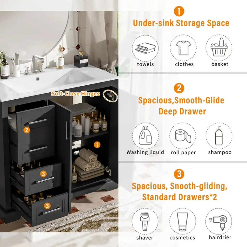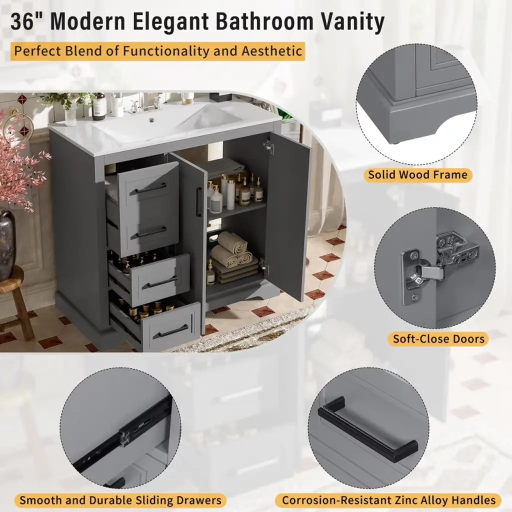36" Bathroom Vanity With Ceramic Sink, Solid Wood Frame, 2 Soft Close Doors, 3 Drawers, Adjustable Shelf, Modern Freestanding Cabinet