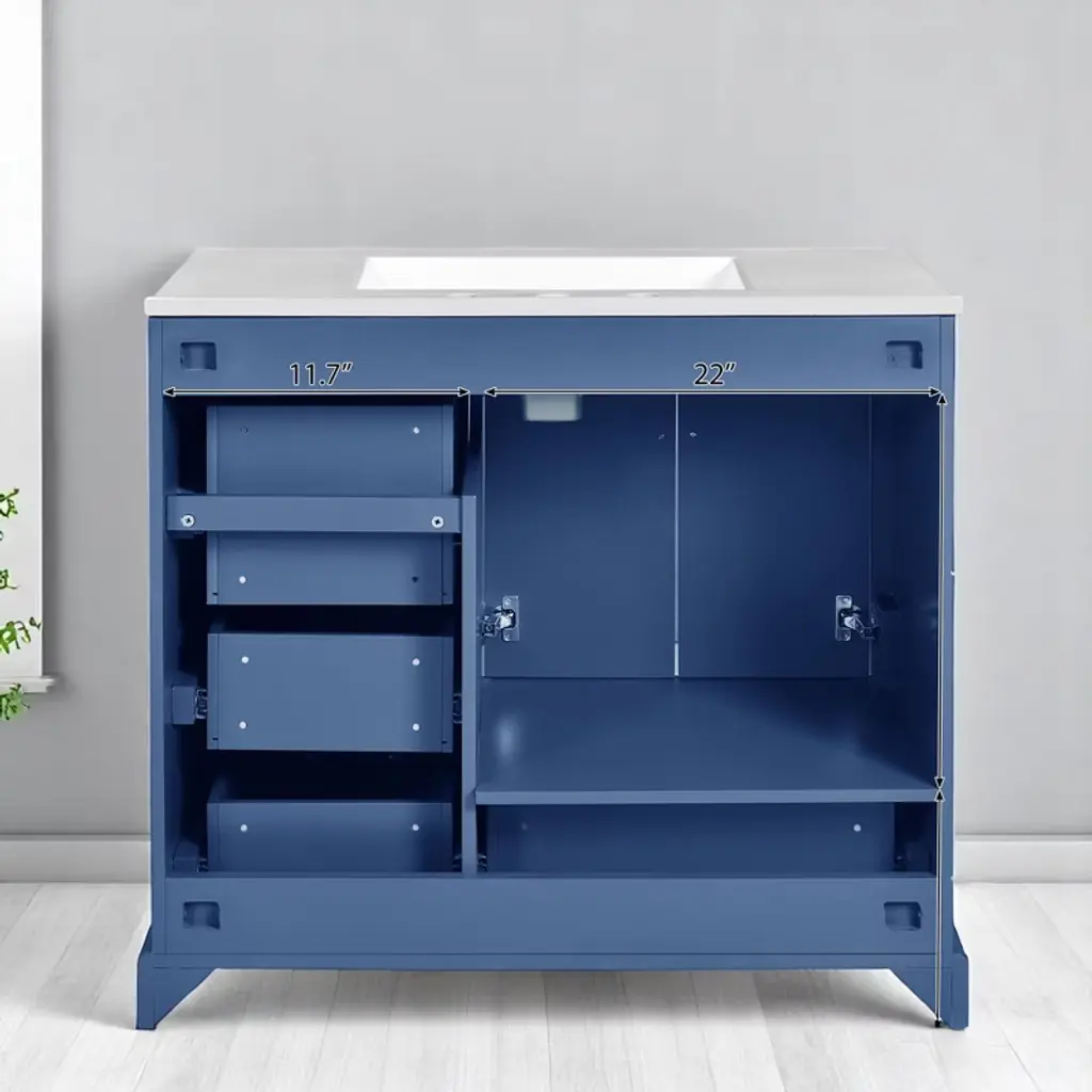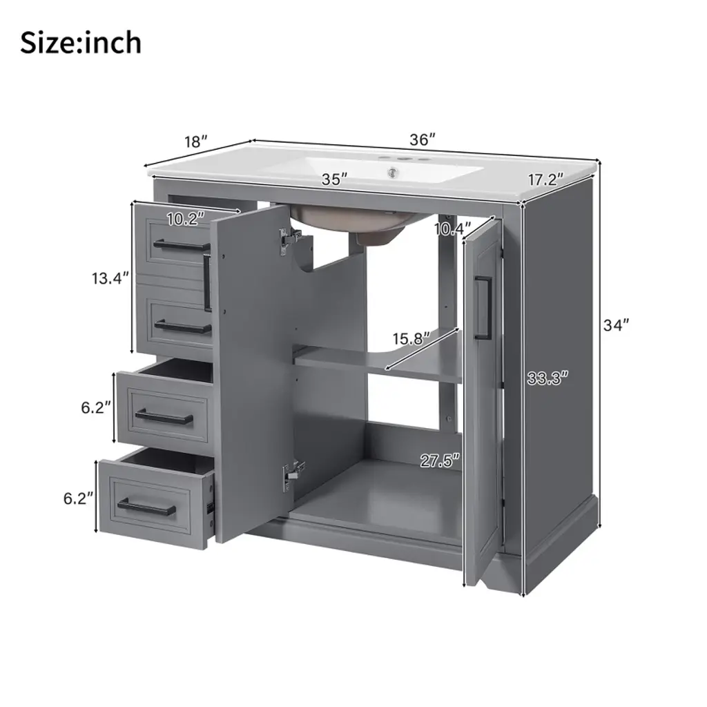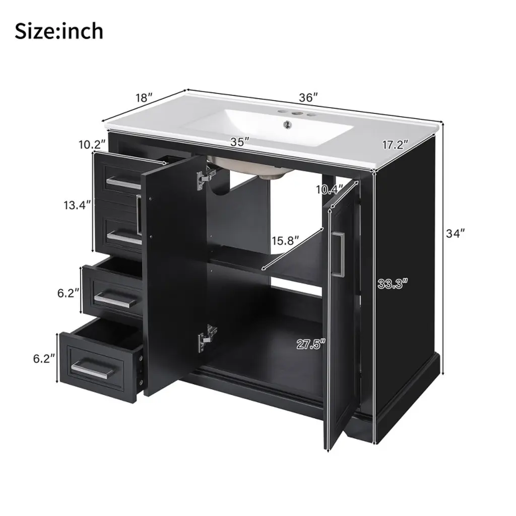 Product Introduction This 36-inch bathroom vanity combines modern elegance with functional design. Built with a solid wood frame and MDF, it features a ceramic sink, versatile storage, and durable construction, making it a stylish and practical upgrade. Product Features - Perfect Size: 36"W x 18"D x 34"H, offering generous storage and a balanced footprint. - Premium Ceramic Sink: Smooth, stain-resistant glaze is easy to clean and built to last. - Overflow Protection: Sink includes an overflow hole to prevent spills and keep your bathroom dry. - Solid Construction: Solid wood feet and MDF cabinet ensure stability and long-term durability. - Ample Storage: Equipped with 3 drawers, an adjustable shelf, and spacious under-sink storage. - Elegant Hardware: Matte black zinc alloy handles provide a refined, modern touch. - Quiet Operation: Soft-close doors and drawers close smoothly, reducing noise and wear. - Hassle-Free Assembly: Comes with clear instructions for quick two-person setup. Specifications - Overall Vanity: 36"W x 18"D x 34"H, 121.25 lbs - Sink: 36"W x 18"D x 6.8"H, 37.48 lbs - Cabinet: 35"W x 17.2"D x 33.3"H, 83.77 lbs - Weight Capacity: Shelf 35 lbs, Drawer 35 lbs, Overall 200 lbs Note Faucet not included. Please allow slight size and color variations due to manual measurement and display differences. Two-person assembly recommended.