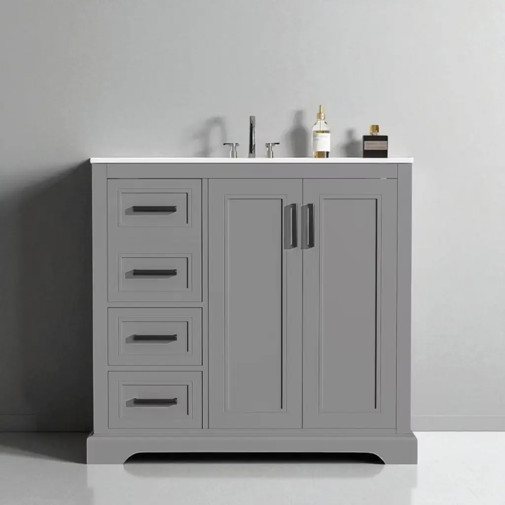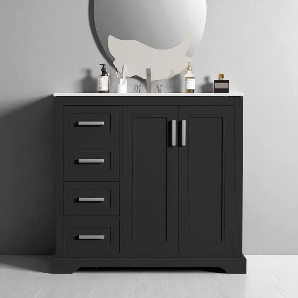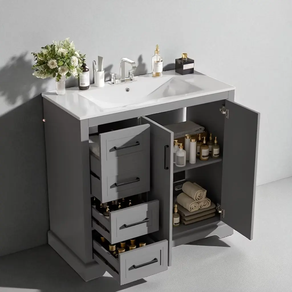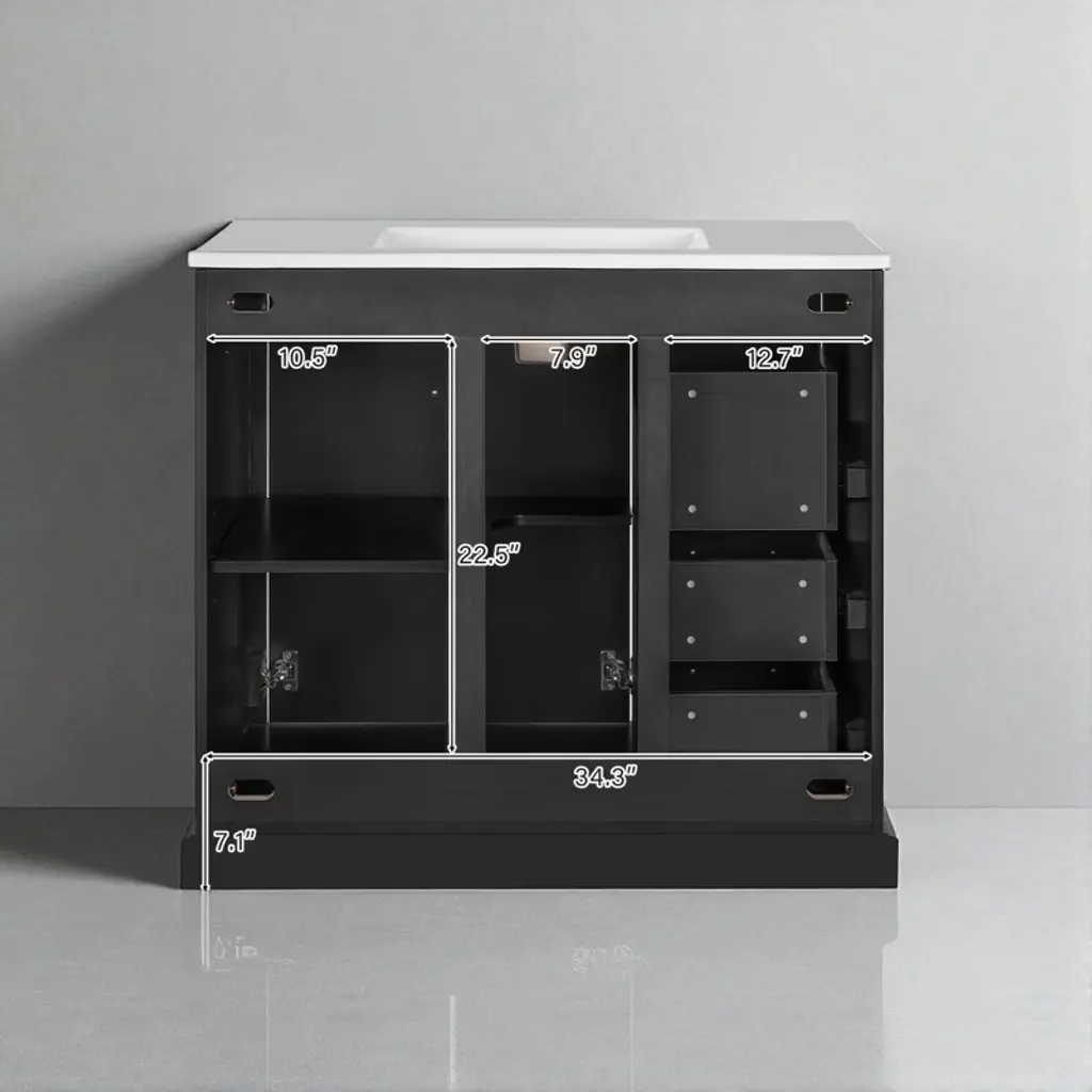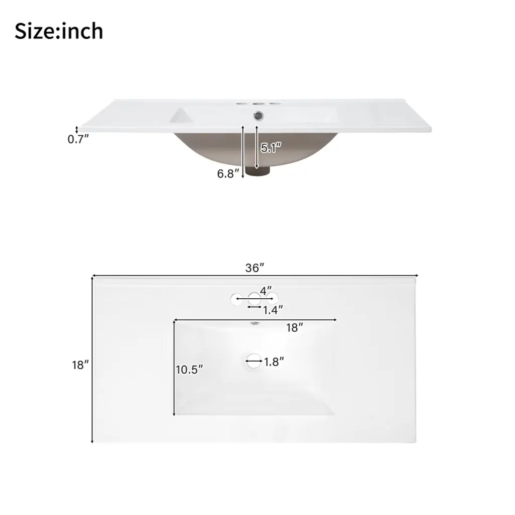 Product Introduction This 36-inch bathroom vanity combines modern elegance with functional design. Built with a solid wood frame and MDF, it features a ceramic sink, versatile storage, and durable construction, making it a stylish and practical upgrade. Product Features - Perfect Size: 36"W x 18"D x 34"H, offering generous storage and a balanced footprint. - Premium Ceramic Sink: Smooth, stain-resistant glaze is easy to clean and built to last. - Overflow Protection: Sink includes an overflow hole to prevent spills and keep your bathroom dry. - Solid Construction: Solid wood feet and MDF cabinet ensure stability and long-term durability. - Ample Storage: Equipped with 3 drawers, an adjustable shelf, and spacious under-sink storage. - Elegant Hardware: Matte black zinc alloy handles provide a refined, modern touch. - Quiet Operation: Soft-close doors and drawers close smoothly, reducing noise and wear. - Hassle-Free Assembly: Comes with clear instructions for quick two-person setup. Specifications - Overall Vanity: 36"W x 18"D x 34"H, 121.25 lbs - Sink: 36"W x 18"D x 6.8"H, 37.48 lbs - Cabinet: 35"W x 17.2"D x 33.3"H, 83.77 lbs - Weight Capacity: Shelf 35 lbs, Drawer 35 lbs, Overall 200 lbs Note Faucet not included. Please allow slight size and color variations due to manual measurement and display differences. Two-person assembly recommended.