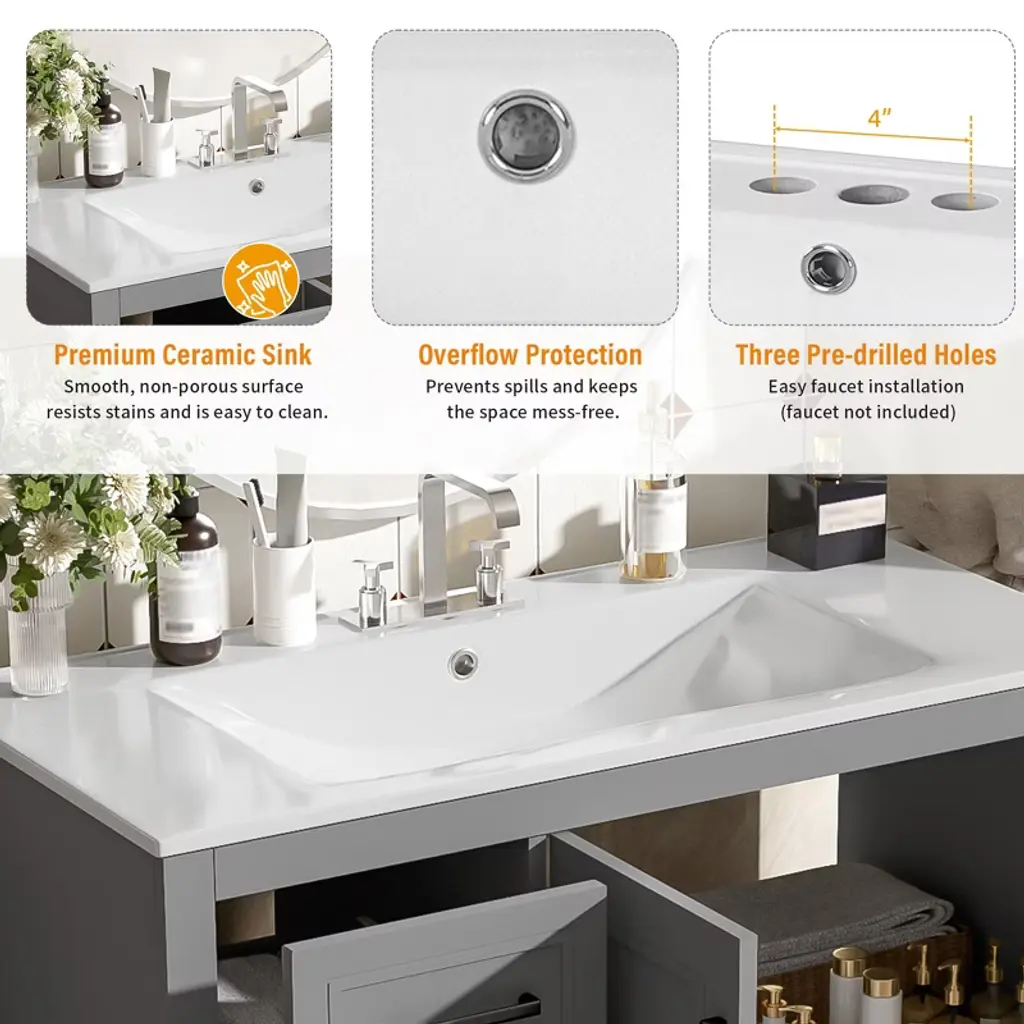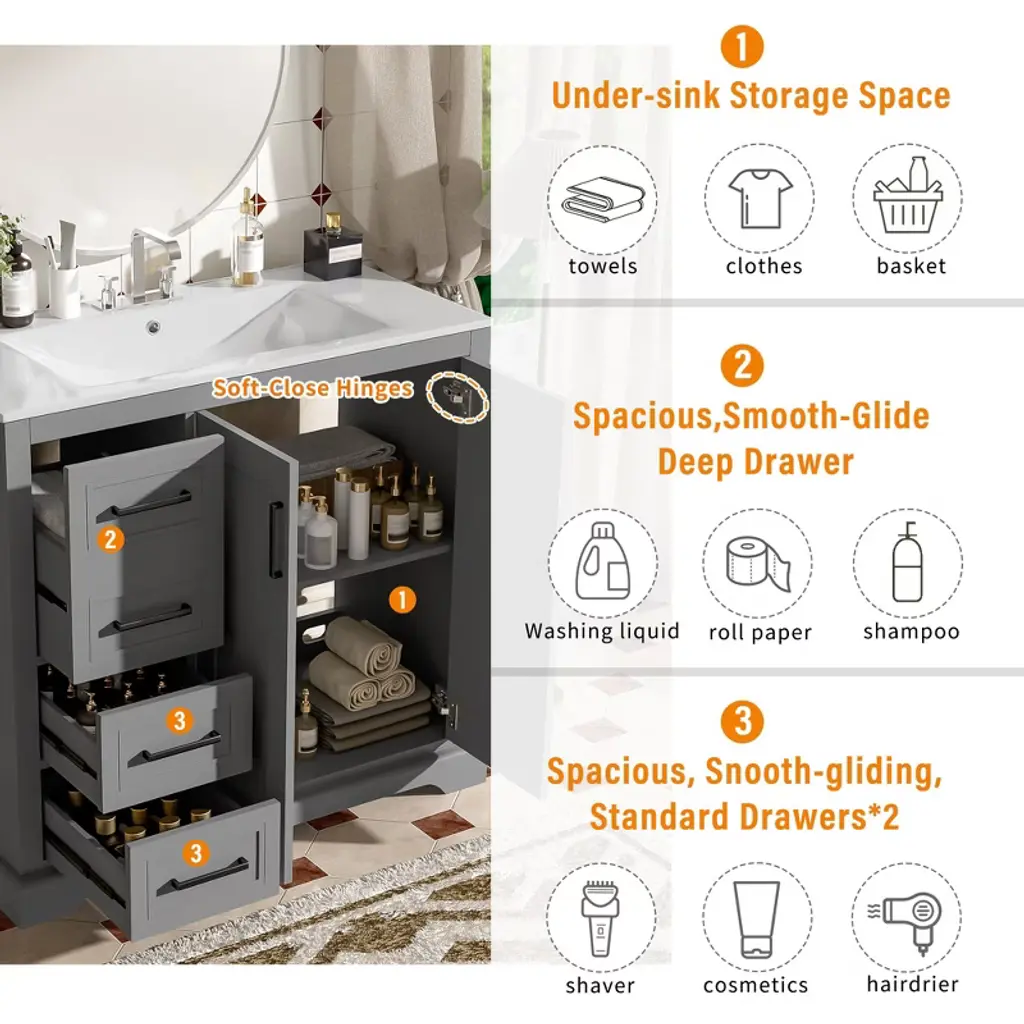 36" Bathroom Vanity With Ceramic Sink, Solid Wood Frame, 2 Soft Close Doors, 3 Drawers, Adjustable Shelf, Modern Freestanding Cabinet
