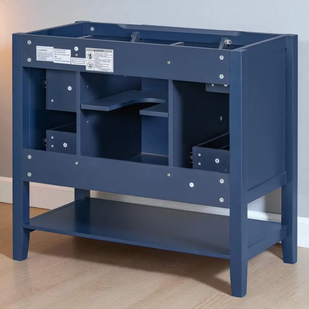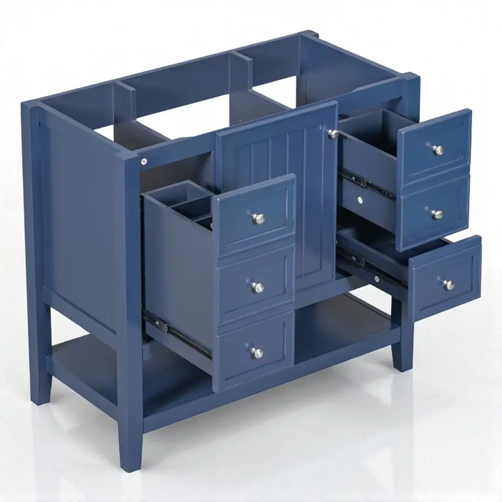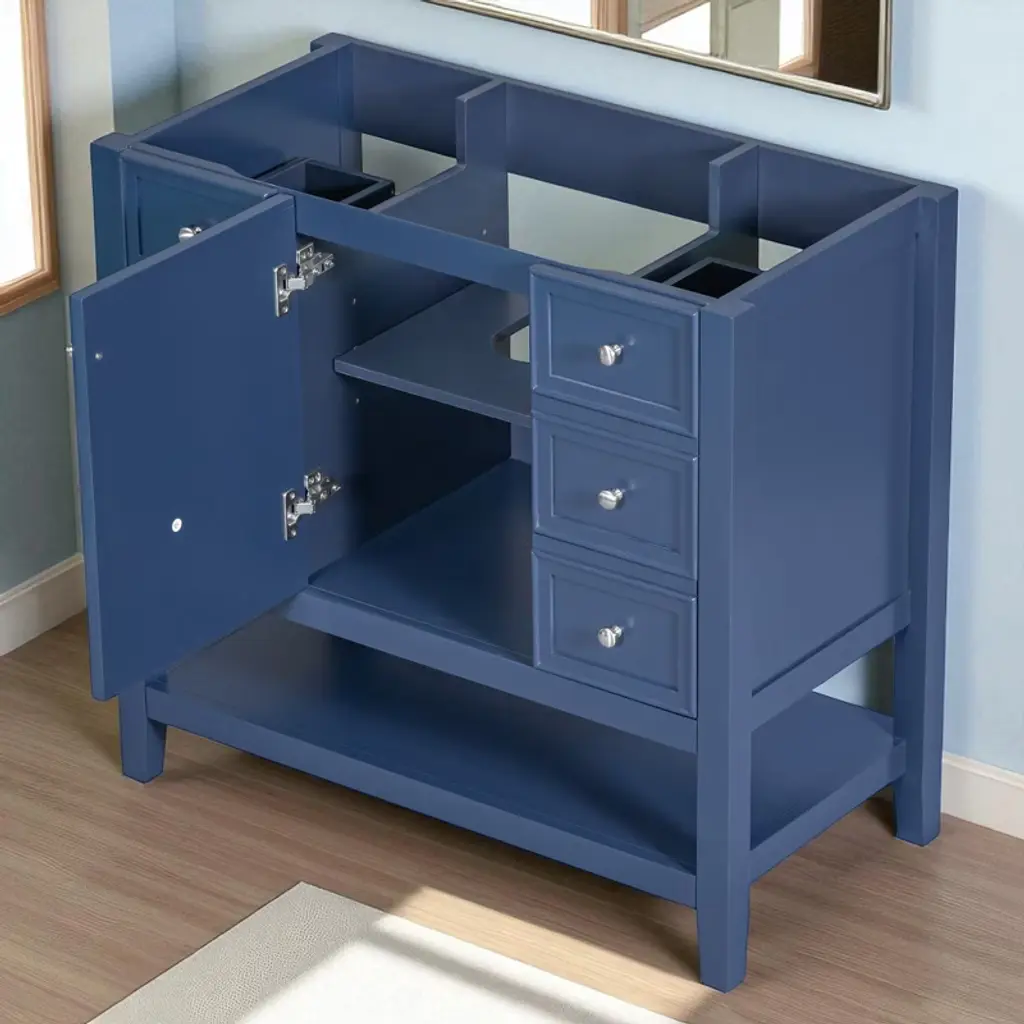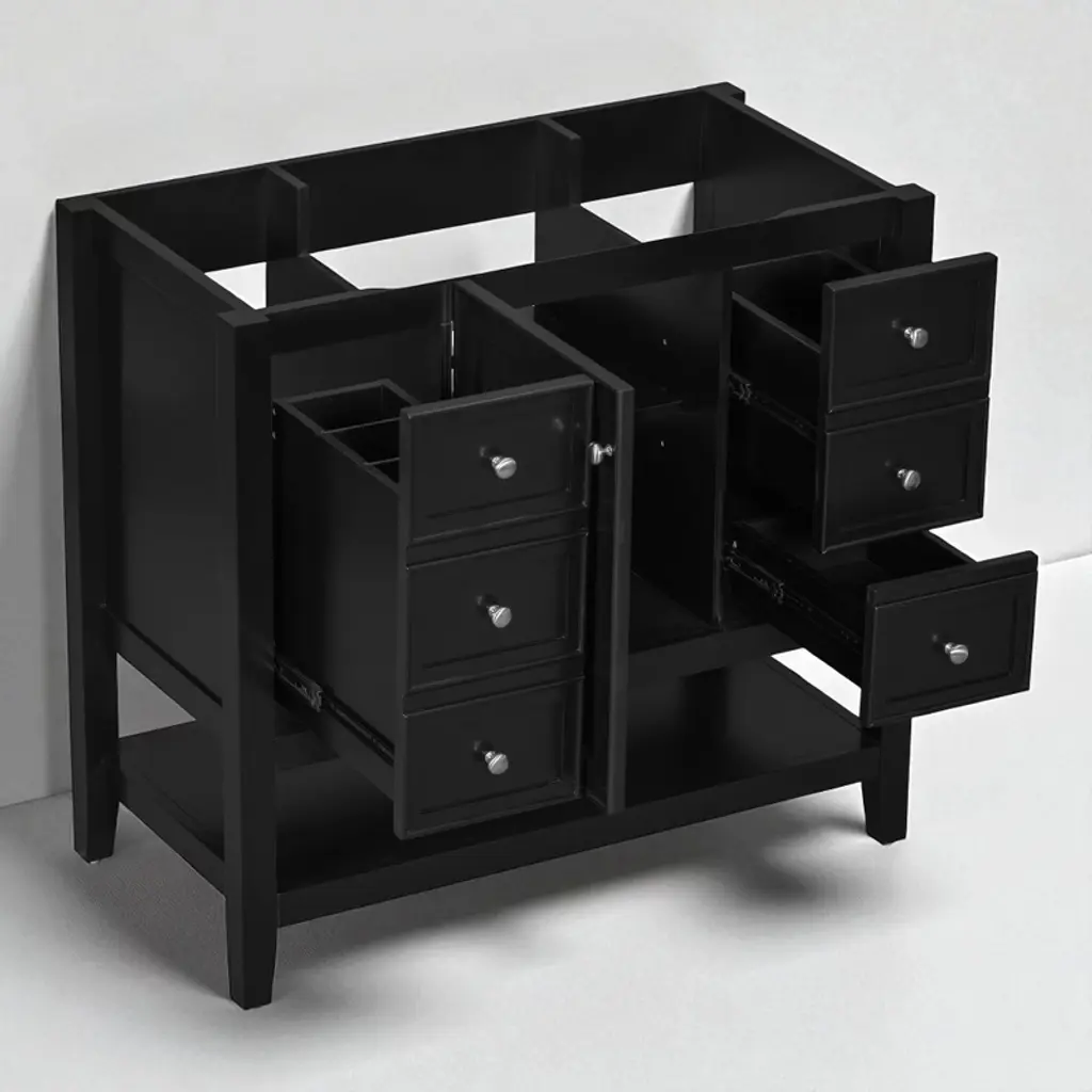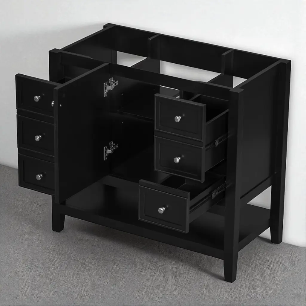 Product Overview:Upgrade your bathroom with this 36"" freestanding vanity cabinet base, designed to bring modern elegance and versatile storage to any bathroom. Crafted from a combination of solid poplar/rubber wood and MDF board, this black-painted vanity features one cabinet door, three drawers, and a lower open shelf—perfect for organizing your bathroom essentials. Please note: sink top is not included, giving you the flexibility to choose your own.Product Features:Premium Materials: Built with solid wood and durable MDF board, this vanity is crafted for longevity. The painted finish adds a sleek, water-resistant surface that’s easy to clean and stain-resistant.Ample Storage Options: Includes one cabinet with door, one functional drawer on the left with removable dividers, two drawers on the right with smooth slide rails, and a bottom open shelf—perfect for storing towels, toiletries, or decorative items.Flexible Organization: The left drawer includes customizable dividers, allowing you to organize small items like makeup, brushes, or hygiene products in a way that suits your daily routine.Freestanding Modern Design: A stylish black finish with clean lines complements both modern and transitional bathroom styles. The rectangular shape and open base offer a spacious, airy feel.Assembly Required: All parts, hardware (including metal hinges, handles, and slides), and a detailed instruction manual are included to ensure a smooth assembly process.Specifications:Product Dimensions: 35.5"" L x 18"" W x 32.9"" HMaterial: Solid Poplar/Rubber Wood & MDF BoardFinish: Painted BlackMounting Type: FreestandingSink Compatibility: Undermount / Drop-In (Sink Not Included)Sink Location: CenterNumber of Doors: 1Number of Drawers: 3Adjustable Shelf: YesWeight Capacity: 200 lbsAssembly Required: YesCountry of Origin: VietnamCertification: CARB P2Suitable Scenarios:Ideal for bathrooms with modern or transitional décor. The open shelf and modular drawer design make this vanity cabinet especially useful in shared or family bathrooms where flexible storage is a must.Notes:Sink top and faucet are not included. Product color may vary slightly due to lighting or monitor settings. Follow enclosed instructions for safe and proper assembly.