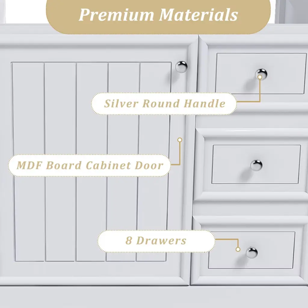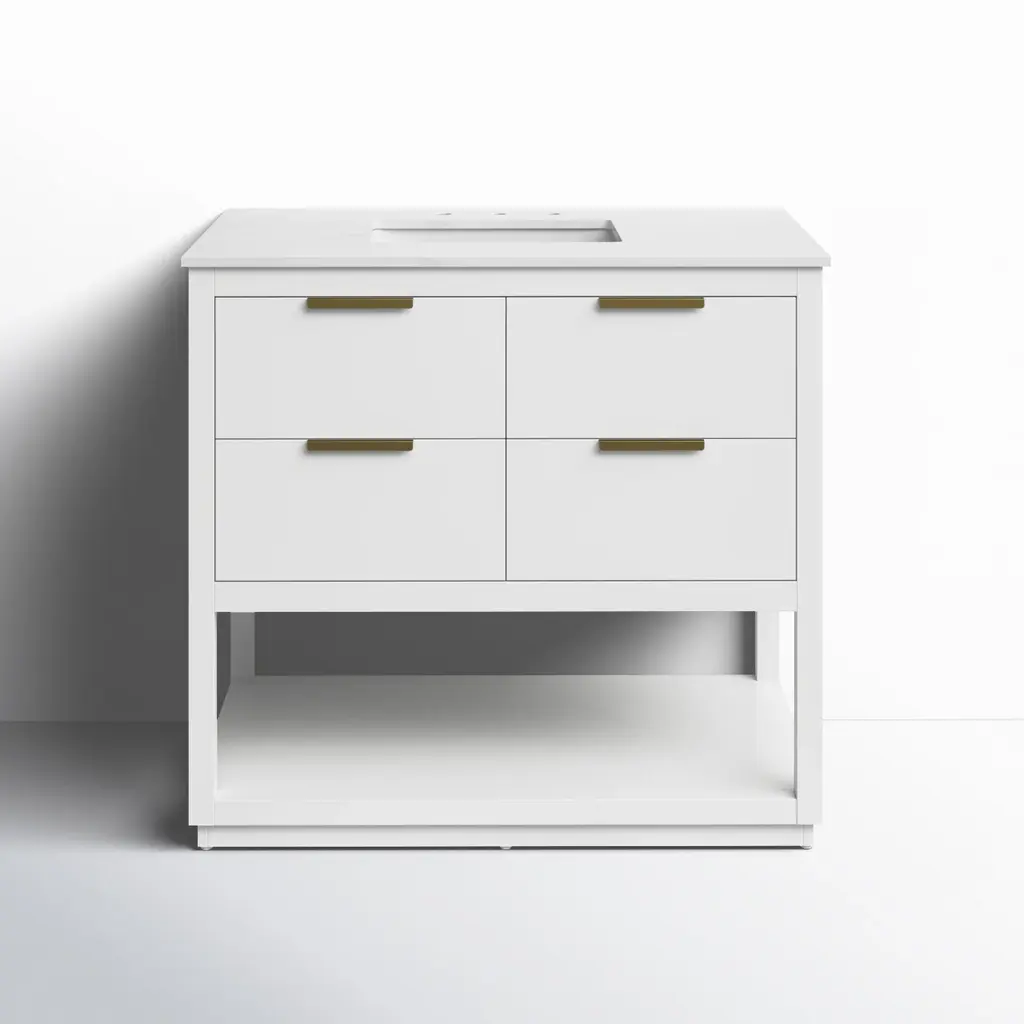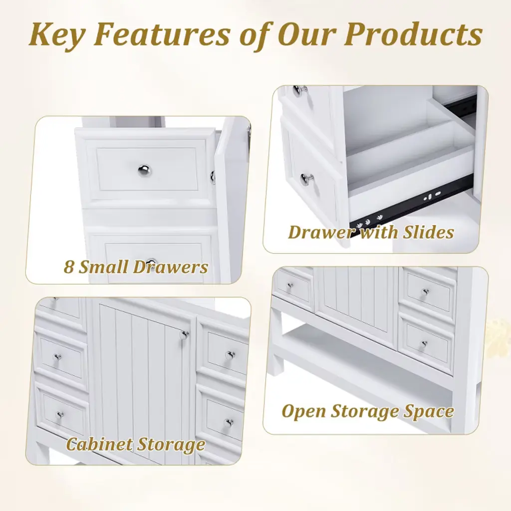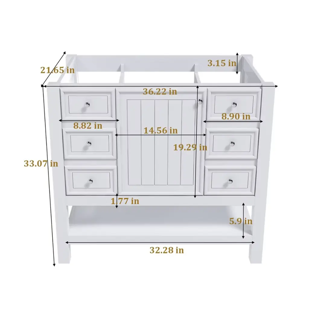 Product Overview This 36-inch bathroom vanity cabinet, crafted with a solid wood frame and MDF board, is a durable and practical storage solution for any bathroom. Without a sink, it offers flexibility for pairing with your preferred basin. Its waterproof surface resists stains and is easy to clean, while multiple drawers and a cabinet door provide ample space to organize essentials. The open lower shelf adds extra functionality with a modern touch. Specifications Product Type: Bathroom Vanity Main Material: Solid Wood Frame + MDF Finish Type: Painted Waterproof Coating Mounting Type: Free-standing Sink Included: No (compatible with 37"x22" ceramic sink) Door Quantity: 1 Drawer Quantity: 3 Shelf Type: Open Lower Shelf Assembly: Assembly Required Product Features [High Quality & Durable] Solid wood frame combined with MDF panels for long-lasting strength and stability. Waterproof finish makes cleaning easy and resists stains. [Multi-Functional Storage] Features one cabinet door, three drawers, and a bottom open shelf to efficiently organize toiletries, towels, and bathroom supplies. [Silent Hardware] Equipped with soft-close hinges and smooth sliding rails to ensure quiet operation and protect stored items. [Flexible Sink Compatibility] Designed to pair with a 37"x22" ceramic sink; pre-drilled faucet holes simplify installation while maintaining style. [Easy Assembly] Includes detailed instructions and hardware for quick setup. Product Dimensions Overall: 36.22"L x 21.65"W x 33.07"H Product Weight: 85.98 lbs Suitable Scenarios Perfect for bathrooms needing organized storage and a customizable sink option. Ideal for master baths, guest bathrooms, or powder rooms where practicality meets style. Notes 1. Real product color may slightly differ due to lighting or monitor display. 2. Manual measurement has been used; reasonable variations may exist.