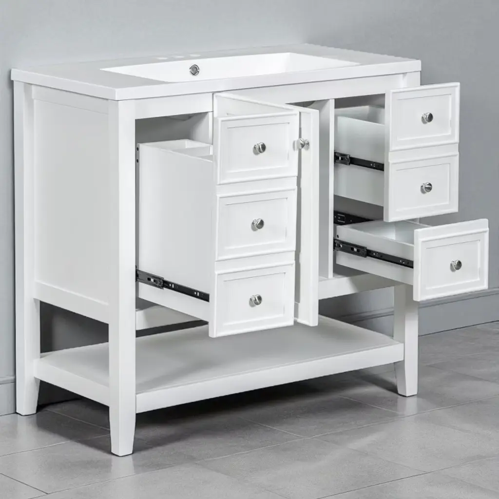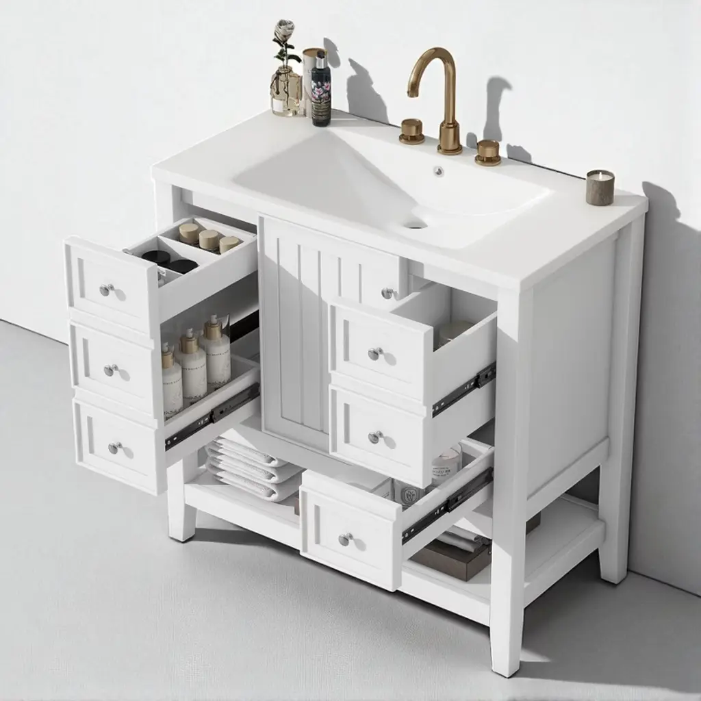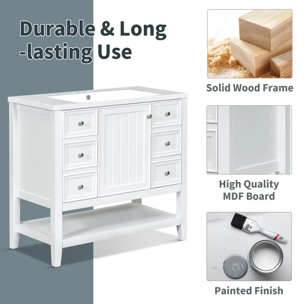 Product Overview:This 36-inch freestanding bathroom vanity offers the perfect combination of elegance, durability, and functional storage. Featuring a white ceramic sink, solid wood and MDF construction, three drawers, one soft-close cabinet, and a lower open shelf, this modern vanity is ideal for organizing your daily bathroom essentials. The painted finish resists water, stains, and humidity—making it a long-lasting addition to your space.Product Features:Premium Materials for Durability: Constructed from solid poplar/rubber wood and MDF board, this vanity provides excellent stability. The painted finish is waterproof, stain-resistant, and easy to clean, making it ideal for daily bathroom use.Spacious Ceramic Sink: The white ceramic sink features a half-moon basin that extends close to the vanity edge, maximizing usable space. It includes an overflow hole and is pre-drilled for a 4"" centerset faucet (not included).Versatile Storage Layout: Designed for practical use, this vanity includes one soft-close cabinet, three drawers with slide rails, and a lower open shelf for towels, toiletries, and bathroom accessories. Everything has its place—neatly tucked away or easily within reach.Adjustable Shelf and Flexible Drawer Divider: The internal shelf is height-adjustable to suit different storage needs. The left drawer includes removable divider panels for customizable storage—perfect for separating smaller items or organizing accessories.Elegant Hardware and Quiet Operation: Equipped with stainless steel hinges and silver round knobs, this vanity combines refined style with smooth, quiet closing action for everyday comfort.Easy Assembly: Ships in one box with all required hardware and a detailed instruction manual. Assembly is straightforward and includes anti-toppling devices for added safety.Specifications:Product Name: Bathroom VanityColor: WhiteStyle: ModernMounting Type: FreestandingSink Material: CeramicCabinet Material: Solid Poplar/Rubber Wood + MDF BoardFinish: Painted FinishSink Type: Undermount / Drop-InSink Shape: RectangularSink Location: CenterFaucet Mount: 4"" Centerset (faucet not included)Vanity Top Edge Type: FlatEdge Thickness: 0.7""Number of Doors: 1Number of Drawers: 3Adjustable Shelf: YesWeight Capacity: 200 lbsSoft Close Hinges: YesAssembly Required: YesCountry of Origin: VietnamOverall Dimensions: 36.02"" L x 18.31"" W x 34.10"" HCabinet Base: 35.50"" L x 18.00"" W x 32.90"" HSink Top: 36.02"" L x 18.31"" W x 4.7"" HTotal Weight: 116.4 lbsSuitable Scenarios:This vanity is ideal for primary bathrooms, guest bathrooms, or apartment remodels. Its compact yet functional layout makes it a practical solution for modern households seeking a balance of beauty and utility.Notes:Items may vary slightly in color due to lighting or monitor display. Faucet is not included. Please confirm dimensions and specifications before installation. Assembly instructions and all necessary hardware are included.