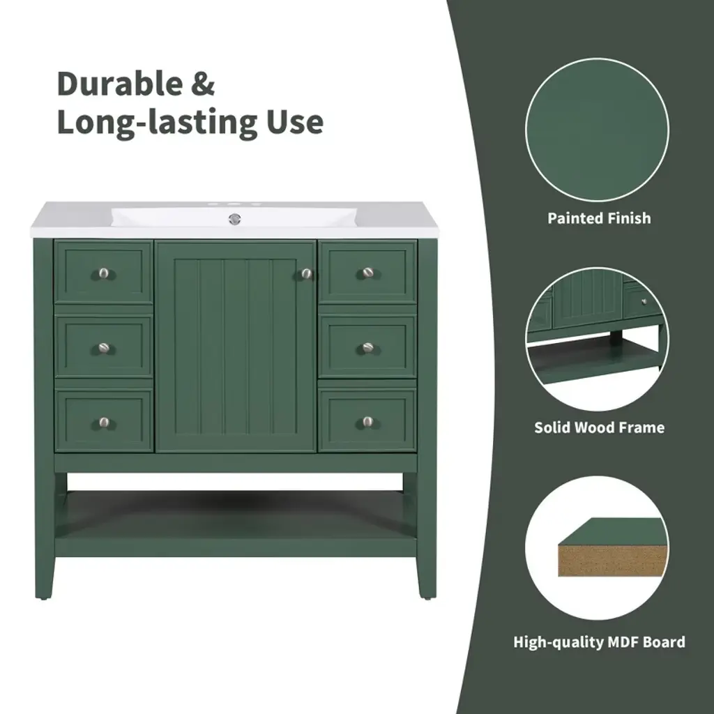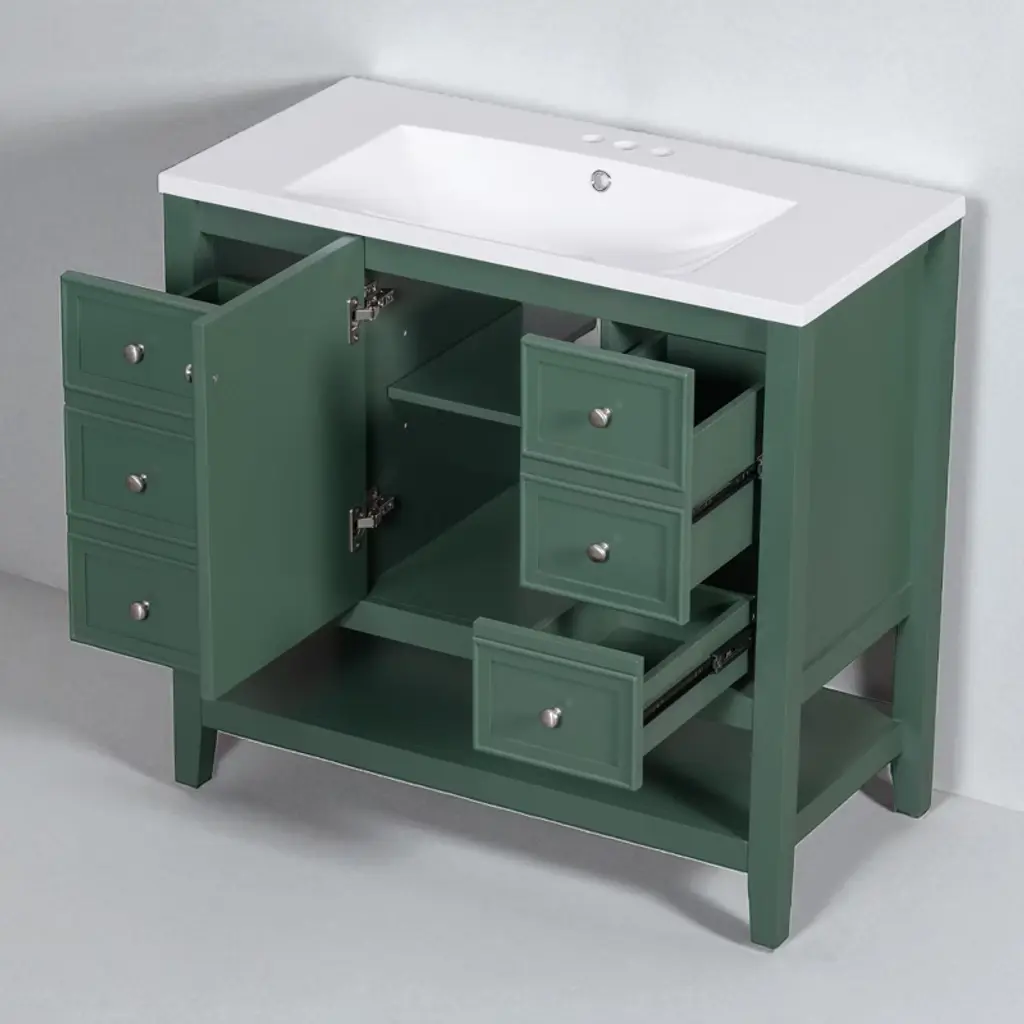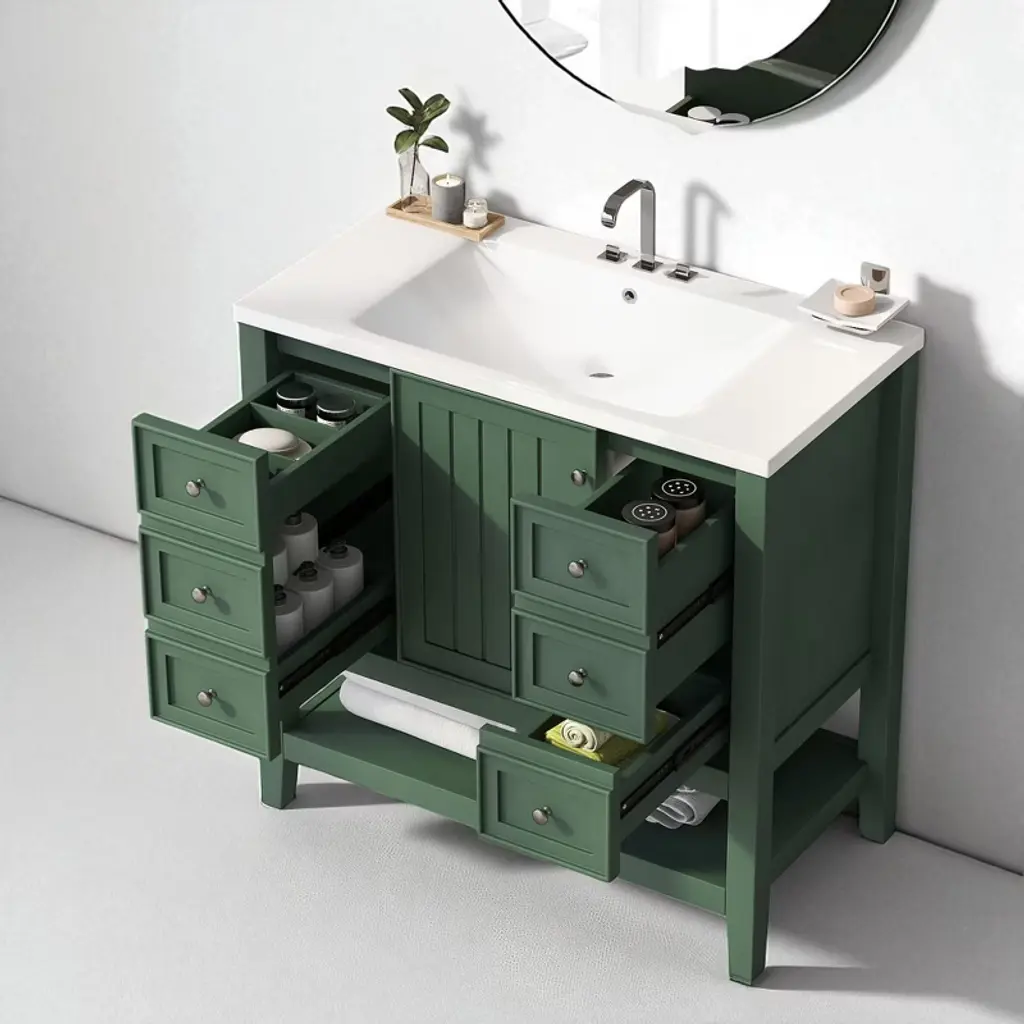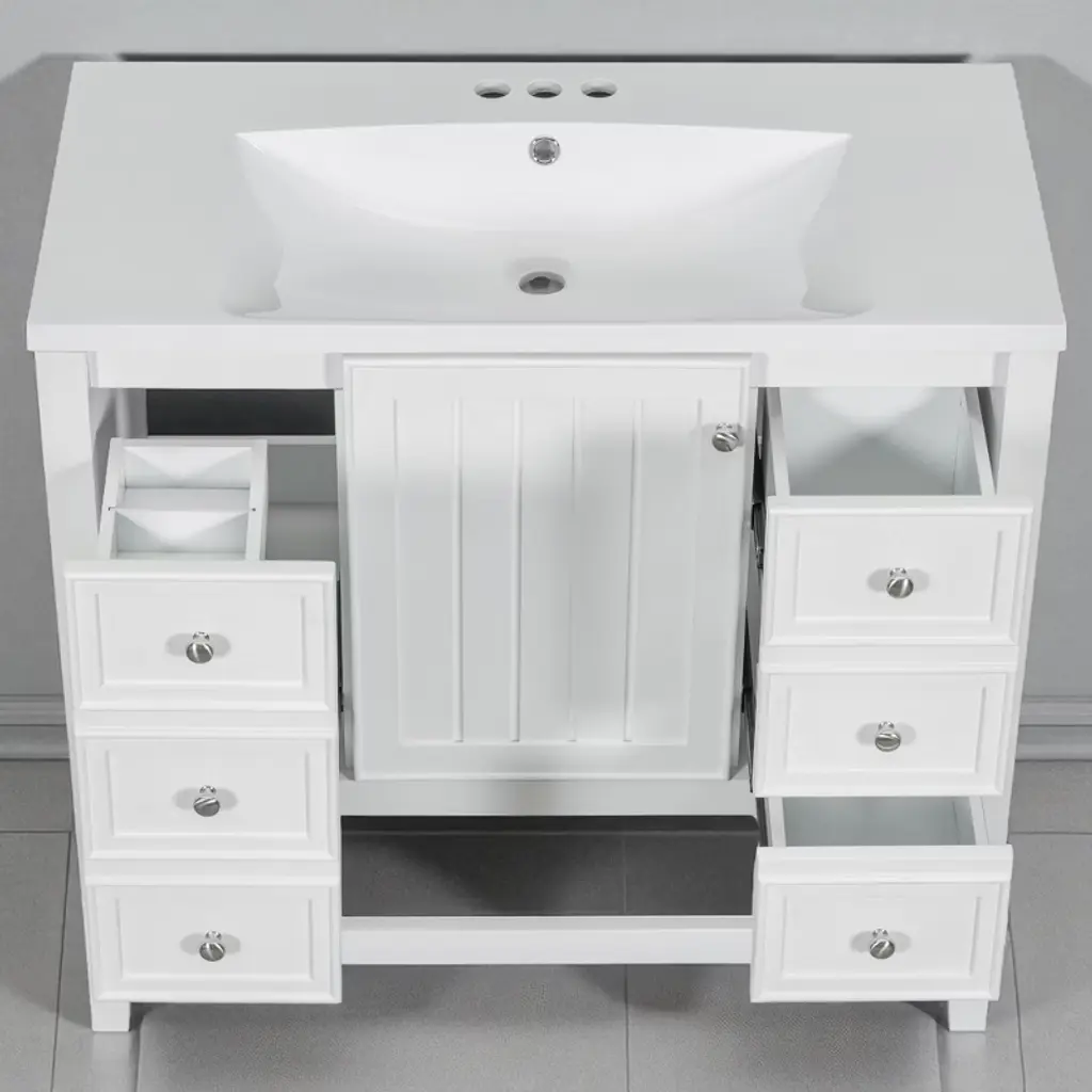 Product Overview:This 36-inch freestanding bathroom vanity offers the perfect combination of elegance, durability, and functional storage. Featuring a white ceramic sink, solid wood and MDF construction, three drawers, one soft-close cabinet, and a lower open shelf, this modern vanity is ideal for organizing your daily bathroom essentials. The painted finish resists water, stains, and humidity—making it a long-lasting addition to your space.Product Features:Premium Materials for Durability: Constructed from solid poplar/rubber wood and MDF board, this vanity provides excellent stability. The painted finish is waterproof, stain-resistant, and easy to clean, making it ideal for daily bathroom use.Spacious Ceramic Sink: The white ceramic sink features a half-moon basin that extends close to the vanity edge, maximizing usable space. It includes an overflow hole and is pre-drilled for a 4"" centerset faucet (not included).Versatile Storage Layout: Designed for practical use, this vanity includes one soft-close cabinet, three drawers with slide rails, and a lower open shelf for towels, toiletries, and bathroom accessories. Everything has its place—neatly tucked away or easily within reach.Adjustable Shelf and Flexible Drawer Divider: The internal shelf is height-adjustable to suit different storage needs. The left drawer includes removable divider panels for customizable storage—perfect for separating smaller items or organizing accessories.Elegant Hardware and Quiet Operation: Equipped with stainless steel hinges and silver round knobs, this vanity combines refined style with smooth, quiet closing action for everyday comfort.Easy Assembly: Ships in one box with all required hardware and a detailed instruction manual. Assembly is straightforward and includes anti-toppling devices for added safety.Specifications:Product Name: Bathroom VanityColor: WhiteStyle: ModernMounting Type: FreestandingSink Material: CeramicCabinet Material: Solid Poplar/Rubber Wood + MDF BoardFinish: Painted FinishSink Type: Undermount / Drop-InSink Shape: RectangularSink Location: CenterFaucet Mount: 4"" Centerset (faucet not included)Vanity Top Edge Type: FlatEdge Thickness: 0.7""Number of Doors: 1Number of Drawers: 3Adjustable Shelf: YesWeight Capacity: 200 lbsSoft Close Hinges: YesAssembly Required: YesCountry of Origin: VietnamOverall Dimensions: 36.02"" L x 18.31"" W x 34.10"" HCabinet Base: 35.50"" L x 18.00"" W x 32.90"" HSink Top: 36.02"" L x 18.31"" W x 4.7"" HTotal Weight: 116.4 lbsSuitable Scenarios:This vanity is ideal for primary bathrooms, guest bathrooms, or apartment remodels. Its compact yet functional layout makes it a practical solution for modern households seeking a balance of beauty and utility.Notes:Items may vary slightly in color due to lighting or monitor display. Faucet is not included. Please confirm dimensions and specifications before installation. Assembly instructions and all necessary hardware are included.