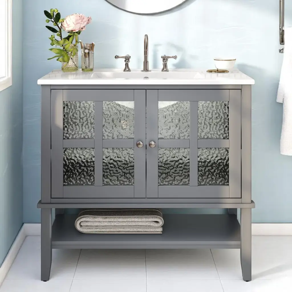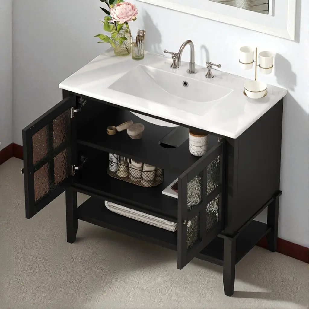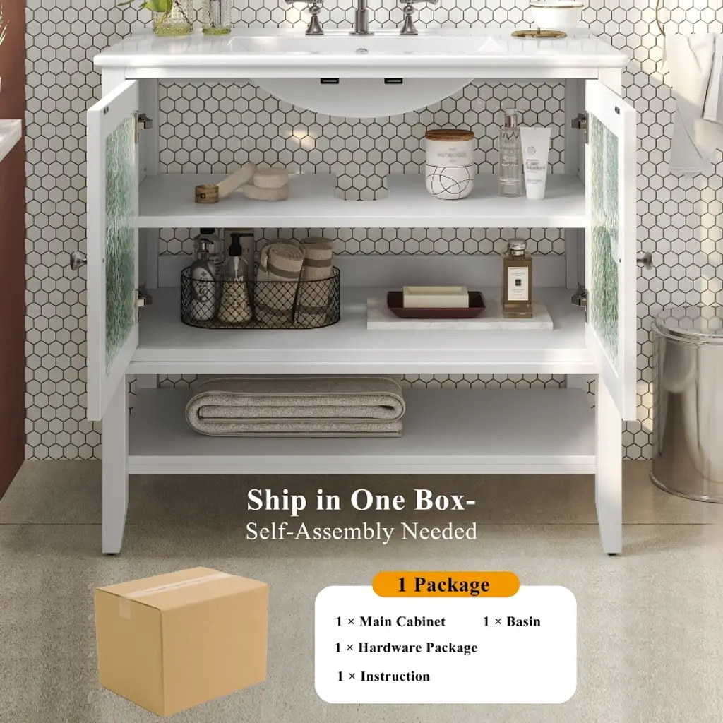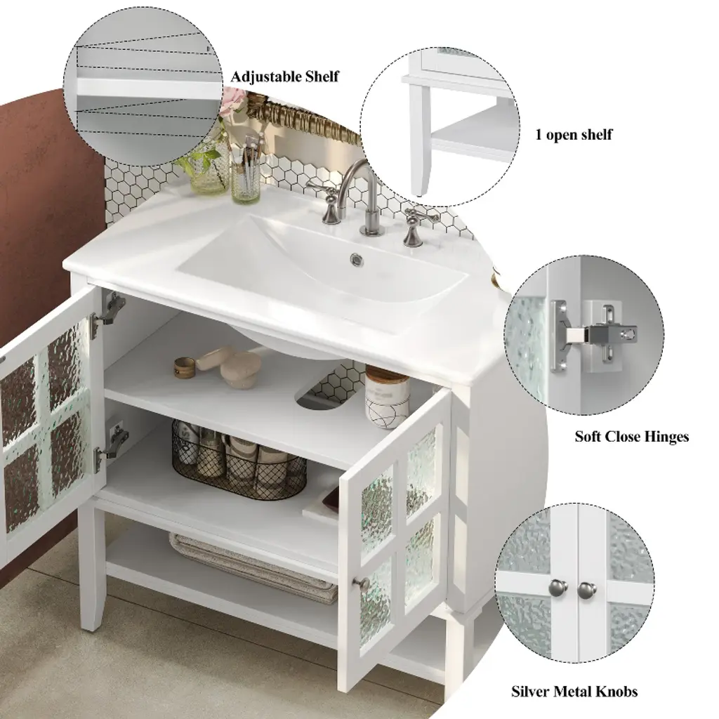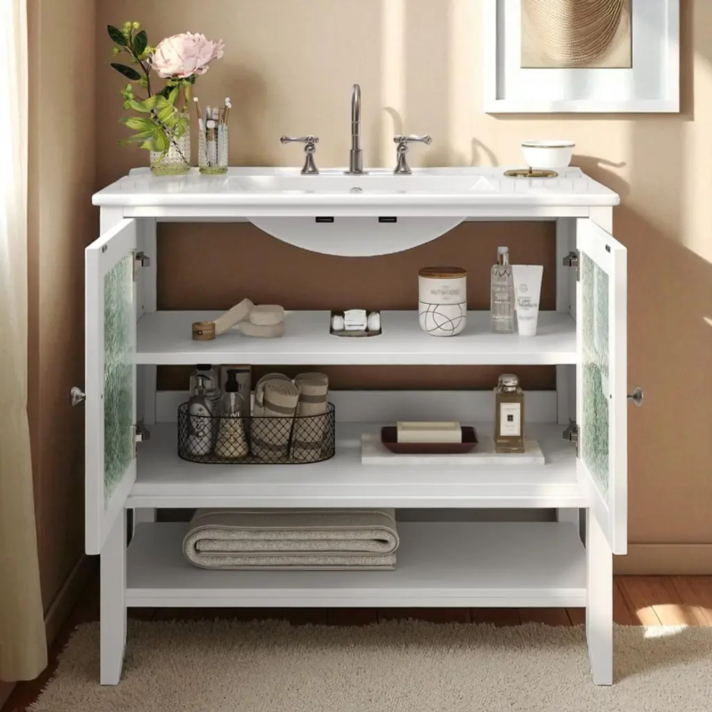 Product Overview:Upgrade your bathroom with this 36-inch freestanding vanity, combining timeless elegance with practical functionality. Featuring a sleek ceramic sink, soft-close doors, textured glass panels, and solid wood tapered legs, this vanity is built to last and designed to impress. Its open and adjustable shelving offers flexible storage, while the white waterproof painted finish ensures lasting beauty in humid environments. Perfect for both modern and transitional spaces, this vanity delivers refined style with everyday durability.Product Features:Elegant Design with Ceramic Sink: This 36"" bathroom vanity features a smooth ceramic sink that is resistant to stains and scratches. The integrated design creates a seamless, modern look while providing ample space for daily routines.Functional Storage with Adjustable & Open Shelves: The cabinet includes an interior adjustable shelf for tall bottles and supplies, plus a lower open shelf for quick access to everyday essentials like towels or baskets.Sturdy Solid Wood Tapered Legs: Crafted from high-density solid wood, the tapered legs provide long-lasting support and a mid-century modern aesthetic. They help resist warping and moisture, offering reliable stability on any surface.Durable Waterproof Painted Finish: The white painted finish repels moisture and humidity, protecting the vanity against bubbling, peeling, or cracking—even in steamy bathroom conditions.Premium Hardware – Silver Knobs & Soft-Close Hinges: Sleek silver knobs complement the vanity’s clean look, while soft-close hinges ensure quiet and smooth door operation, preventing slamming and finger pinches.Modern Touches – Textured Glass Doors & Pre-Drilled Faucet Hole: Two textured glass doors offer stylish partial concealment and visual depth. The sink includes an 8"" pre-drilled faucet hole (faucet not included) and an anti-spill overflow hole for added convenience.Specifications:Product Name: Bathroom VanityColor: WhiteStyle: Transitional / ModernMounting Type: Free-standingSink Material: CeramicCabinet Material: MDF + Solid Wood LegsHandle Material: Silver MetalSink Type: Undermount / Drop-inSink Shape: RectangularFaucet Mount: 8"" Widespread (faucet not included)Overflow Hole: YesVanity Top Edge Type: FlatEdge Thickness: 4.25""Number of Doors: 2 (with textured glass panels)Number of Drawers: NoneSoft Close Hinges: YesAssembly Required: Yes (hardware and instructions included)Country of Origin: VietnamOverall Dimensions: 36"" L x 18.5"" W x 34"" HCabinet Interior: 33.25"" W x 16"" D x 18.05"" HSink Dimensions: 36"" L x 18.5"" W x 4.25"" DBase Dimensions: 35"" W x 18.25"" D x 33.25"" HWeight: 99.21 lbsSuitable Scenarios:This vanity is ideal for master bathrooms, guest bathrooms, or remodel projects that require a blend of style and durability. It complements modern, transitional, or farmhouse interiors with its clean design and warm touches.Notes:Ships in one box. Assembly is required. Faucet is not included. Please verify faucet spacing and overall dimensions before installation. For questions or assistance, please contact our support team.