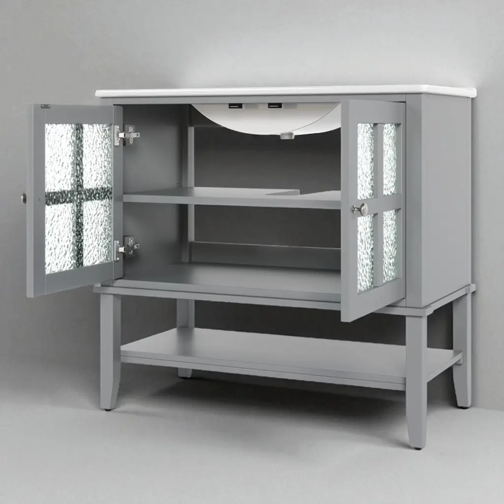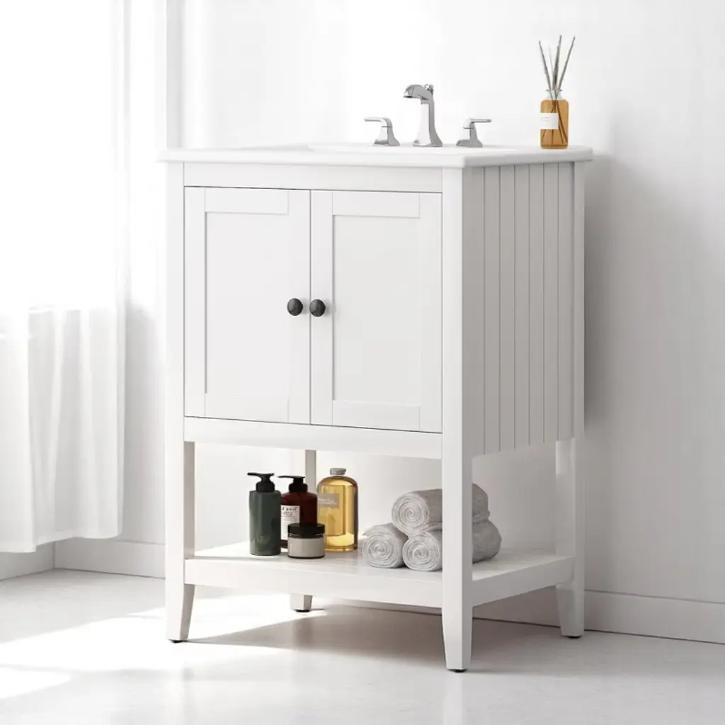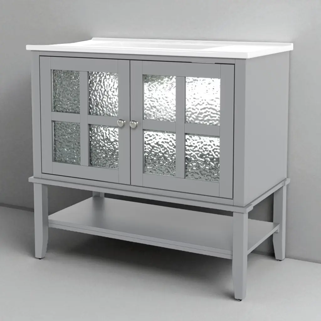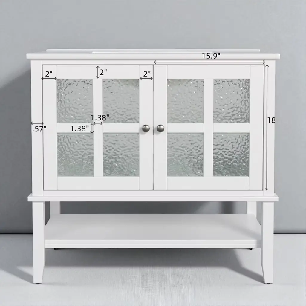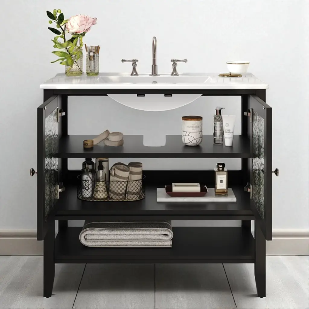Product Overview:Upgrade your bathroom with this 36-inch freestanding vanity, combining timeless elegance with practical functionality. Featuring a sleek ceramic sink, soft-close doors, textured glass panels, and solid wood tapered legs, this vanity is built to last and designed to impress. Its open and adjustable shelving offers flexible storage, while the white waterproof painted finish ensures lasting beauty in humid environments. Perfect for both modern and transitional spaces, this vanity delivers refined style with everyday durability.Product Features:Elegant Design with Ceramic Sink: This 36"" bathroom vanity features a smooth ceramic sink that is resistant to stains and scratches. The integrated design creates a seamless, modern look while providing ample space for daily routines.Functional Storage with Adjustable & Open Shelves: The cabinet includes an interior adjustable shelf for tall bottles and supplies, plus a lower open shelf for quick access to everyday essentials like towels or baskets.Sturdy Solid Wood Tapered Legs: Crafted from high-density solid wood, the tapered legs provide long-lasting support and a mid-century modern aesthetic. They help resist warping and moisture, offering reliable stability on any surface.Durable Waterproof Painted Finish: The white painted finish repels moisture and humidity, protecting the vanity against bubbling, peeling, or cracking—even in steamy bathroom conditions.Premium Hardware – Silver Knobs & Soft-Close Hinges: Sleek silver knobs complement the vanity’s clean look, while soft-close hinges ensure quiet and smooth door operation, preventing slamming and finger pinches.Modern Touches – Textured Glass Doors & Pre-Drilled Faucet Hole: Two textured glass doors offer stylish partial concealment and visual depth. The sink includes an 8"" pre-drilled faucet hole (faucet not included) and an anti-spill overflow hole for added convenience.Specifications:Product Name: Bathroom VanityColor: WhiteStyle: Transitional / ModernMounting Type: Free-standingSink Material: CeramicCabinet Material: MDF + Solid Wood LegsHandle Material: Silver MetalSink Type: Undermount / Drop-inSink Shape: RectangularFaucet Mount: 8"" Widespread (faucet not included)Overflow Hole: YesVanity Top Edge Type: FlatEdge Thickness: 4.25""Number of Doors: 2 (with textured glass panels)Number of Drawers: NoneSoft Close Hinges: YesAssembly Required: Yes (hardware and instructions included)Country of Origin: VietnamOverall Dimensions: 36"" L x 18.5"" W x 34"" HCabinet Interior: 33.25"" W x 16"" D x 18.05"" HSink Dimensions: 36"" L x 18.5"" W x 4.25"" DBase Dimensions: 35"" W x 18.25"" D x 33.25"" HWeight: 99.21 lbsSuitable Scenarios:This vanity is ideal for master bathrooms, guest bathrooms, or remodel projects that require a blend of style and durability. It complements modern, transitional, or farmhouse interiors with its clean design and warm touches.Notes:Ships in one box. Assembly is required. Faucet is not included. Please verify faucet spacing and overall dimensions before installation. For questions or assistance, please contact our support team.