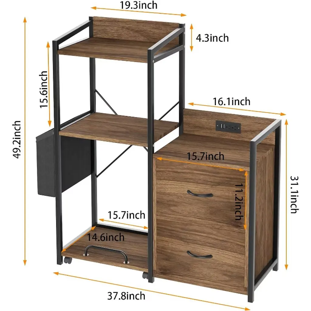 38" File Cabinet With Charging Station, Large 3-tier Printer Table With Storage Shelf & Drawers,office Desk Organizer For Fax Machine, Shredder