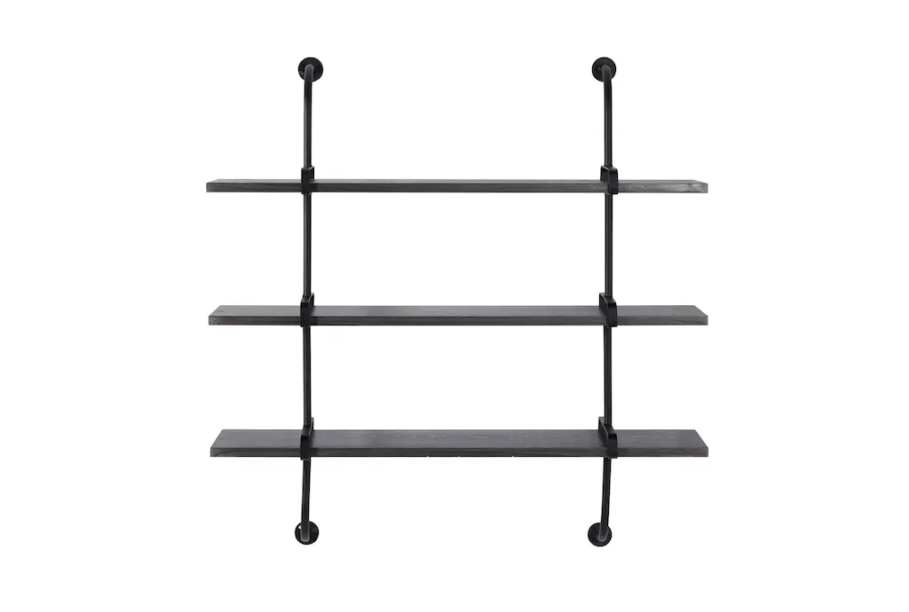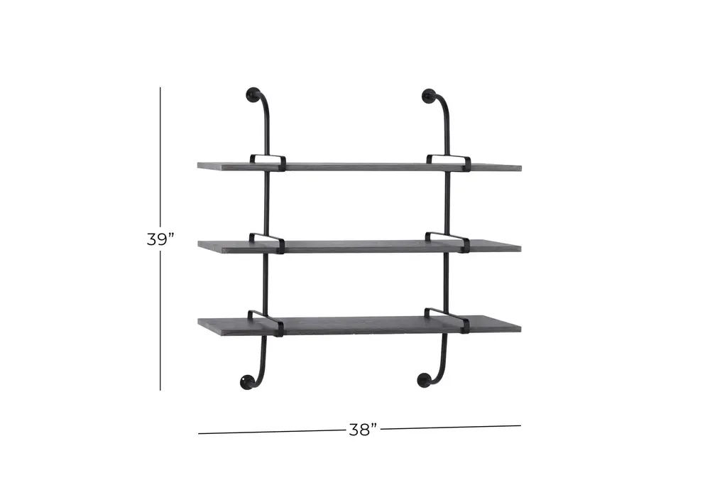 Organize and decorate with this 3 tier wall shelf that would add style and function to your industrial-themed home space. This item ships in 1 carton. Can be hung horizontally using the hole on the back; nails and screws not included. Suitable for indoor use only. This item ships fully assembled in one piece. Maximum weight limit is 20 lbs. This is a single gray colored floating shelf. Wood wall shelf features 3 shelves. Industrial style.