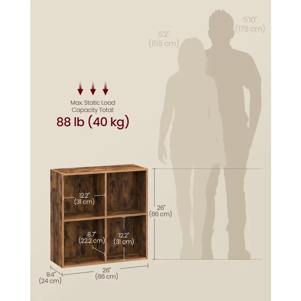 This compact 4-compartment cube shelf offers versatile open storage with a small 9.4" depth footprint, ideal for books, decor, and essentials in living rooms, offices, or bedrooms. Built with 12mm thick E1 particleboard, each cube supports up to 22 lbs and includes an anti-tip kit for stability and safety. The minimalist, footless design blends seamlessly into modern spaces while providing accessible organization. Specifications: - Product Size: 9.4''D x 26''W x 26"H (24 x 66 x 66 cm) - Product Weight: 18.6 lb (8.5 kg) - Max. Static Load Capacity per Compartment: 22 lb (10 kg) - Max. Static Load Capacity of the Top Shelf: 44 lb (20 kg) - Max. Static Load Capacity Total: 88 lb (40 kg)
