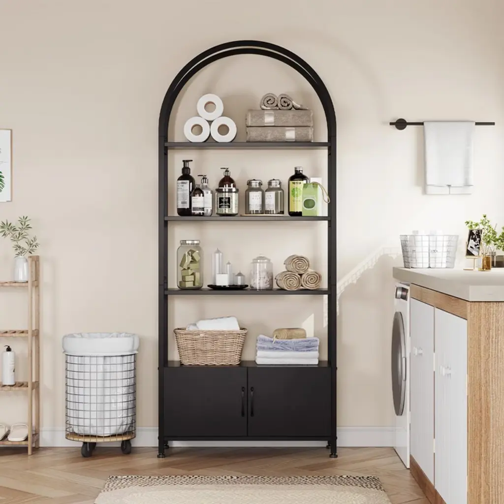 Industrial Bookshelf with Doors - 4-Tier Tall Bookcase, 71.5" Arched Metal Shelf for Living Room, Office & BedroomBrand: TROPOWMaterial: Sturdy Metal Frame + Thick Particle BoardDimensions: 31.5" W x 11" D x 71.5" HShelves: 4 open display shelves + 2 enclosed storage shelvesWeight Capacity: Heavy-duty construction (exact limit not specified)Special Features: Arched top design, dust-proof doorsAssembly: Required (all parts & tools included)Key Features1. Smart Dual Storage Design 4 open shelves for display (books, decor, plants) 2 enclosed shelves behind doors for hidden storage Gold arched top creates elegant focal point 2. Industrial Chic Style Matte gold metal frame with clean lines Combines open & closed storage for visual interest Arched top perfect for tall decor items 3. Heavy-Duty Construction Thick particle boards resist warping Sturdy metal frame ensures stability Smooth-gliding doors with modern handles 4. Space-Saving Vertical Design 71.5" height maximizes vertical space Only 11" depth fits narrow spaces Perfect for apartments & small rooms 5. Easy Assembly All labeled parts included Step-by-step instructions Free replacement for defective parts Why Choose This Bookshelf?? Showcase & hide items - best of both storage styles? Industrial gold finish - elevates any decor? Tall & narrow - ideal for small spaces? Durable metal frame - built to lastAdd Stylish Storage to Any Room with TROPOW's Industrial Bookcase!
