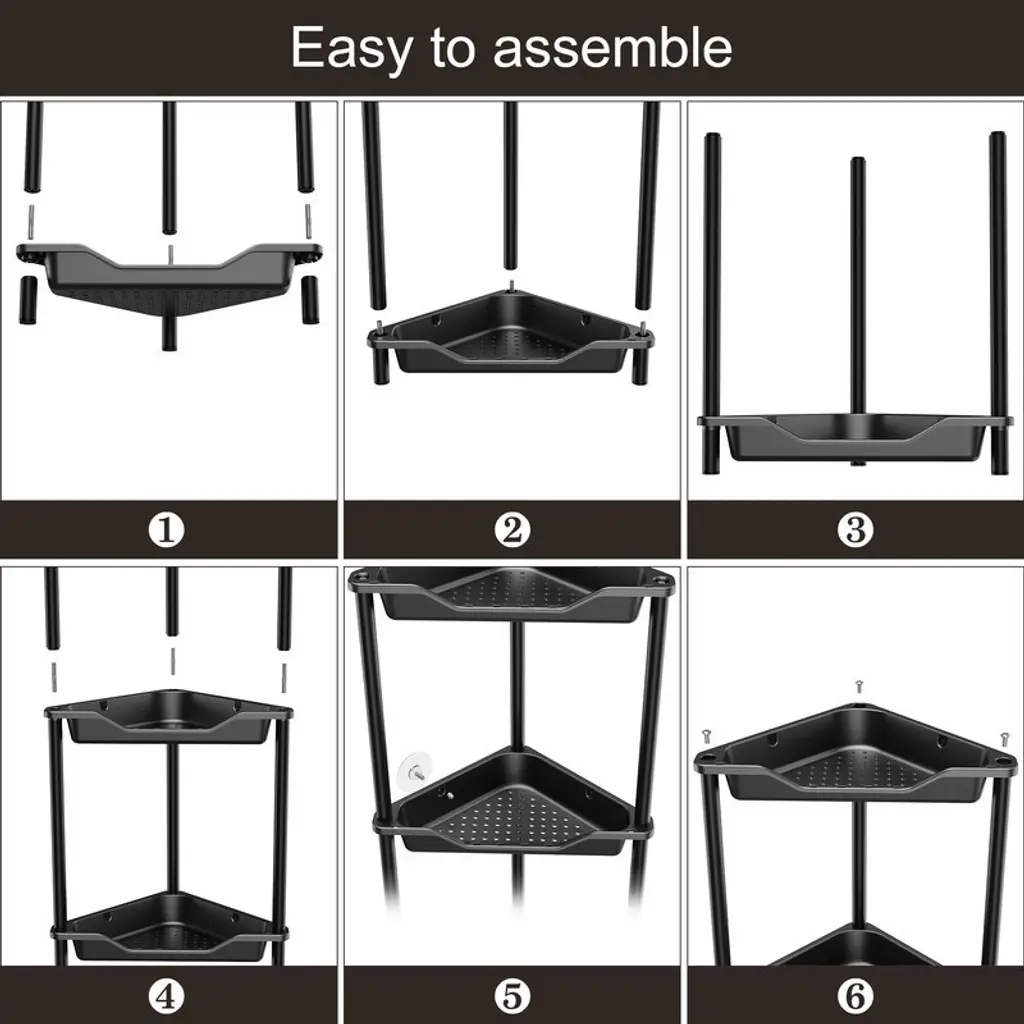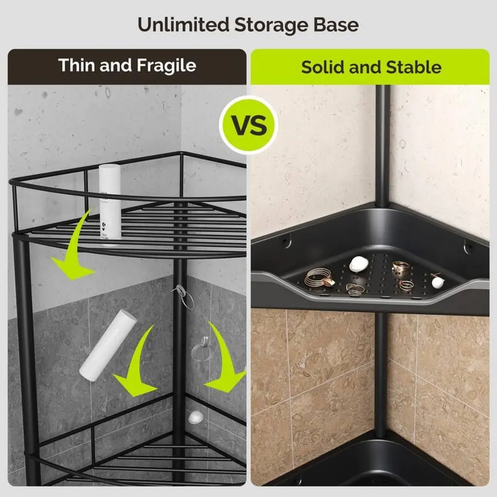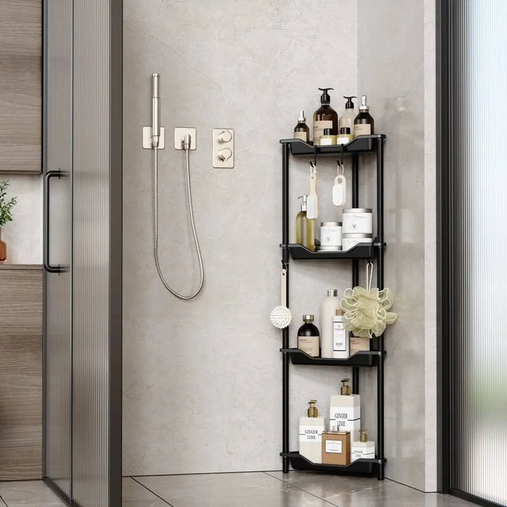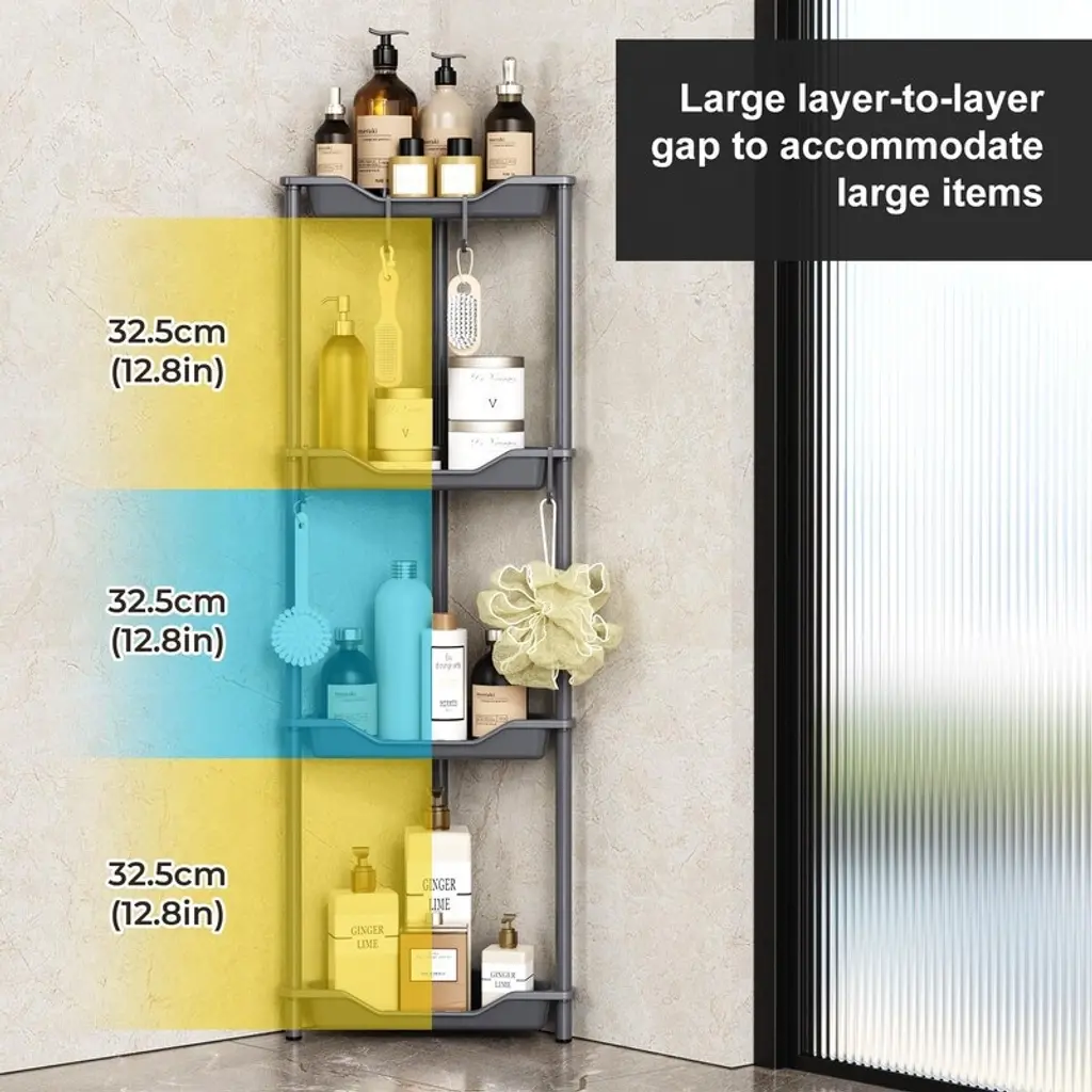 Constructed with durable metal framework and high-quality plastic components, this corner shelf offers exceptional strength while being completely waterproof and rust-resistant. The robust metal structure provides reliable support for heavy items, making it perfect for high-moisture environments like bathrooms, as well as kitchens, bedrooms, and living areas.Assembly is quick and straightforward, with the flexibility to customize your storage by installing only the shelf tiers you need. The modular design allows you to create a storage solution that perfectly fits your space and organizational requirements.Designed with practical drainage holes across all shelf surfaces, this unit effectively prevents water accumulation that could lead to rust or mildew. The efficient water runoff system keeps your items dry and maintains the shelf's pristine condition over time.Generous spacing between each tier accommodates taller bottles and bulkier items with ease. Unlike standard shelves with restrictive height limitations, this design ensures your toiletries, cleaning supplies, or kitchen essentials fit comfortably regardless of their size.Four removable hooks add valuable hanging storage for frequently used items like razors, loofahs, or cleaning brushes. The rustproof hooks maintain their integrity in wet conditions while providing convenient access to your daily essentials.