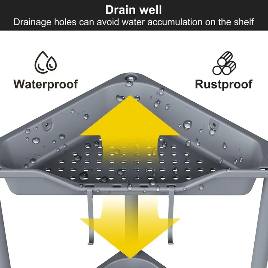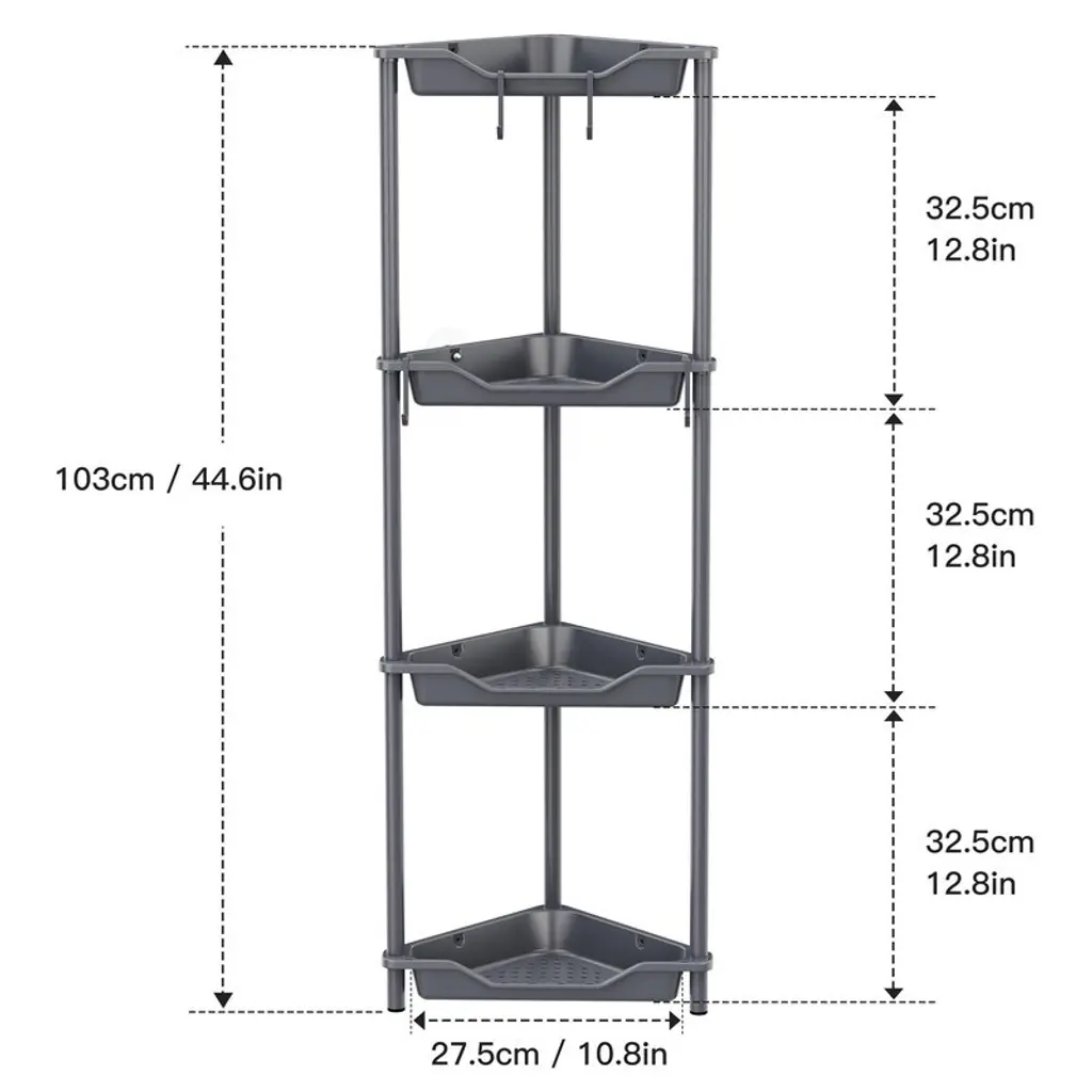 Constructed with durable metal framework and high-quality plastic components, this corner shelf offers exceptional strength while being completely waterproof and rust-resistant. The robust metal structure provides reliable support for heavy items, making it perfect for high-moisture environments like bathrooms, as well as kitchens, bedrooms, and living areas.Assembly is quick and straightforward, with the flexibility to customize your storage by installing only the shelf tiers you need. The modular design allows you to create a storage solution that perfectly fits your space and organizational requirements.Designed with practical drainage holes across all shelf surfaces, this unit effectively prevents water accumulation that could lead to rust or mildew. The efficient water runoff system keeps your items dry and maintains the shelf's pristine condition over time.Generous spacing between each tier accommodates taller bottles and bulkier items with ease. Unlike standard shelves with restrictive height limitations, this design ensures your toiletries, cleaning supplies, or kitchen essentials fit comfortably regardless of their size.Four removable hooks add valuable hanging storage for frequently used items like razors, loofahs, or cleaning brushes. The rustproof hooks maintain their integrity in wet conditions while providing convenient access to your daily essentials.