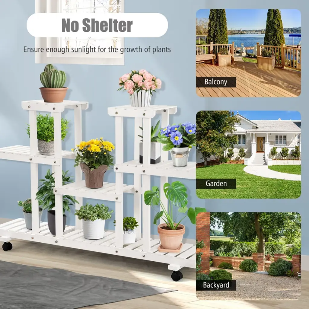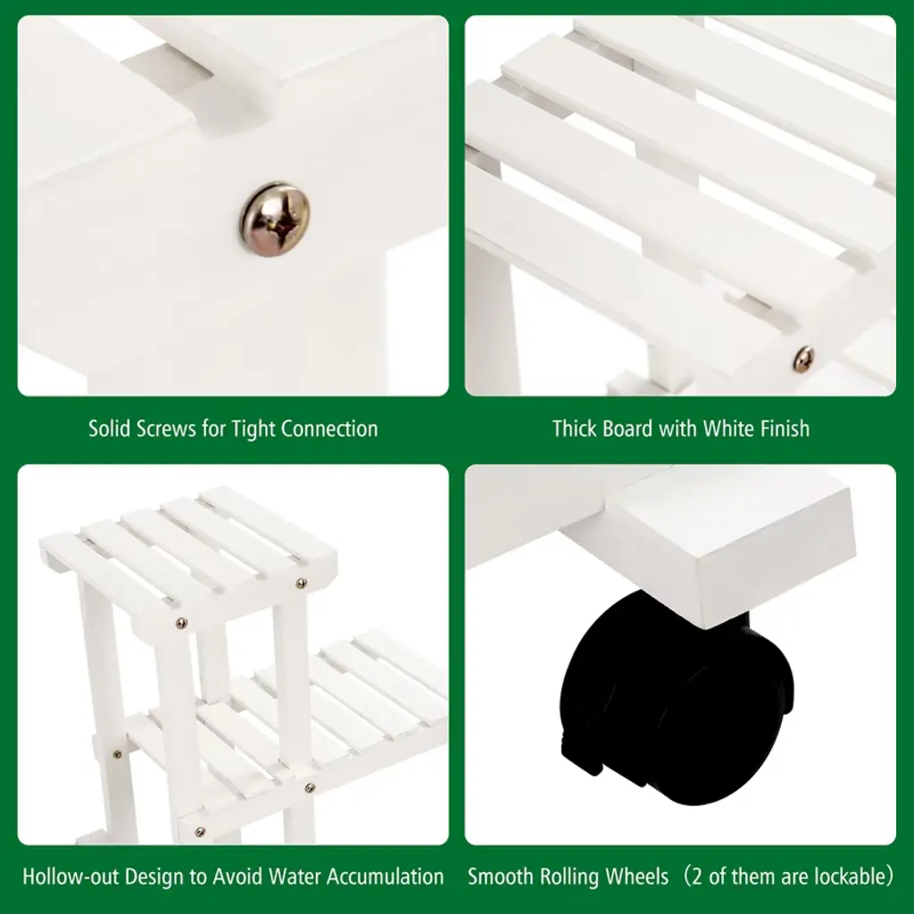 Our rolling flower stand can fully play its multi-functional role inside or outside your home. Equipped with solid and weather-resistant wood construction, the plant stand can be placed at your balcony, living room, garden or patio etc. not only to display beautiful flowers and vigorous potted plant but also to store or exhibit your photos, trophies, books and other beautiful artworks. 12 high and low pots racks makes full of space to highlight all plants and makes them not affect with each other. Each rack provides sufficient space to accommodate plants, and hollow-out design make it convenient for you to water plants without messy. White powder coat makes it anti-corrosive and weather-resistant. Flexible but lockable wheels make it easy to move and transport your plant. It will be an ideal choice for your home! FeaturesBrand new and high quality Suitable for both indoor and outdoor places such as balcony, living room, bedroom, patio, garden or terrace Hollow-out racks convenient for watering and draining especially in rainy day High and low design and multi layers making full of space and fully displays all plant or ornaments on It Multi directional wheels saving effort for transport and lockable brakes ensuring stability Being used for displaying various flowers or potted plant such as succulent plants, narcissus, cactus, roses, lilies, tulips, daisies Sturdy and solid fir wood construction maintaining anti-corrosive and weather-resistant Easy to assemble with high-quality hardware and detailed manual Strong bearing capacity ensuring long period use 12 spacious racks offering ample space for storing and displaying plants or flowersMaterial: Fir Wood Color: White Overall Dimension: 47.5"x10"x21.5"(L XW XH) Net weight:12lbs Weight Capacity of per Tier:11lbs Package Include: 1 X Rolling Wood Flower Rack