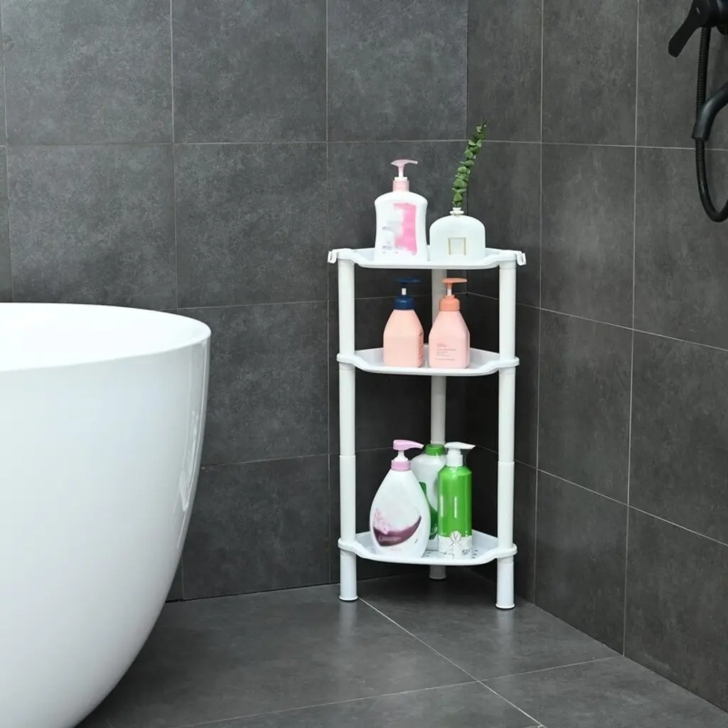 The shower caddy features rubberized feet that grip surfaces firmly to prevent sliding, while the durable plastic construction resists wear. Strategically placed drainage holes across all shelves ensure proper water runoff to maintain dryness and prevent mildew buildup.Measuring 13.5" x 10" x 40", this space-saving design fits perfectly in shower corners to maximize unused areas. The generous depth accommodates full-sized shampoo bottles, shower gels, and other bath essentials while keeping them organized and within easy reach.Assembly requires no tools and takes just minutes, with a simple design that can be quickly disassembled for thorough cleaning. The modular construction allows for easy maintenance while ensuring long-lasting use in humid bathroom environments.Constructed from high-grade waterproof plastic, the shelves feature flat, non-slip surfaces that keep items securely in place. The rustproof material withstands constant moisture exposure while the sturdy build prevents tipping, even when fully loaded with bottles and toiletries.This organizational solution effectively eliminates bathroom clutter by providing vertical storage that saves valuable floor space. The versatile design works equally well in kitchens or bedrooms, helping maintain tidy, efficient spaces throughout your home.