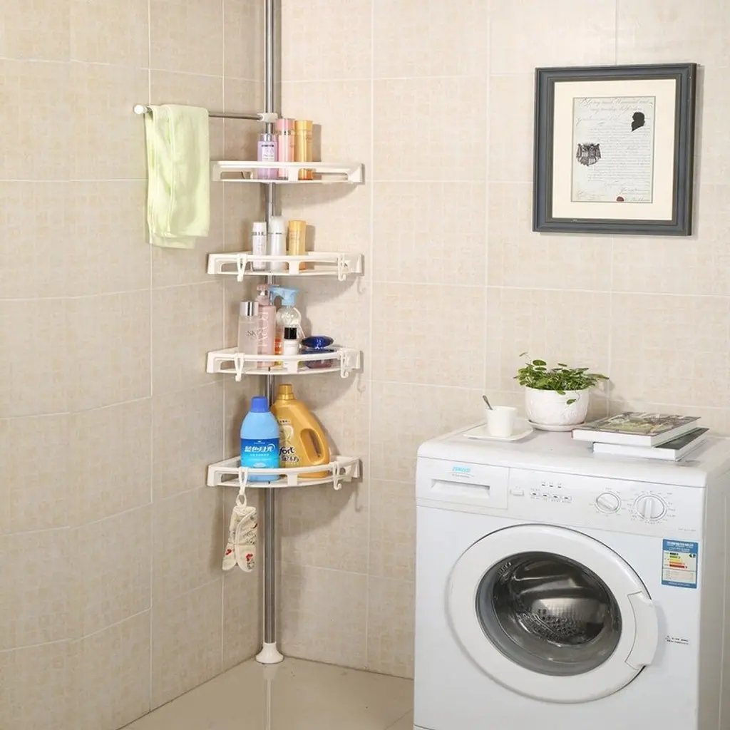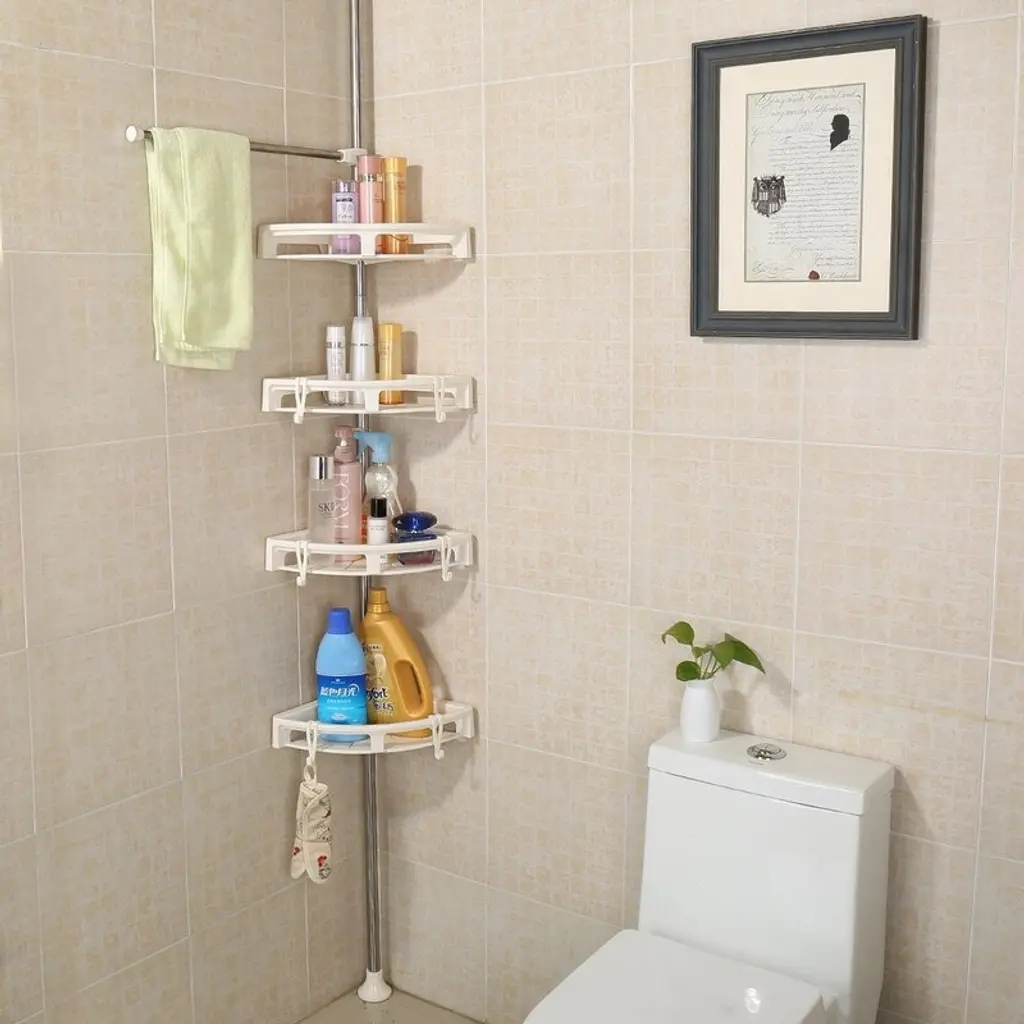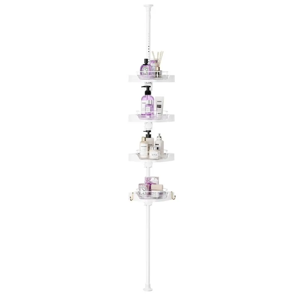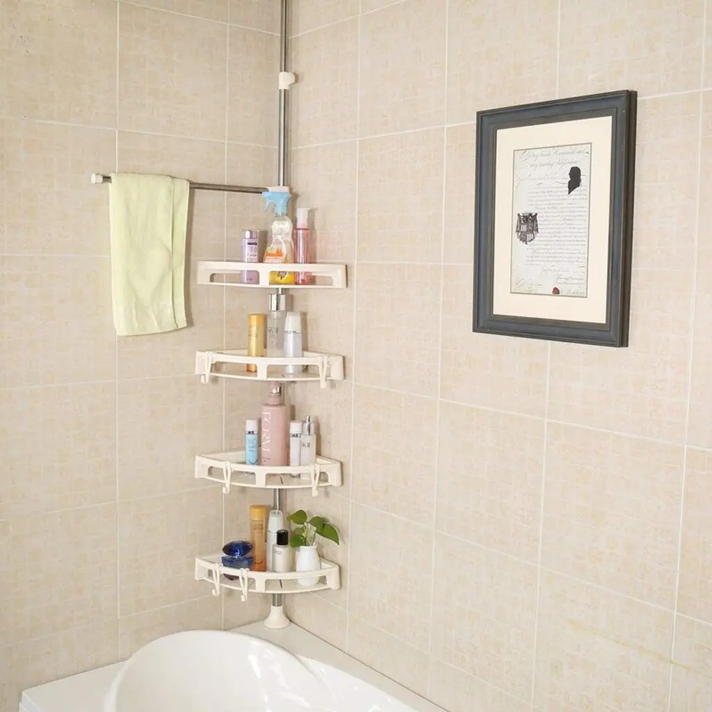 4 Tier Shower Rod Organizer Extension Rod Adjustable Corner Storage Vertical Tall Bathtub Rack Bathroom Space Saver - Large 4 Tier Corner Shelf With Guardrail - Ivory