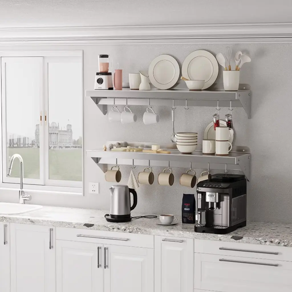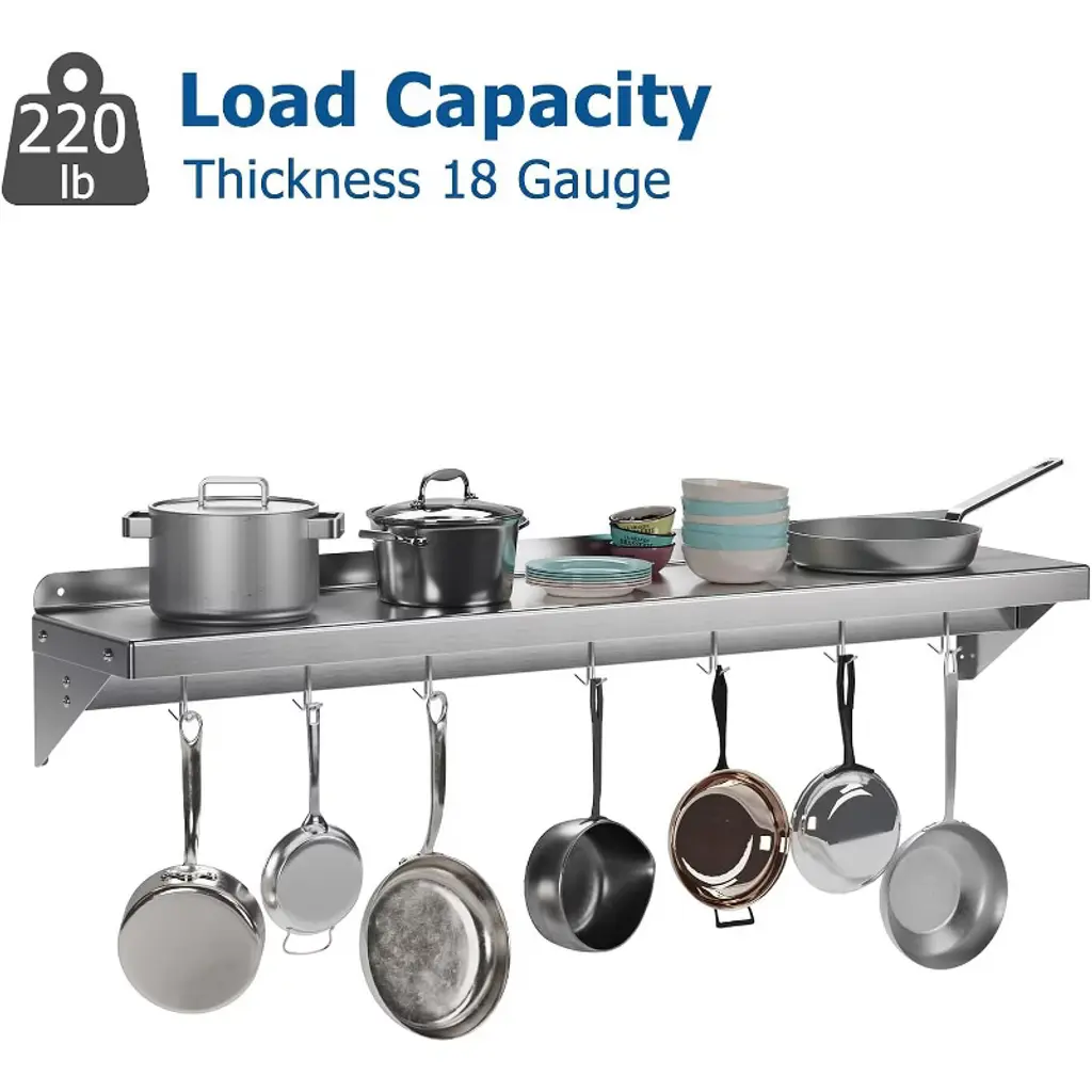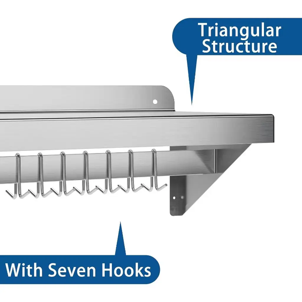 Introducing the Stainless Steel Shelf, NSF Commercial Shelf Wall Mounted – the ultimate storage solution for your restaurant, kitchen, home, or hotel. This versatile wall shelf is designed to enhance your space with its sleek, functional design and superior durability. Heavy-Duty Support: Crafted from premium stainless steel, this floating shelf offers robust support, ensuring your kitchen essentials are securely stored. Whether it's pots, pans, or other cookware, this shelf is built to hold it all. Efficient Space Utilization: Measuring 24 x 12 inches, this flat surface shelf provides ample storage space, optimizing your kitchen organization. With its compact design, it efficiently utilizes wall space, freeing up valuable counter and cabinet areas. Enhanced Organization: Equipped with 7 sturdy hooks, this wall-mounted shelf allows for easy access and efficient storage of your kitchen tools, keeping your space clutter-free and organized. Superior Material Quality: Made from high-quality stainless steel, this shelf is not only durable but also resistant to rust and corrosion, ensuring long-lasting use in any environment. Versatile Application: Perfect for a variety of settings, this wall shelf is ideal for use in restaurants, kitchens, homes, hotels, and even garages. Its versatile design makes it a practical storage solution for any space. Easy Installation: Designed for hassle-free setup, this stainless steel wall shelf comes with all the necessary hardware for quick and convenient installation. Simply mount it on your desired wall and start organizing. Upgrade your storage solutions with this stainless steel floating shelf. Whether you're looking for a kitchen shelf, garage storage, or a stylish wall mount, this shelf meets all your needs with elegance and efficiency. Transform your space with this reliable and stylish storage rack today!