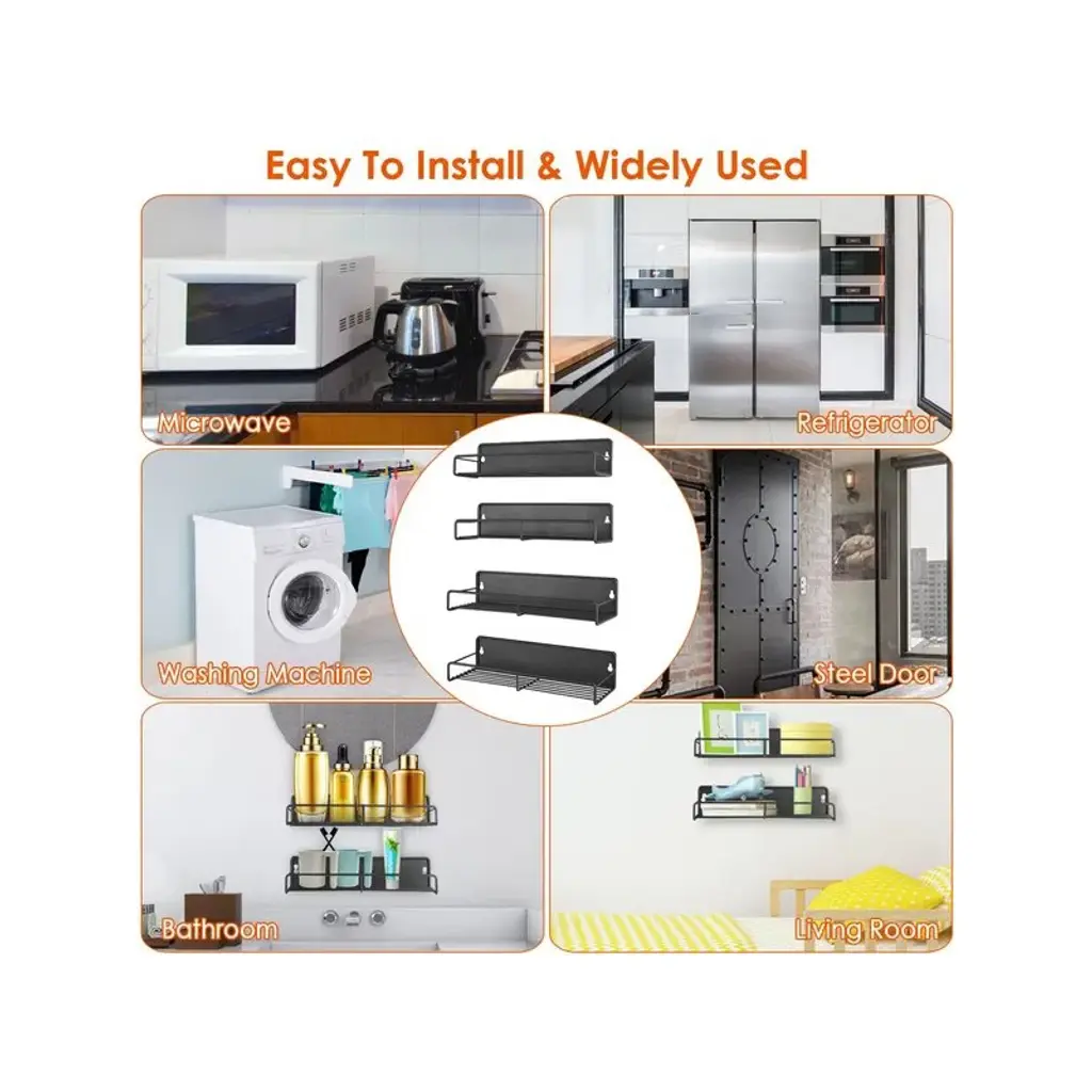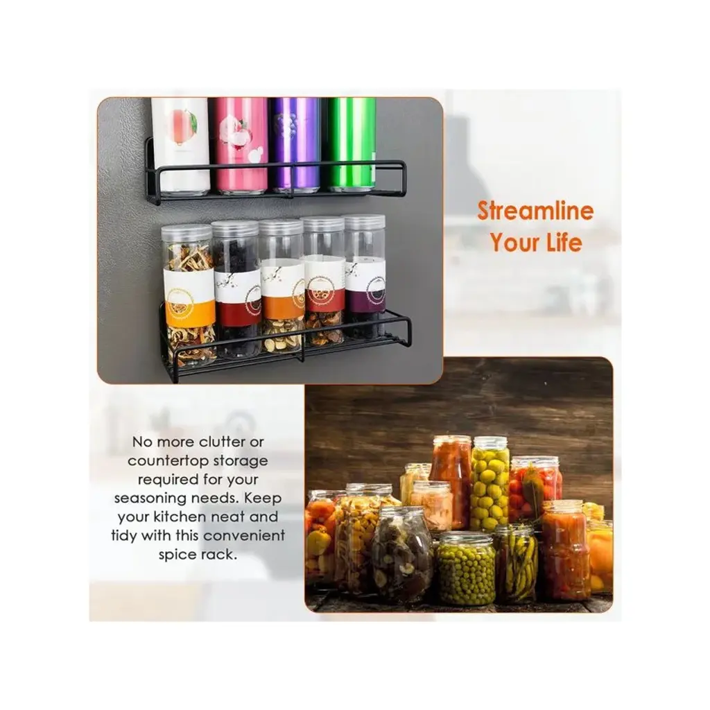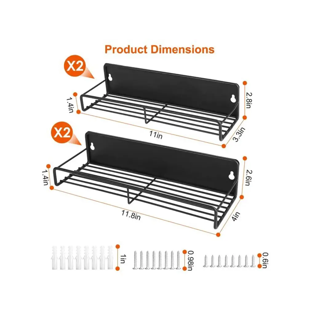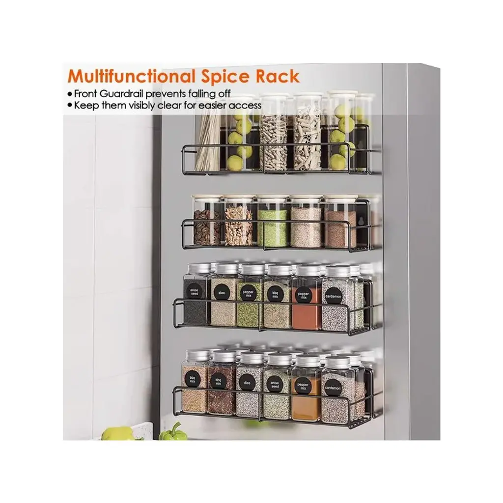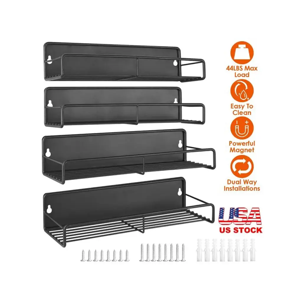 *Specifications*:? Product Type: Magnetic Spice Rack OrganizerQuantity:4 PcsMaterial: Carbon SteelColor: BlackMax Load For Each Shelf: 5kg/11lbs, Overall 44LBS Max LoadPer Small Rack Size: 28.5x8.5x7cm/11x3.3x2.8inPer Big Rack Size: 30x10.5x6.5cm/11.8x4x2.6in4 Racks Weight: 1791g/3.9lbsPackage Size: 31x13x9cm/12x5x3.5inPackage Weight: 1907g/4.2lbs*Package Lists*:2 x Big Racks2 x Small Racks8 x Screw Caps16 x ScrewsPerfect way to organize your spices and free up cabinet spaceThe super strong magnet ensures that your spices will be securely held in placeMade of carbon steel with a black painted finishEach rack bottom features hollow design, easier to wipe up stains when cleaning.Guardrail in the front effectively prevents spices jars from falling off the rack