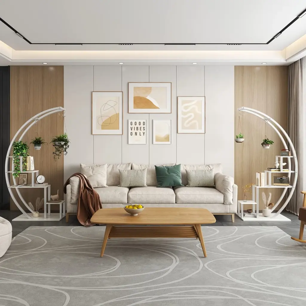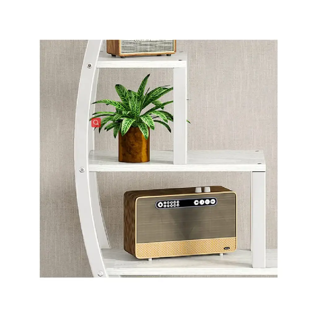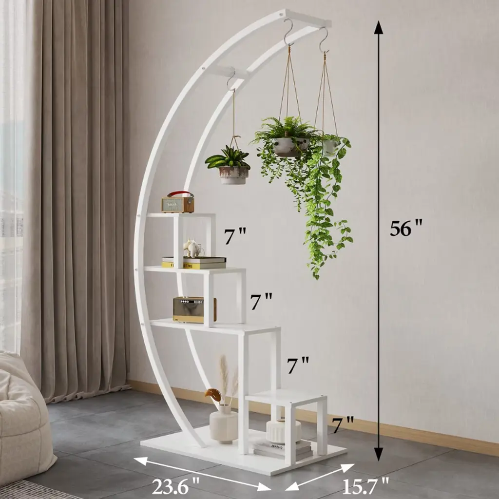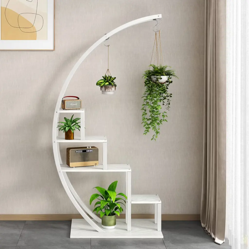 5 Tier Round Plant Stand - Metal Garden Plant Holder Half Moon Flower Shelf Rack With 4 Hanging Hooks Stylish Tiered Flower Rack Indoor Plant Stand for Home Balcony Living Room Garden Decor
