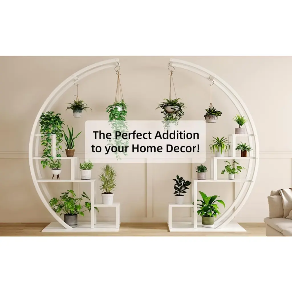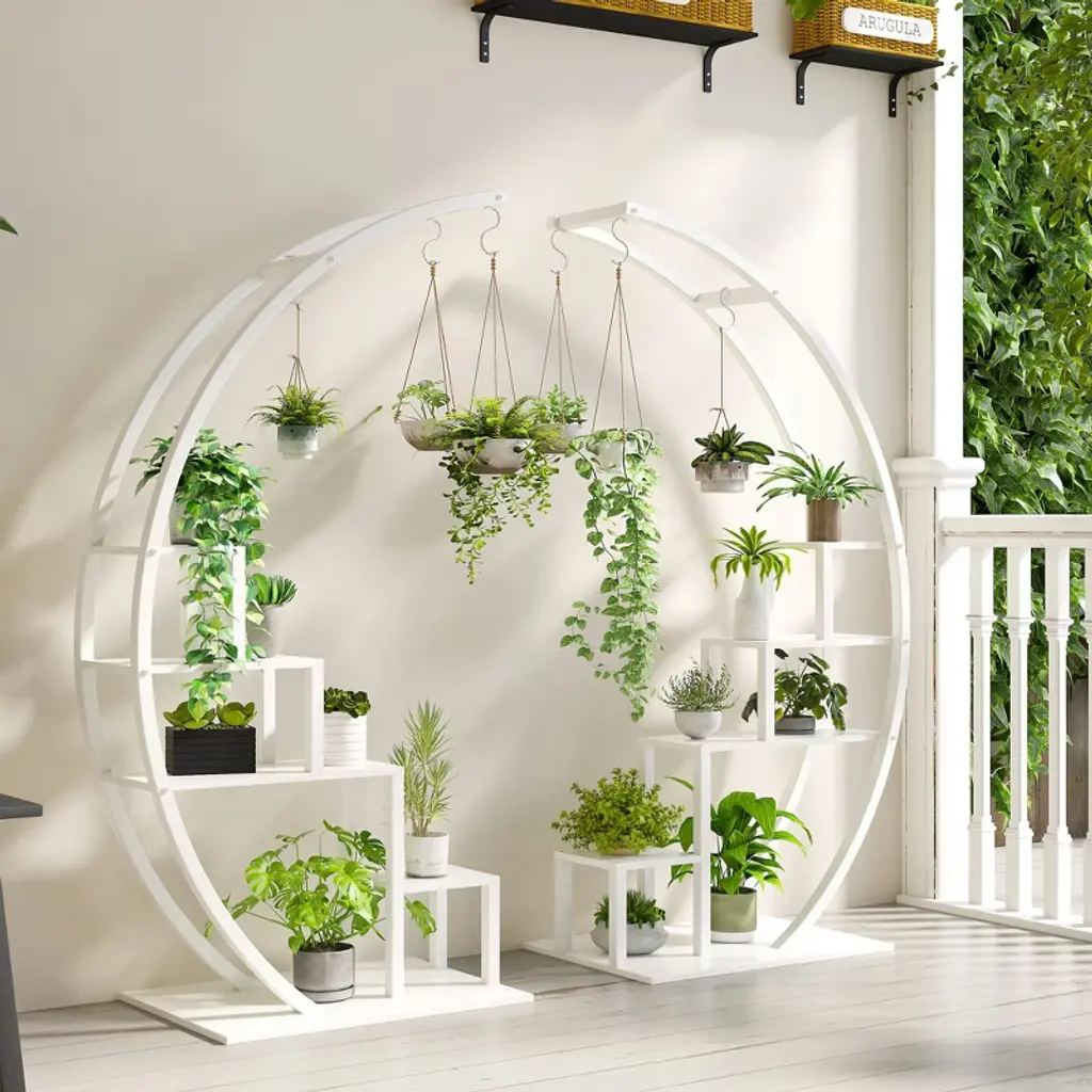 5 Tier Round Plant Stand - Metal Garden Plant Holder Half Moon Flower Shelf Rack With 4 Hanging Hooks